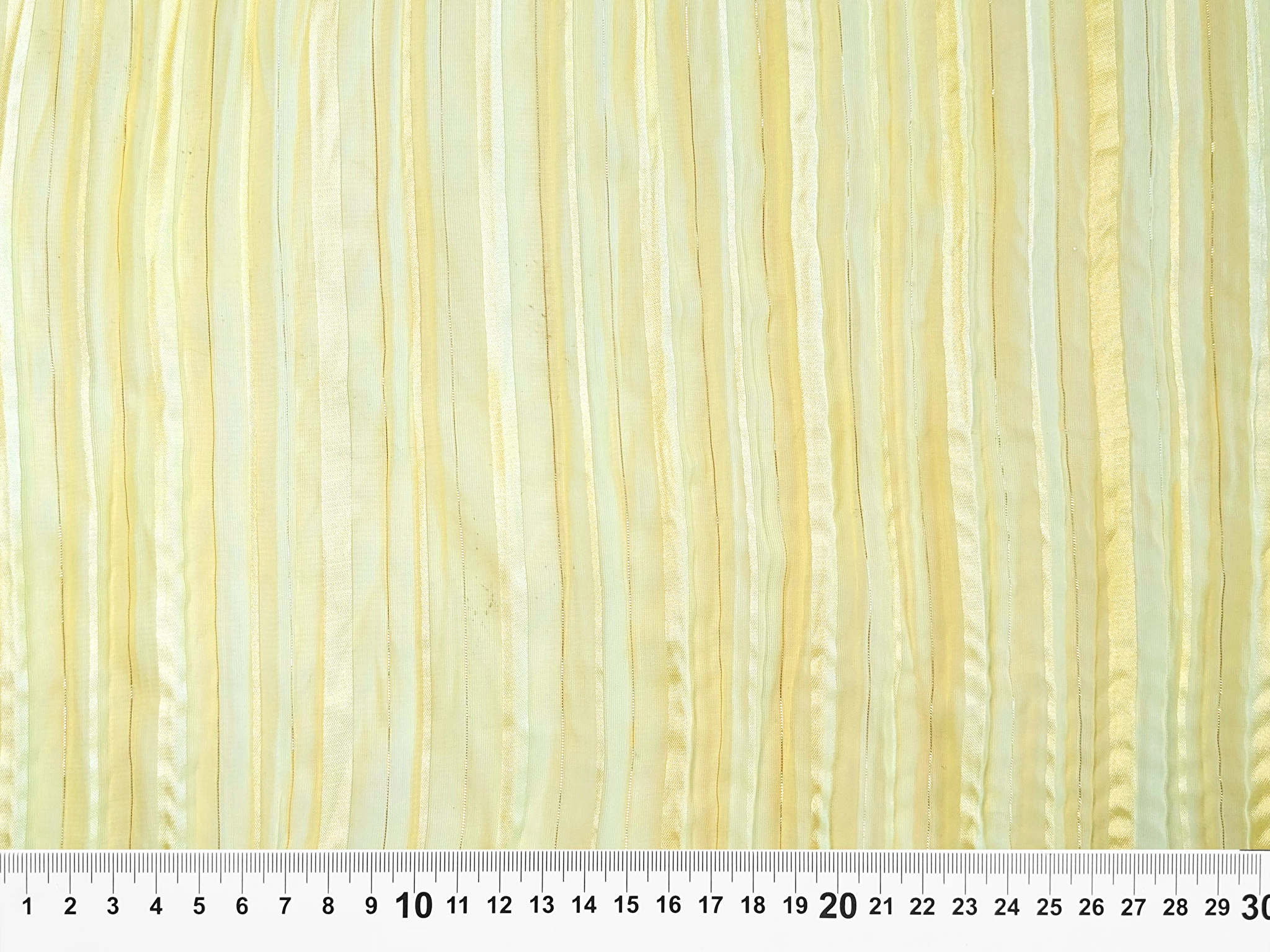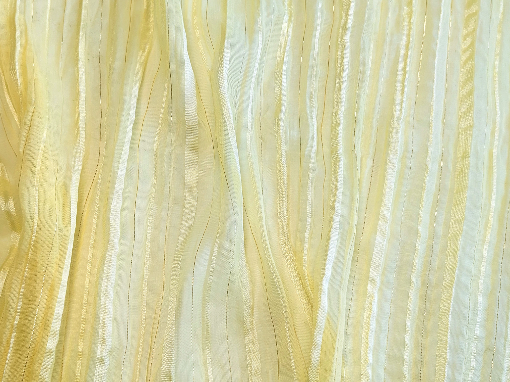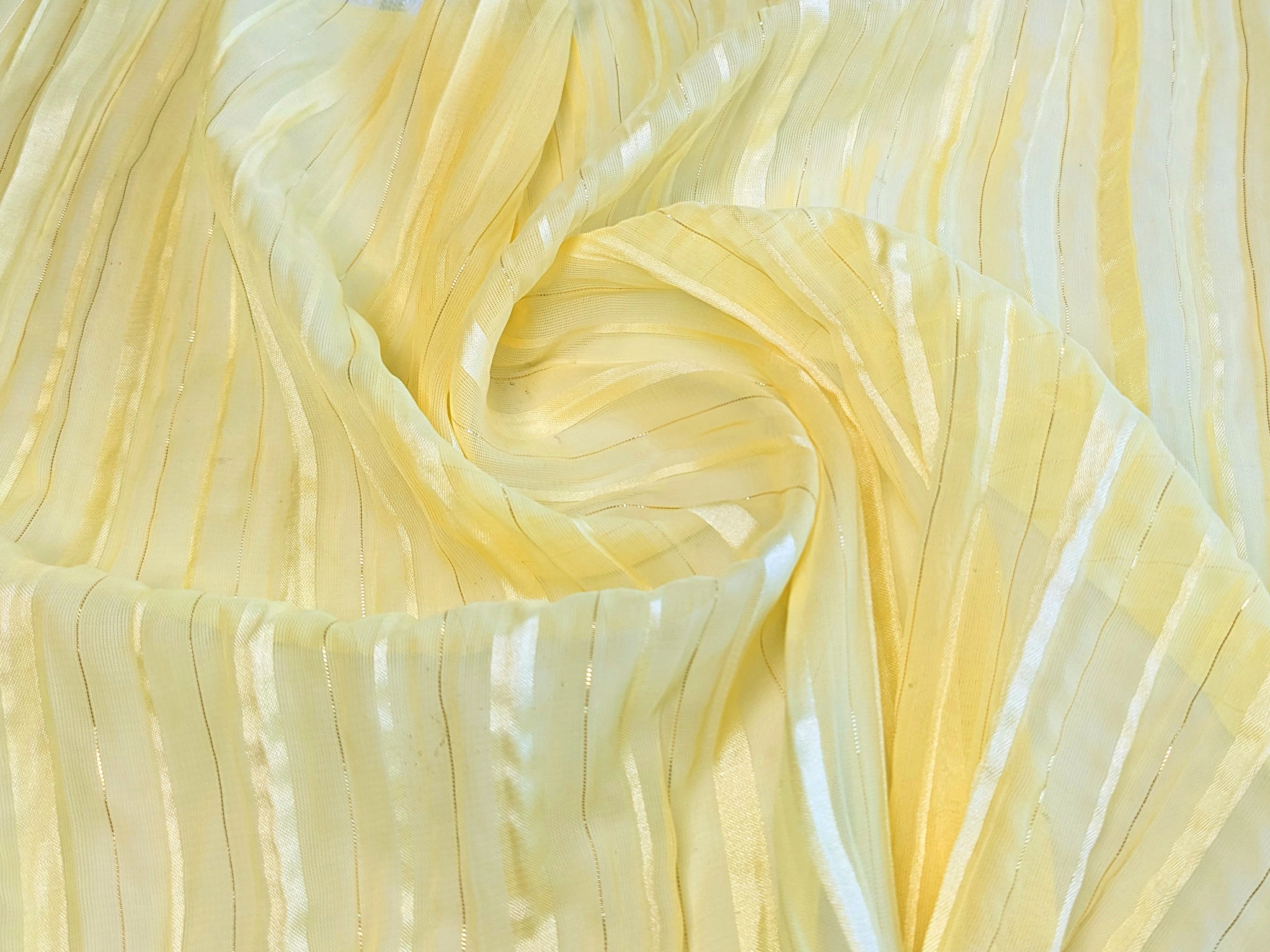 Шифон с люрексом - легкий, тонкий, полупрозрачный материал с поджатой структурой. Люрексовые нити вплетены в структуру полотна, лицевую сторону украшают тонкие атласные полоски. Полотно не мнется, не тянется, просвечивает. Для пошива некоторых изделий требуется подкладочная ткань.
