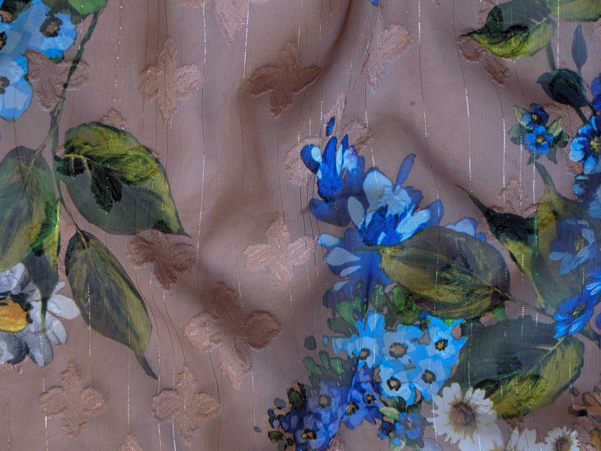Шифон ассоциируется с легкостью, нежностью и теплым временем года. Из шифона шьют блузы, платья, сарафаны, юбки и накидки. На данном жакардовом шифоне нанесен нежный цветочный принт и люрексовая полоска, которая добавляет легкое сияние. По всему полю присутствует дополнительный цветочный узор в цвет полотна, который уплотняет структуру ткани делая ее более формоустойчивой. Ткань практически не мнется, полупрозрачная и очень легкая. Для многих изделий из шифона вам понадобится подкладка, которую вы можете приобрести в комплекте с шифоном на нашем сайте.