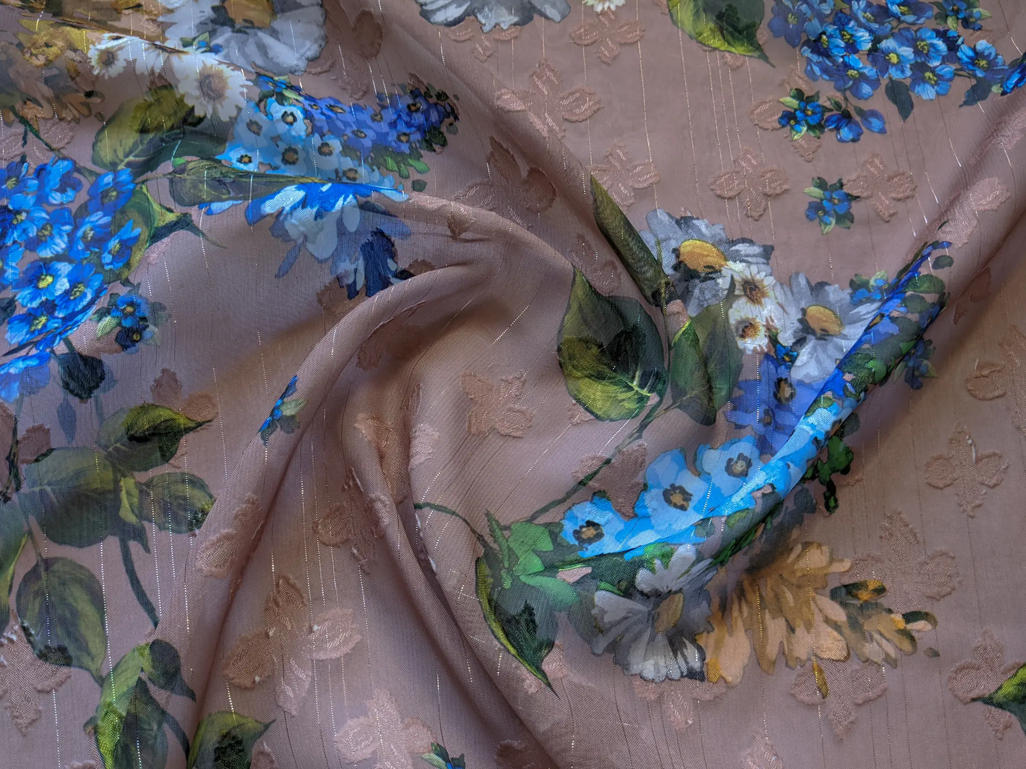 Шифон жаккард с люрексом яркие цветы, синий на коричневом (отрез 1,7 м)