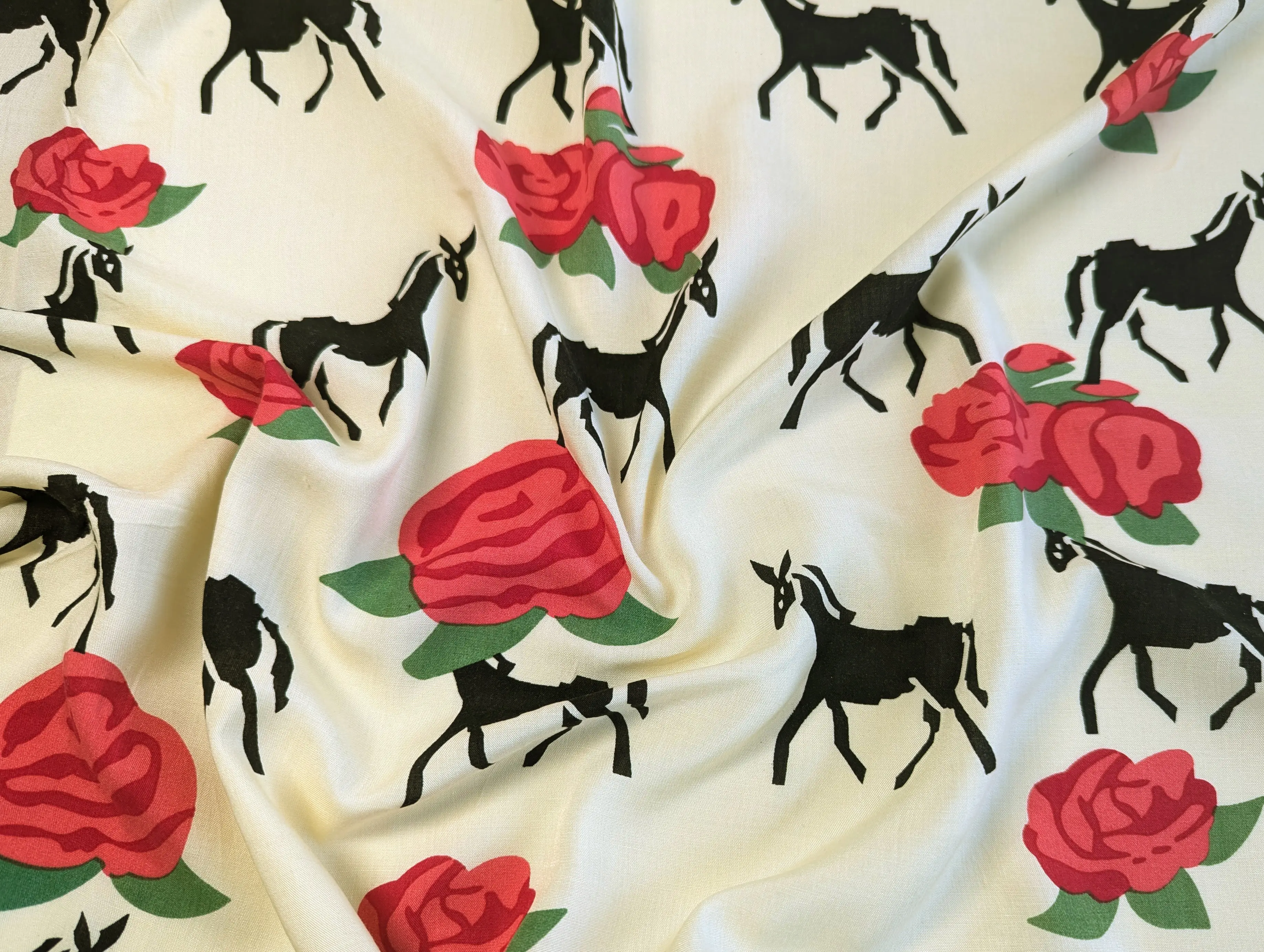 Штапель имеет плотное плетение, но сама ткань тонкая, легкая и отлично драпируется. Ткань приятная на ощупь, гладкая. Ткань пропускает воздух, не вызывает аллергии, износоустойчивая и легкая в уходе. Штапель немного мнется и легко разглаживается. Ткань не тянется, но может давать усадку, поэтому перед тем как начать кроить изделие рекомендуем его постирать и прогладить.