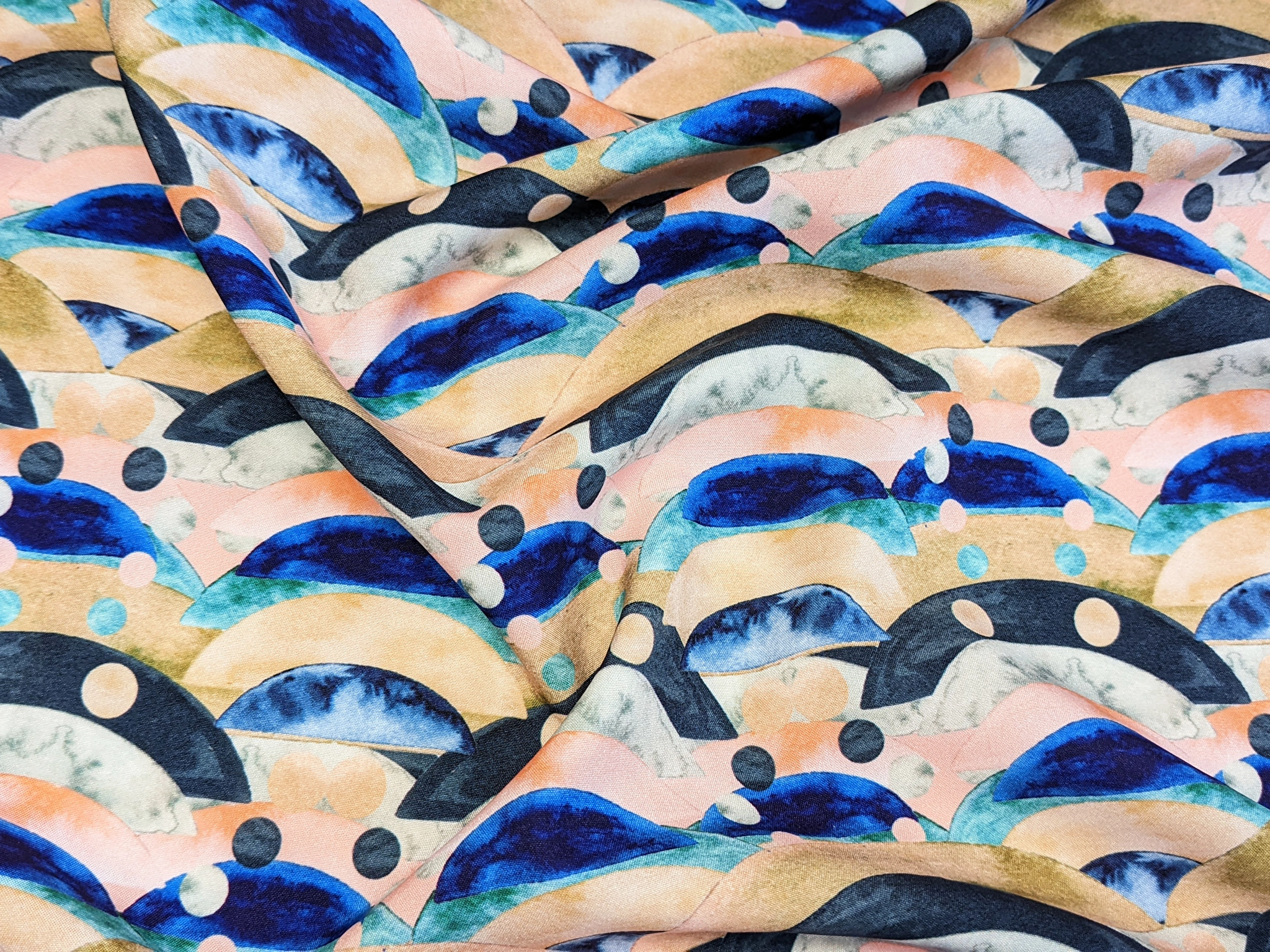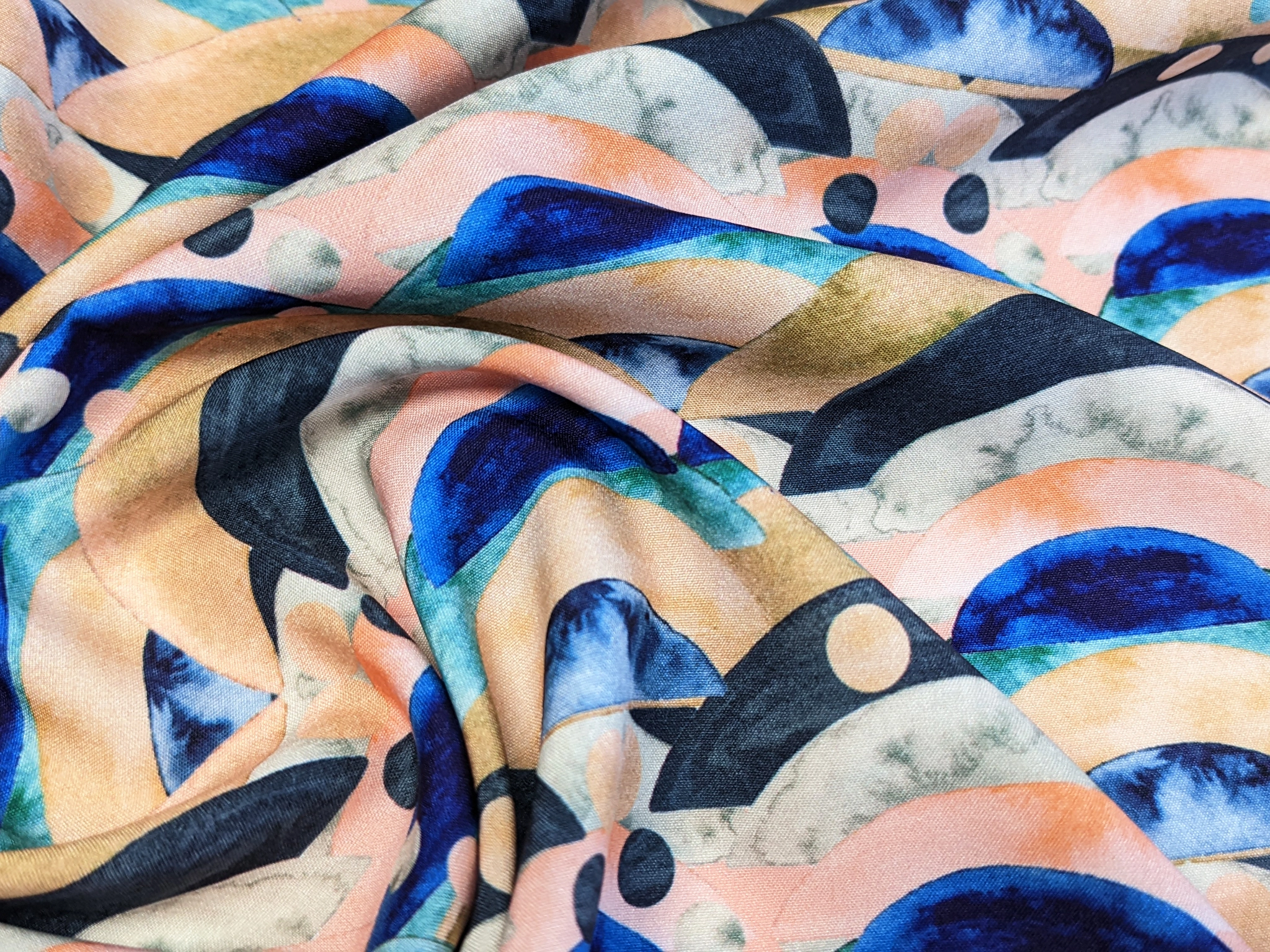 Софт принт – это гладкое, легкое и приятное на ощупь полотно. В составе присутствует спандекс, благодаря которому софт немного тянется по одной стороне. Ткань слегка просвечиваются на свету, она не капризна в уходе, практически не сминается. Полотно красиво драпируется.