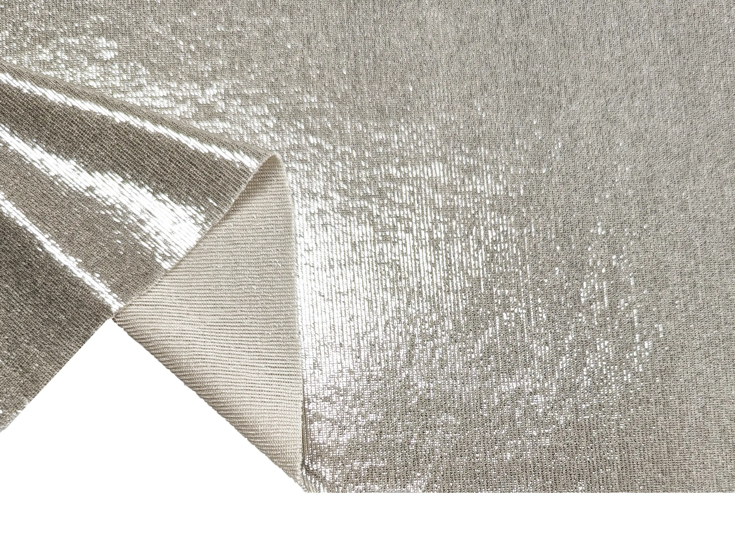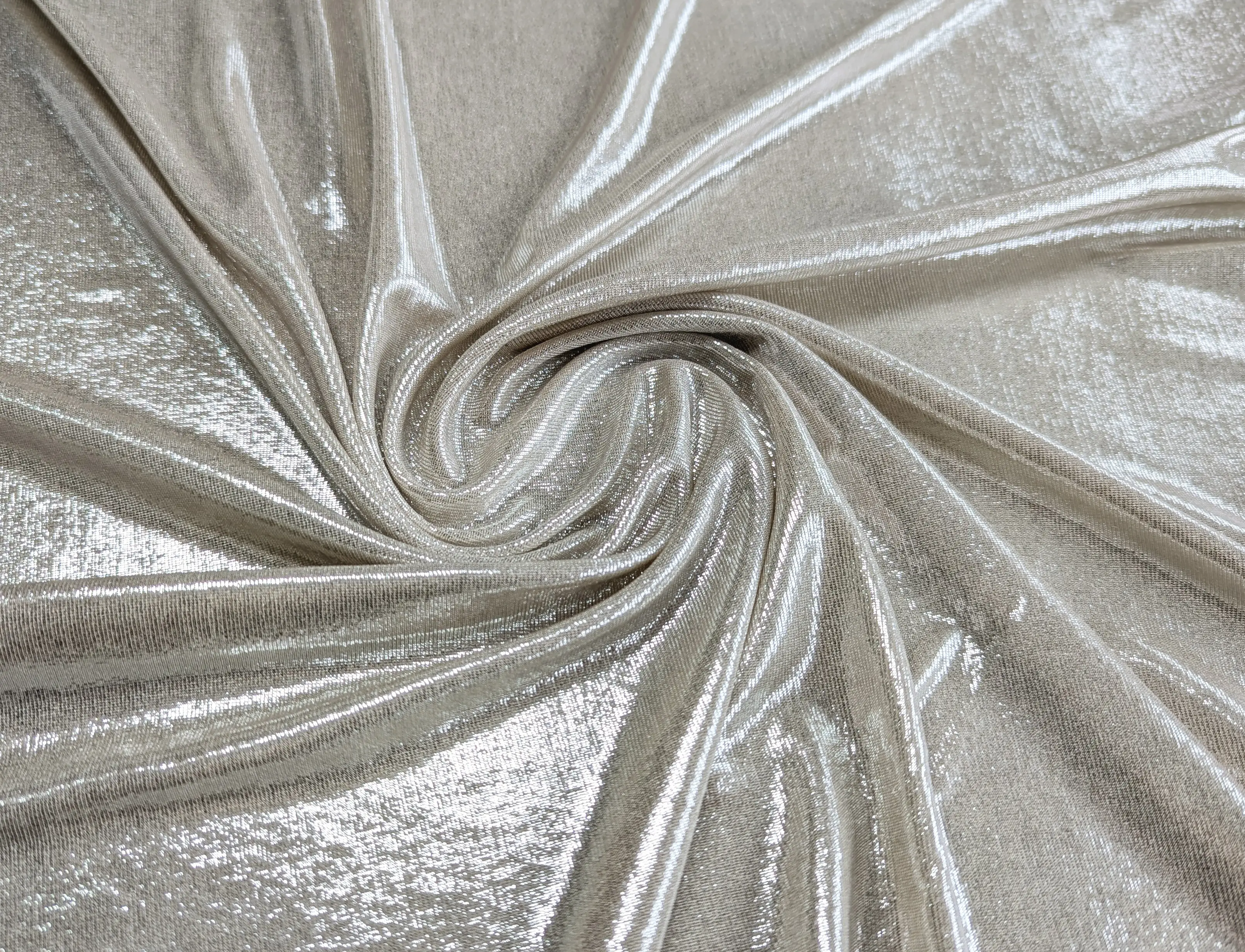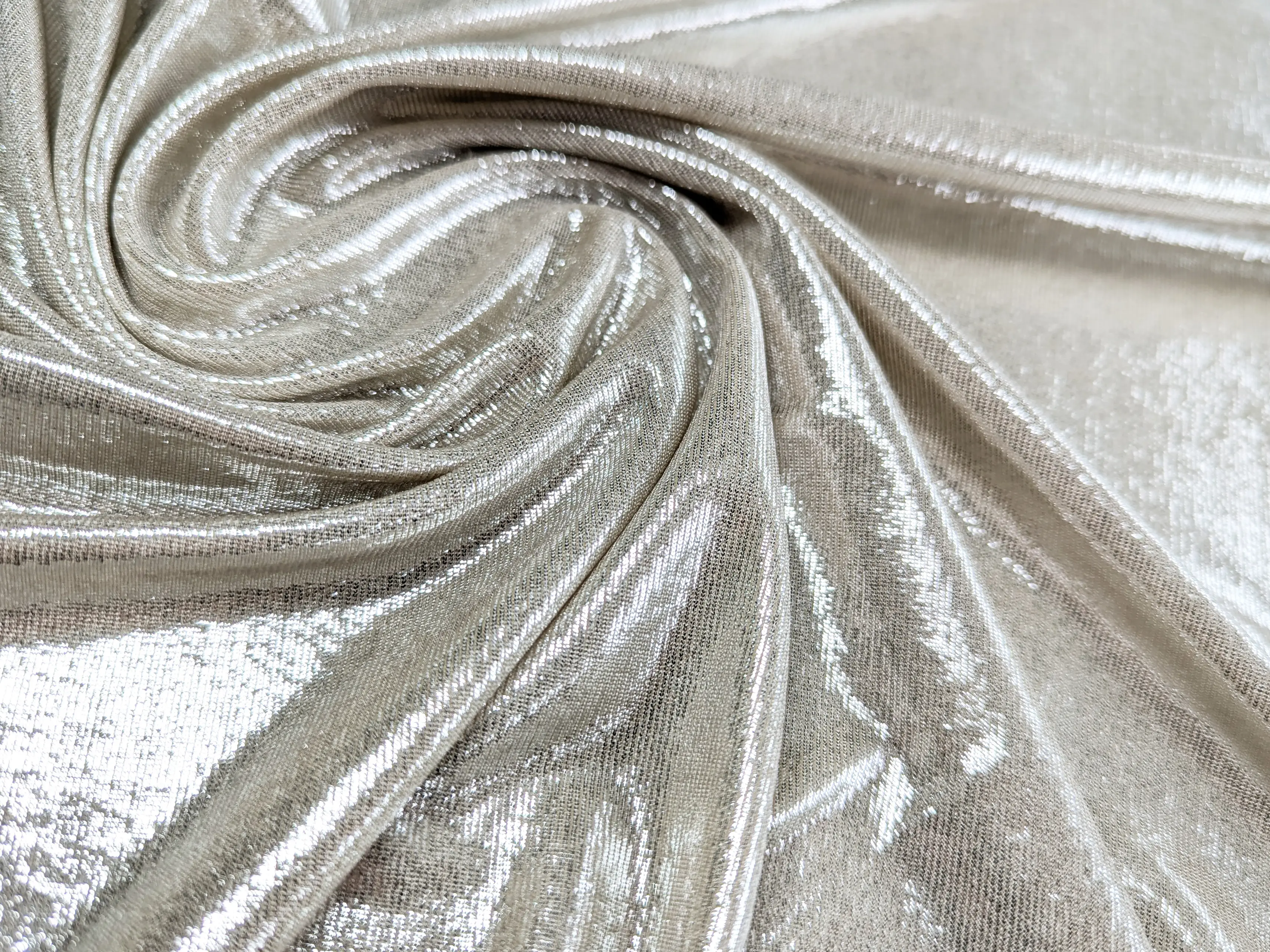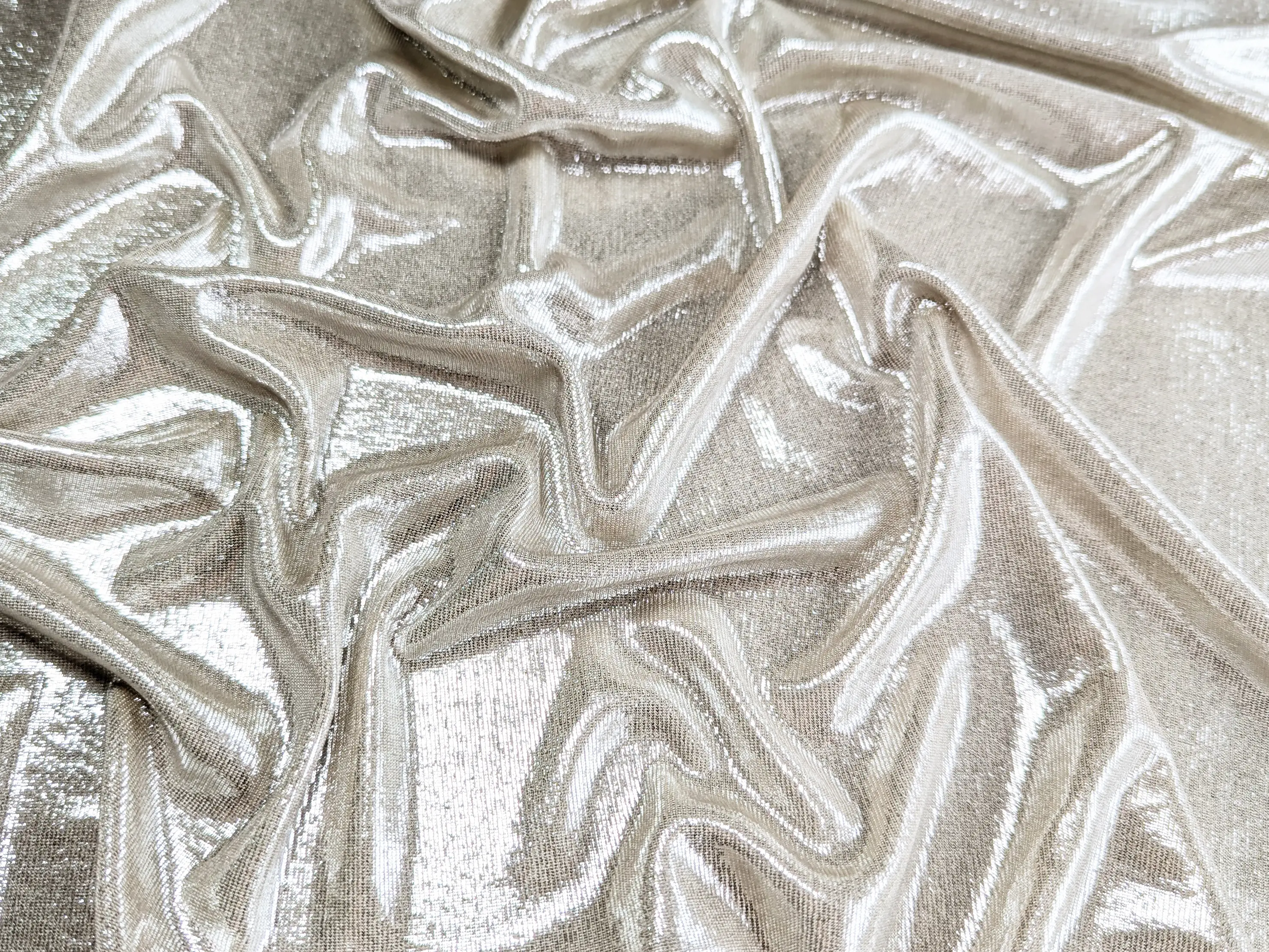 Трикотаж ликра зеркальный, серебро на светло-бежевом