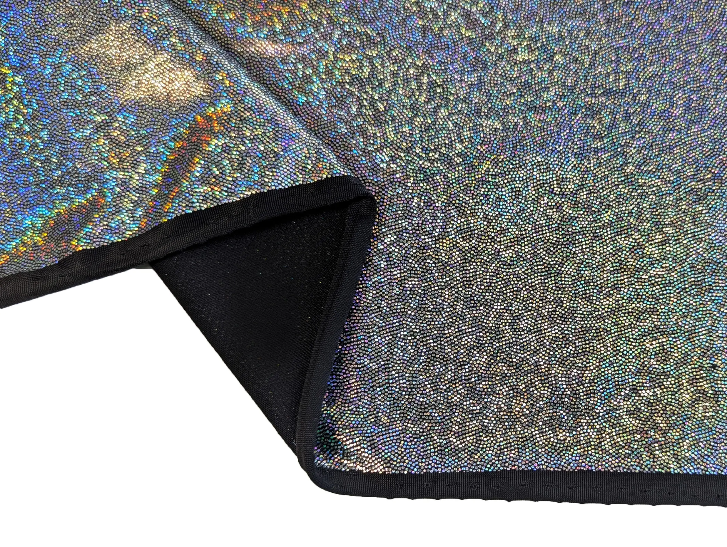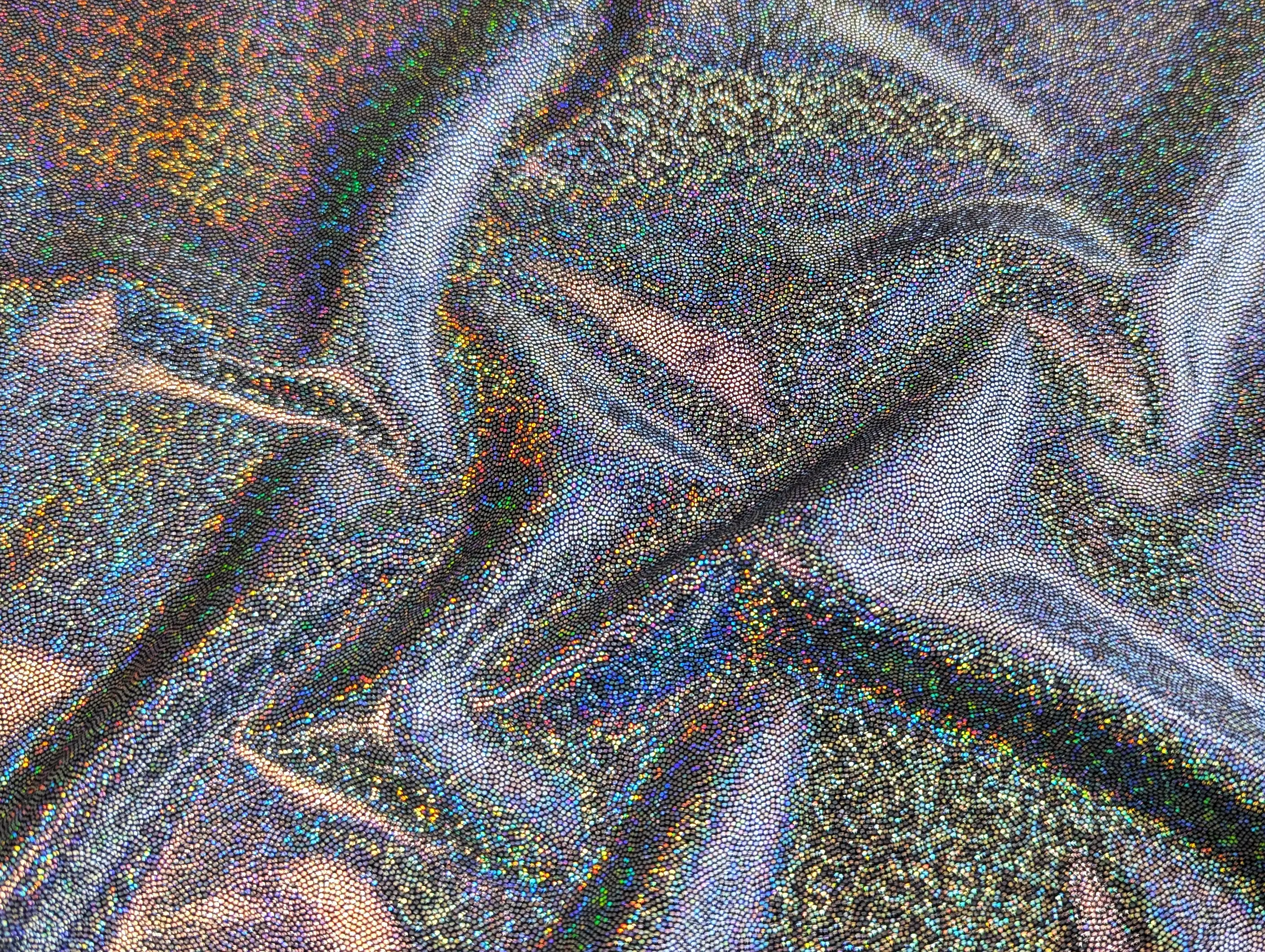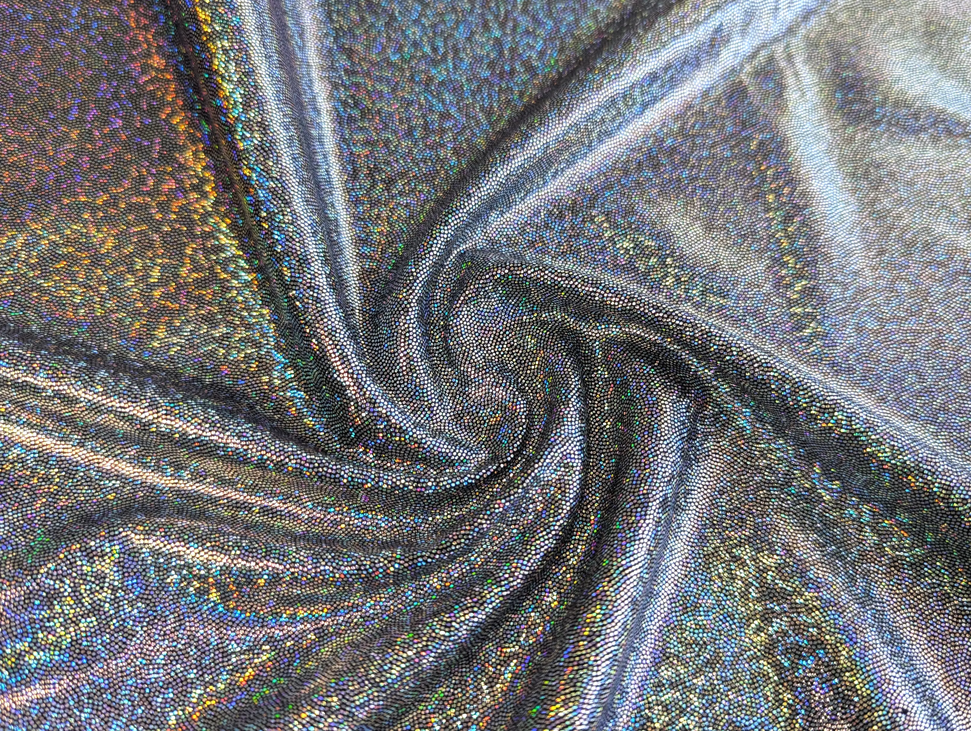 Трикотаж масло нарядное точечная голограмма радужная, серебро на черном (отрез 1 м)
