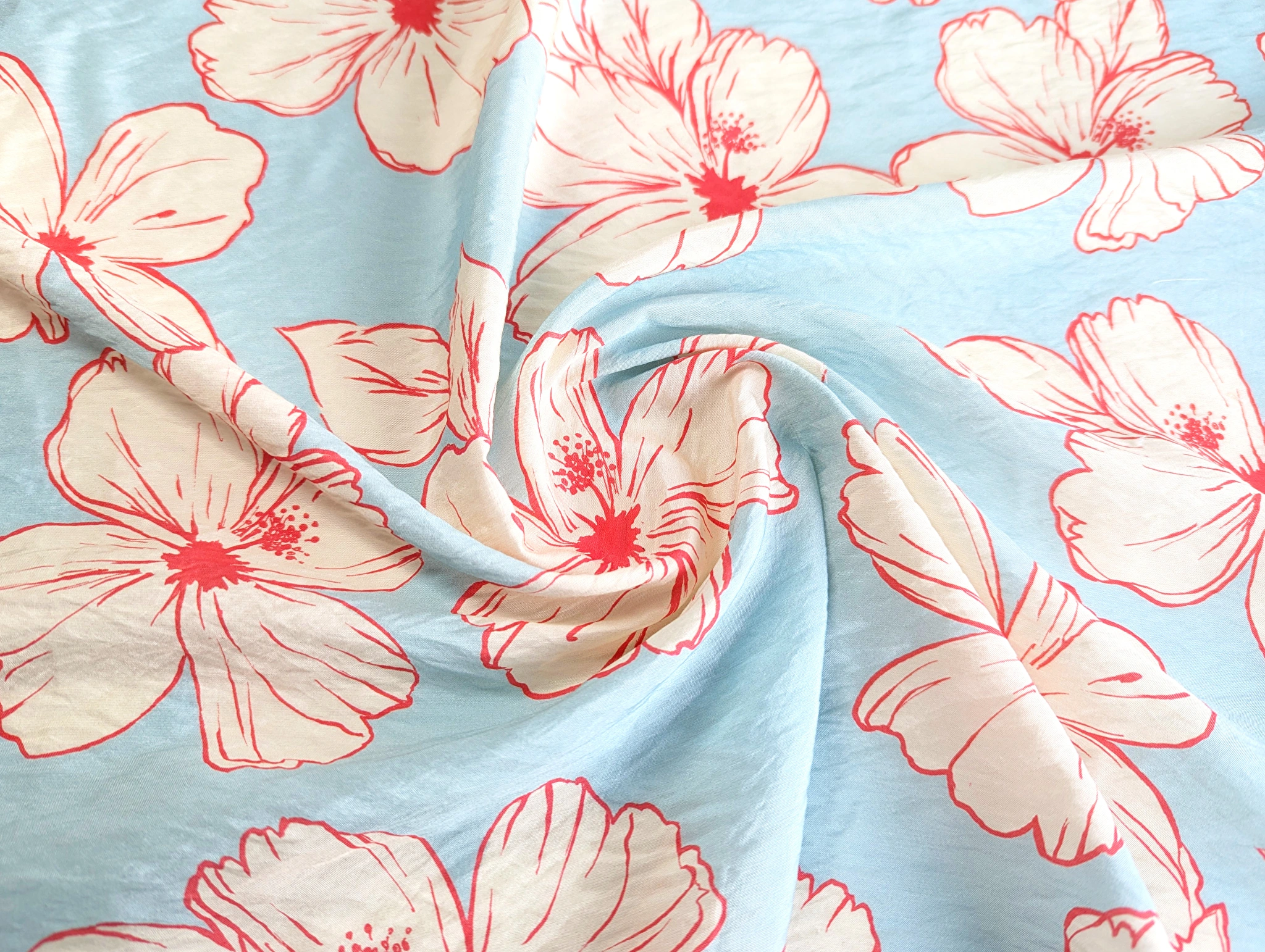 Віскоза шовк Бохо - тонкий, невагомий матеріал з ледь помітною жатою текстурою. Тканина тактильно приємна, легка і повітряна, поєднує в собі ніжність шовковистої структури і вишуканість штапеля. При драпіруванні лягає в м'які, повітряні волани і складки. Має легкий силуетний просвіт, не тягнеться, завдяки нануральному складу злегка зминається, пропускає повітря, не парить, дає відчуття прохолоди в спекотну погоду.