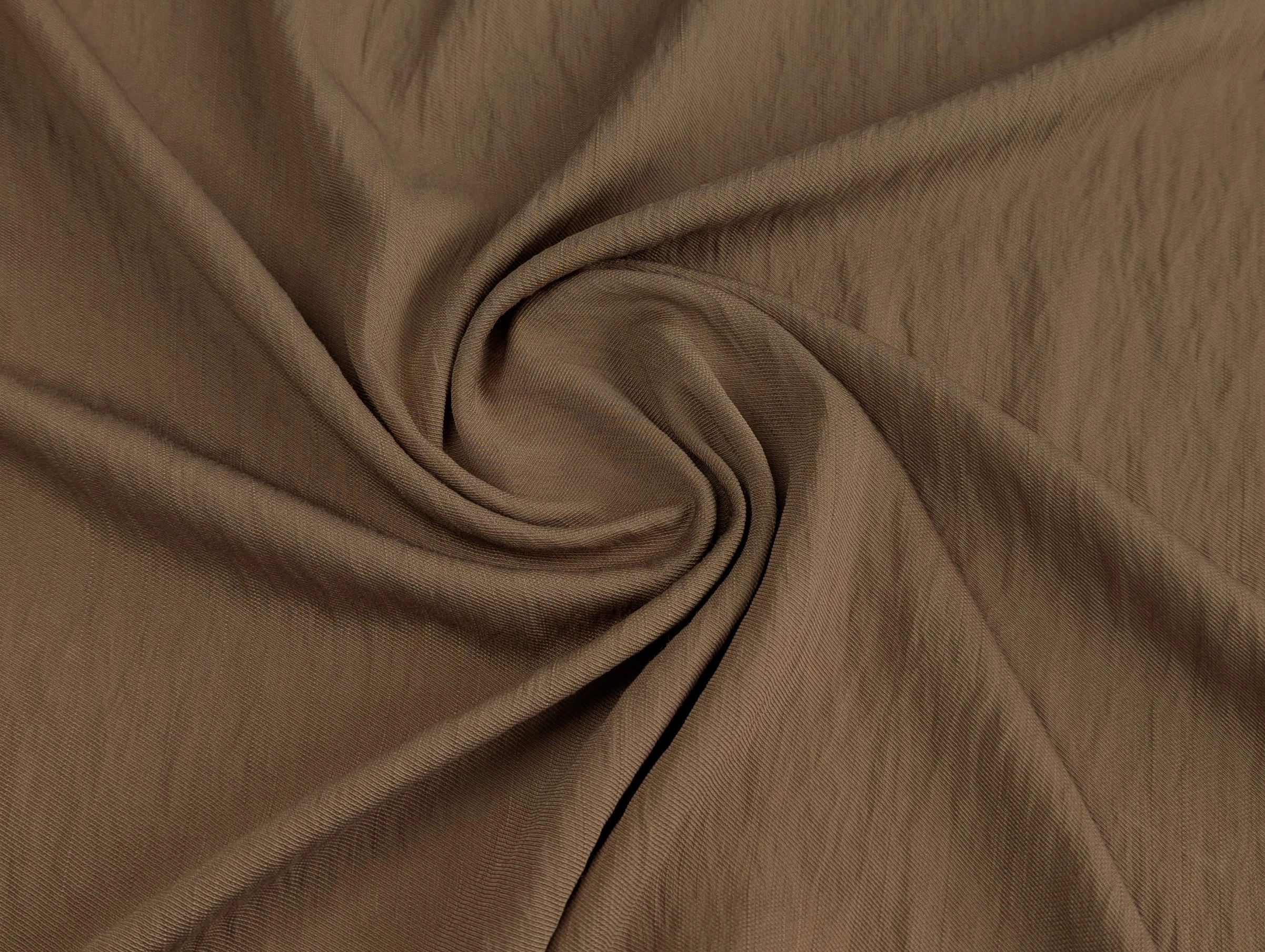 Вискоза твил - легкий, приятный на ощупь материал с твиловым переплетением нитей и текстурированным эффектом жатки. В составе полотна вискоза и нейлон, что обеспечивает ткани шелковистость, мягость, воздухопроницаемость и прочность. Ткань имеет легкий силуэтный просвет, при драпировке ложится в мягкие складки, за счет содержания натуральных волокон - сминается, не тянется. Поверхность ткани имеет незначительные естественные уплотнения в виде штрихов.