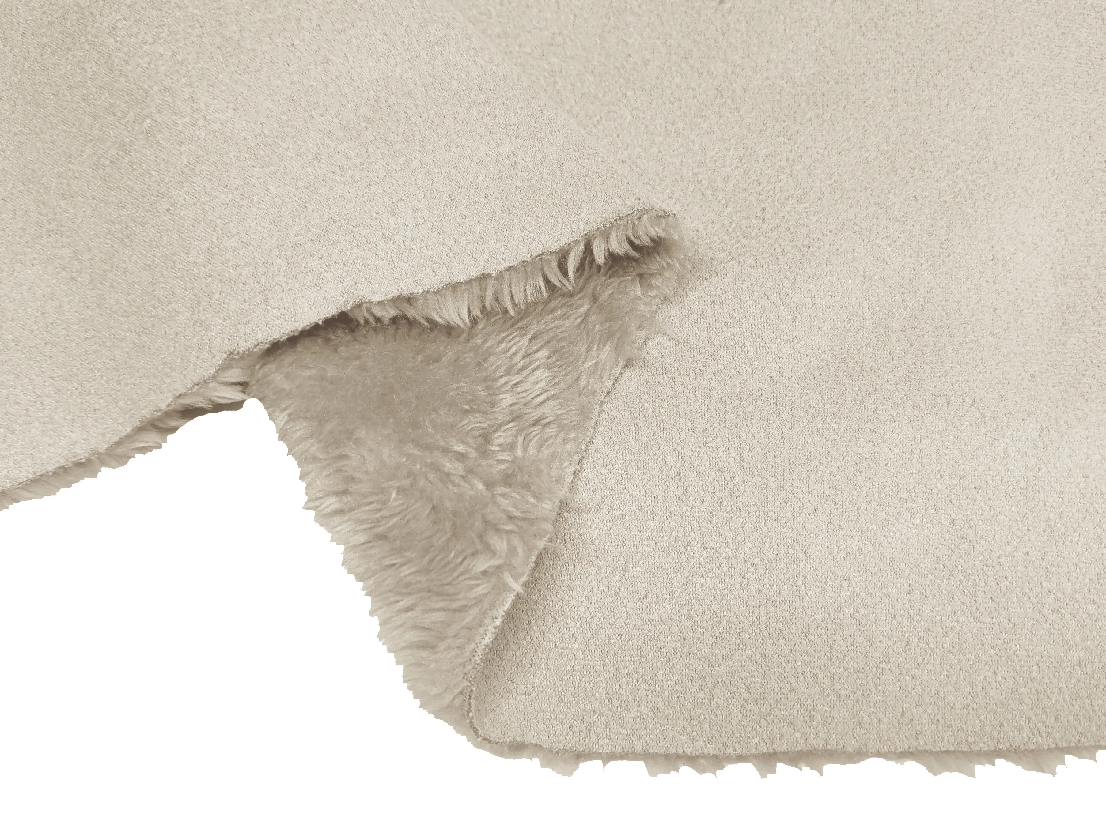 Замша на вельбо - двостороннє полотно з теплим хутром на одній стороні та гладкою, бархатистою основою із замши з іншого боку. Тканина дуже м'яка, приємна до тіла. Замша не мнеться, трохи еластична по ширині, м'яко драпірується в складки. Полотно тепле та зносостійке.