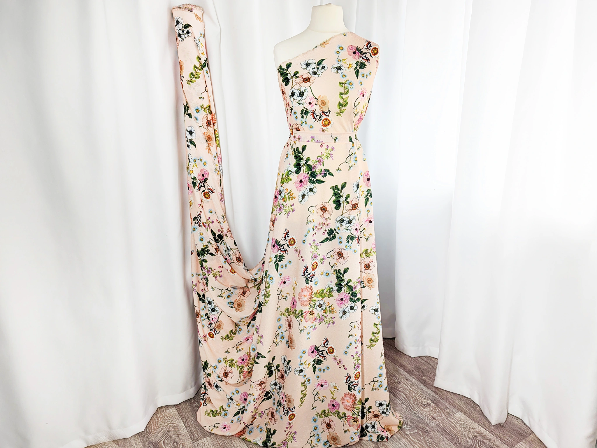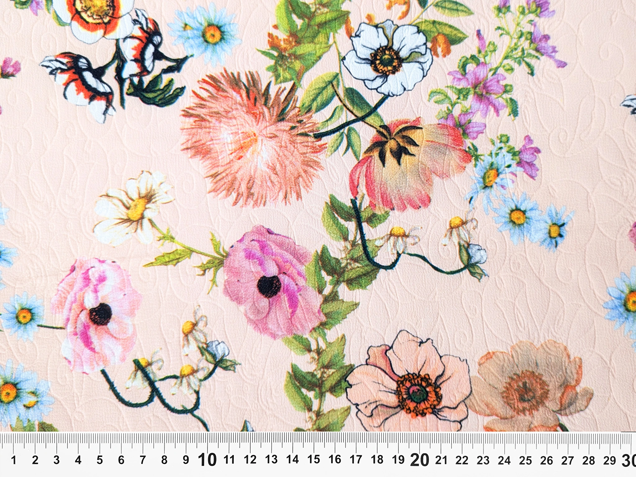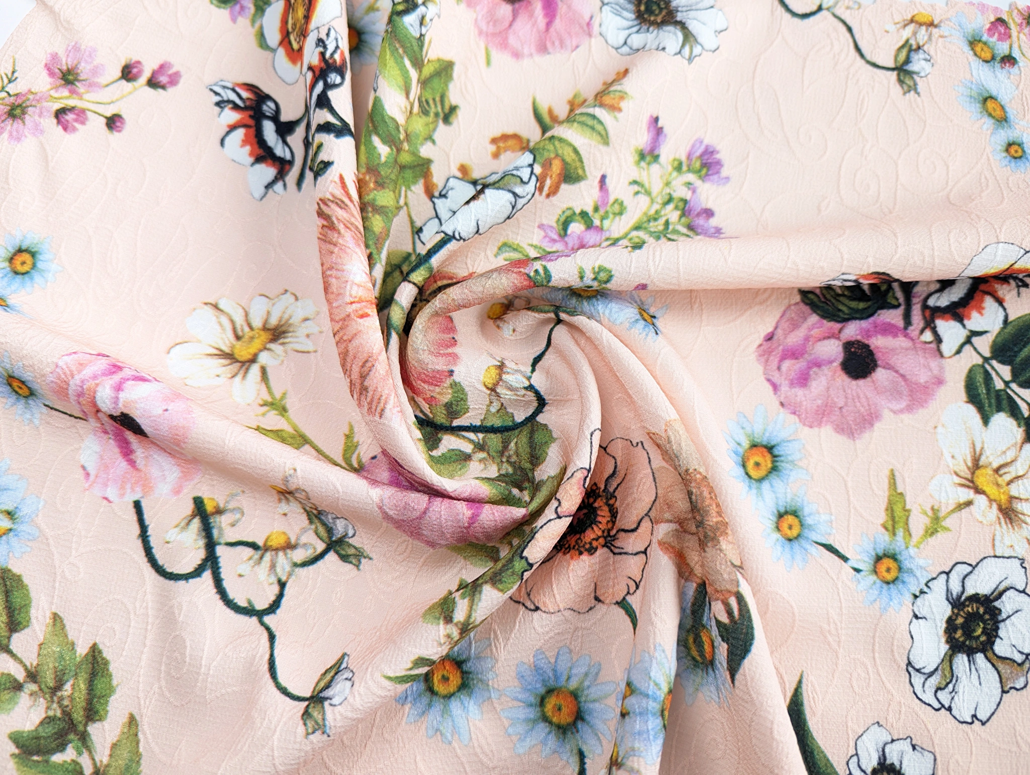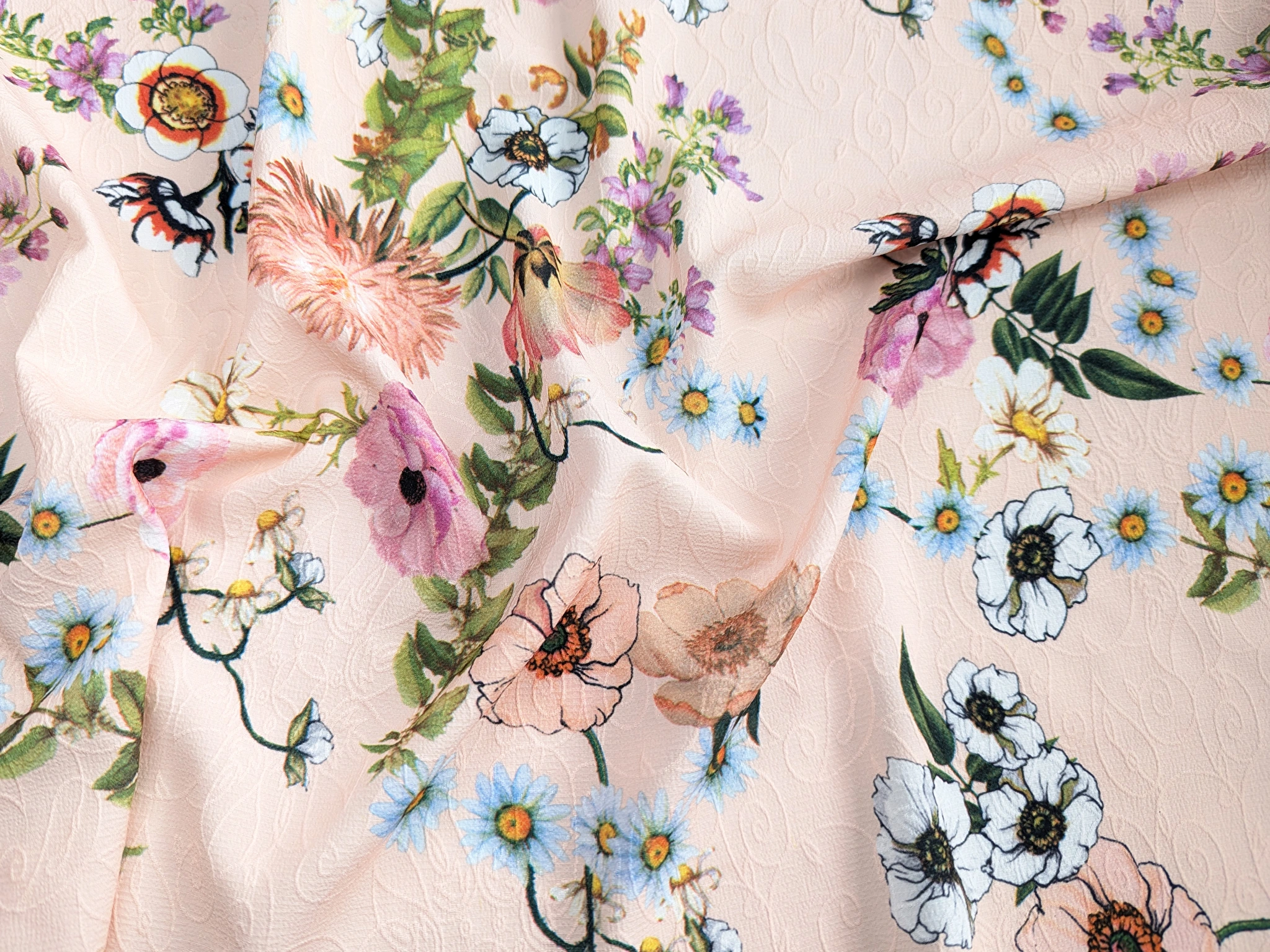 Тонкая креповая ткань с фактурным жаккардовым узором и цветочным принтом - это полотно идеально подходящее для пошива нарядных платьев, сарафанов и костюмов весенне-летнего сезона.