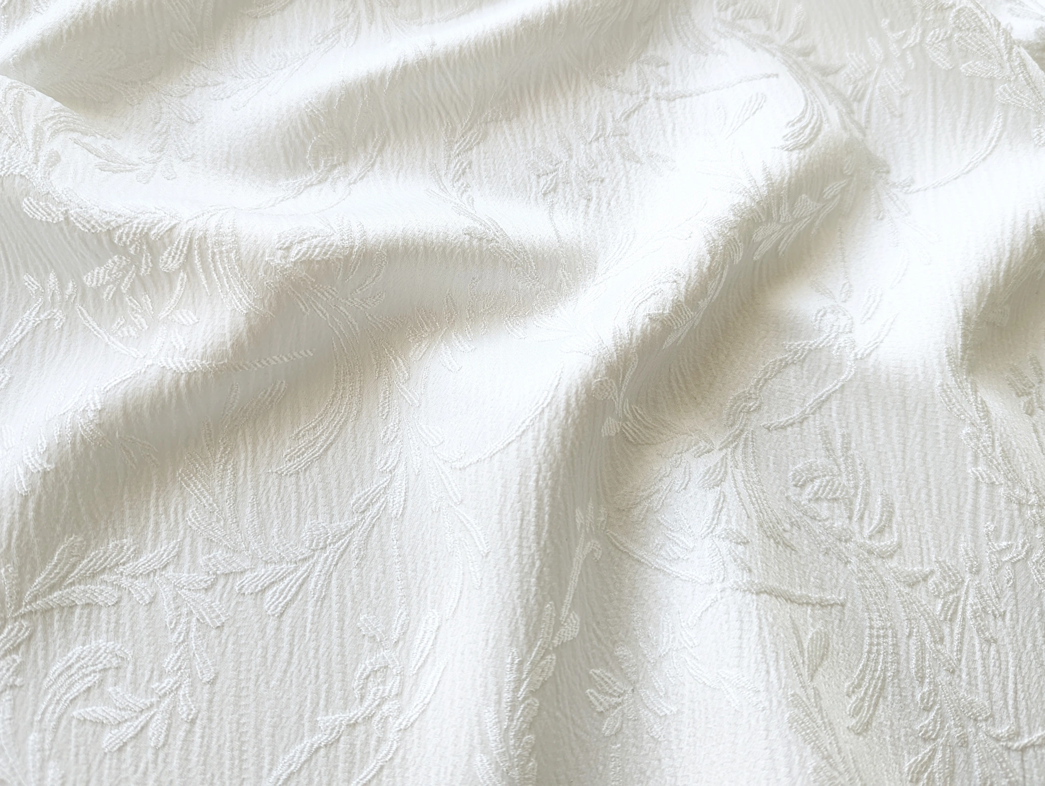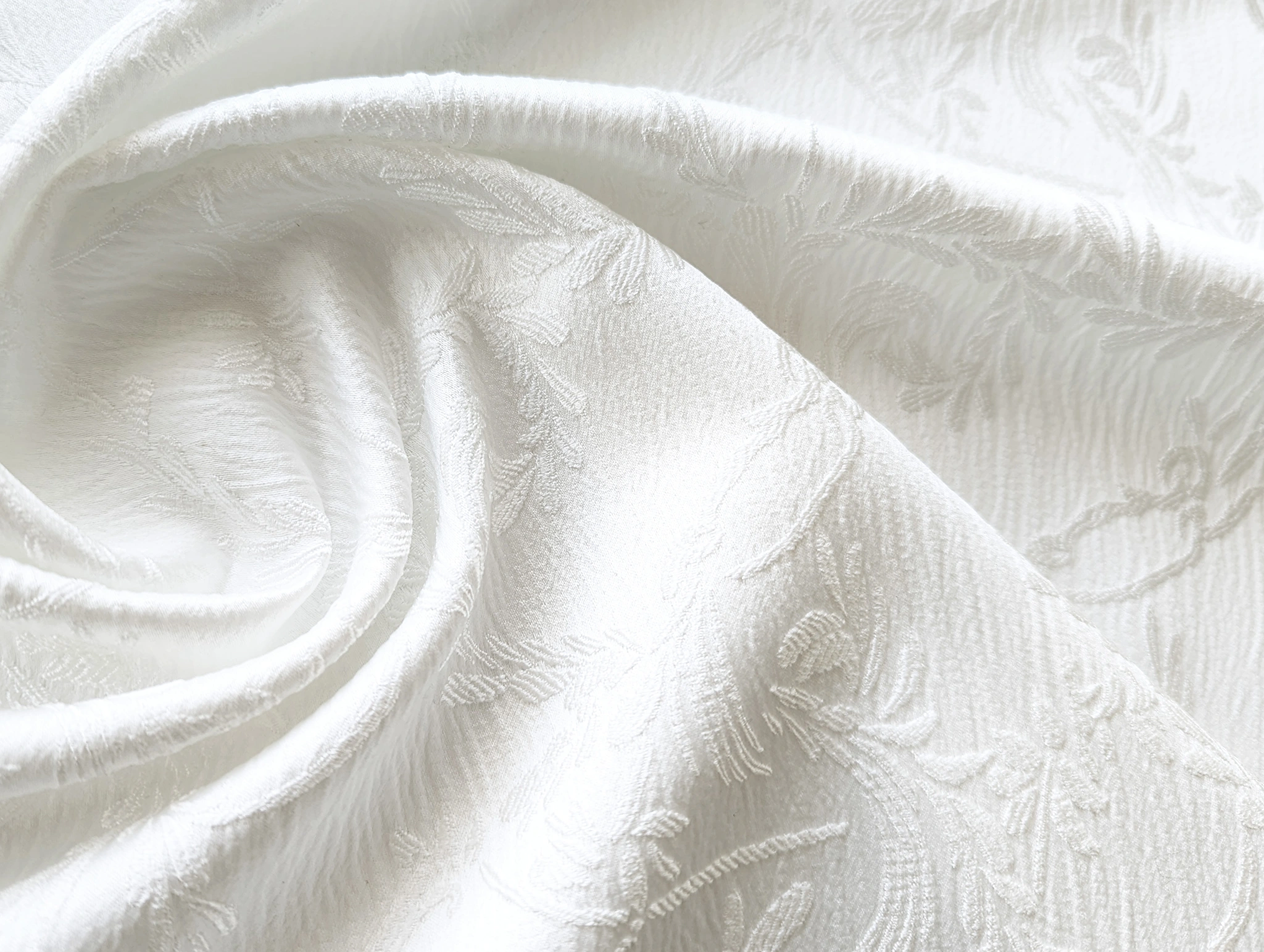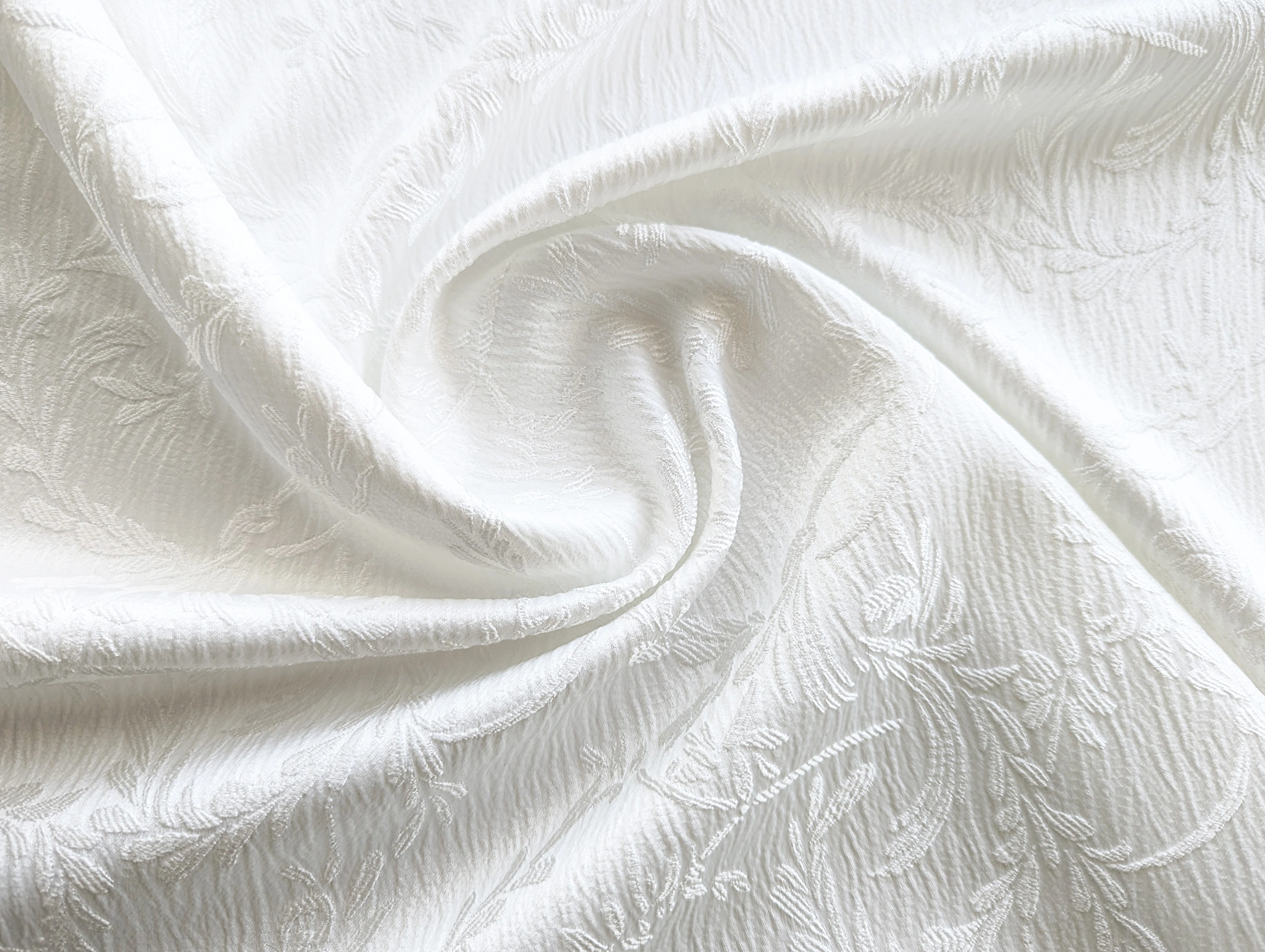 Код: ж27, 2410073, д1, к1Жаккард креш – это ткань с атласным блеском, слегка поджатой структурой и жаккардовым плетением нитей формирующими фактурный рисунок на лицевой стороне. Поджатая структура сформирована легкими заломами на лицевой стороне вдоль кромки, что нужно учесть при раскрое изделия и стачивании деталей.