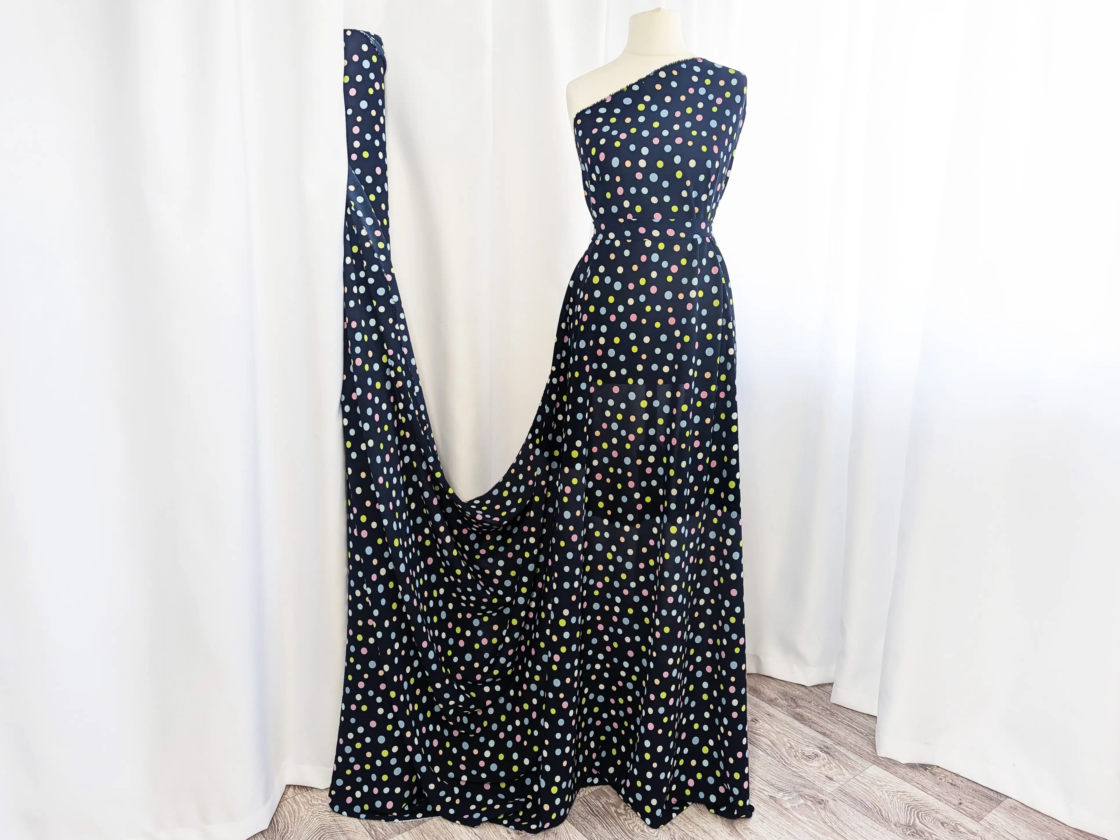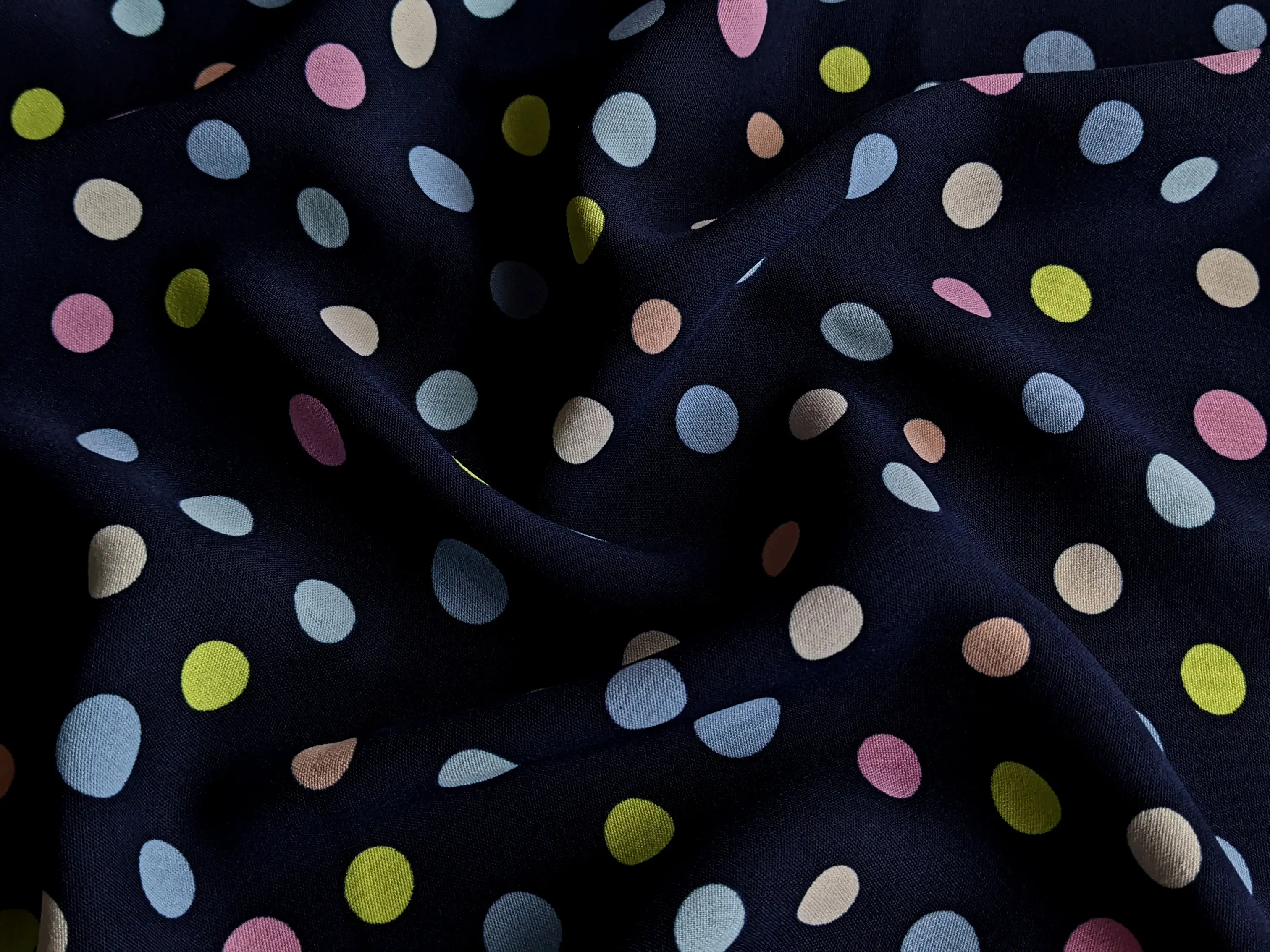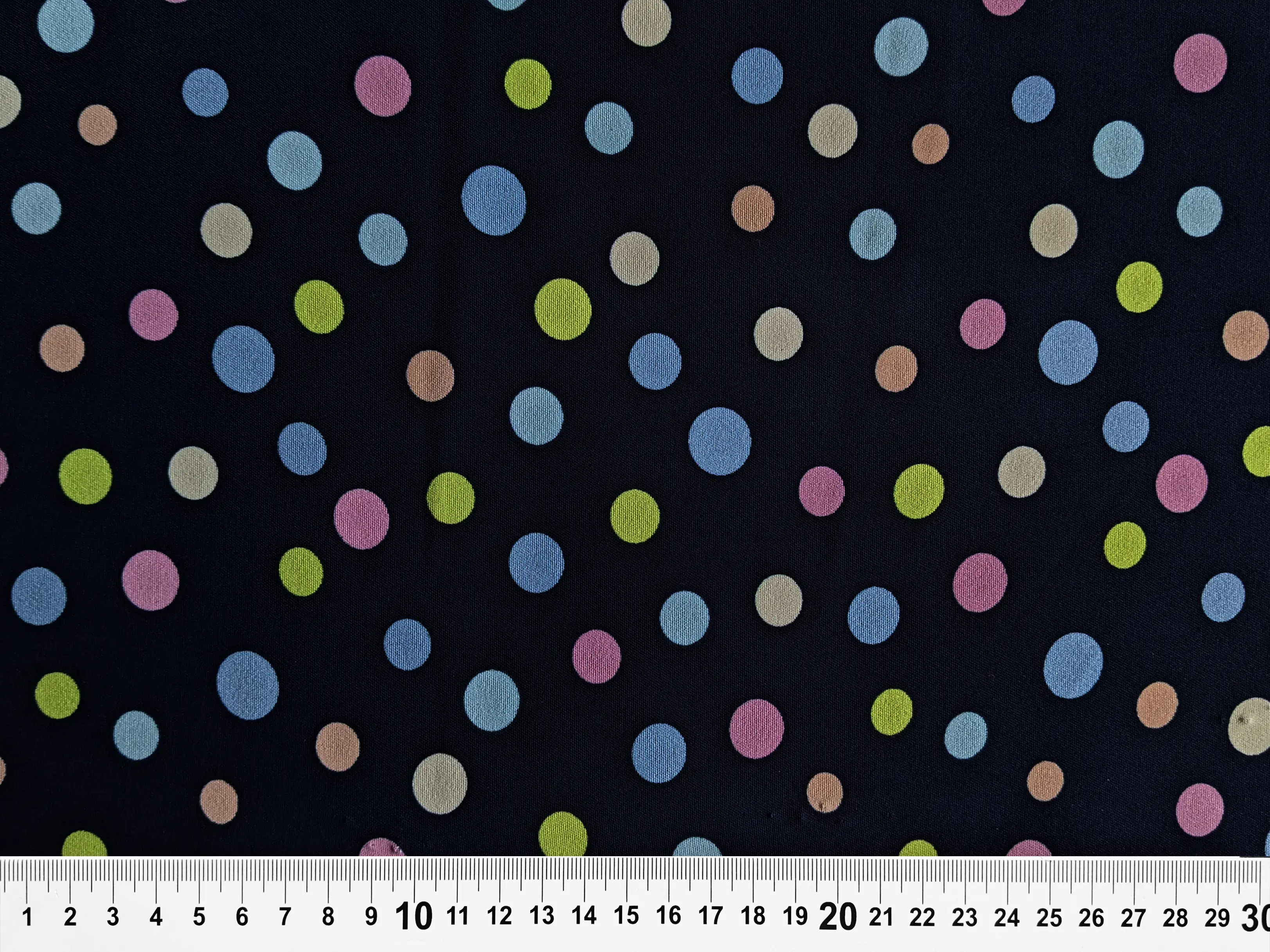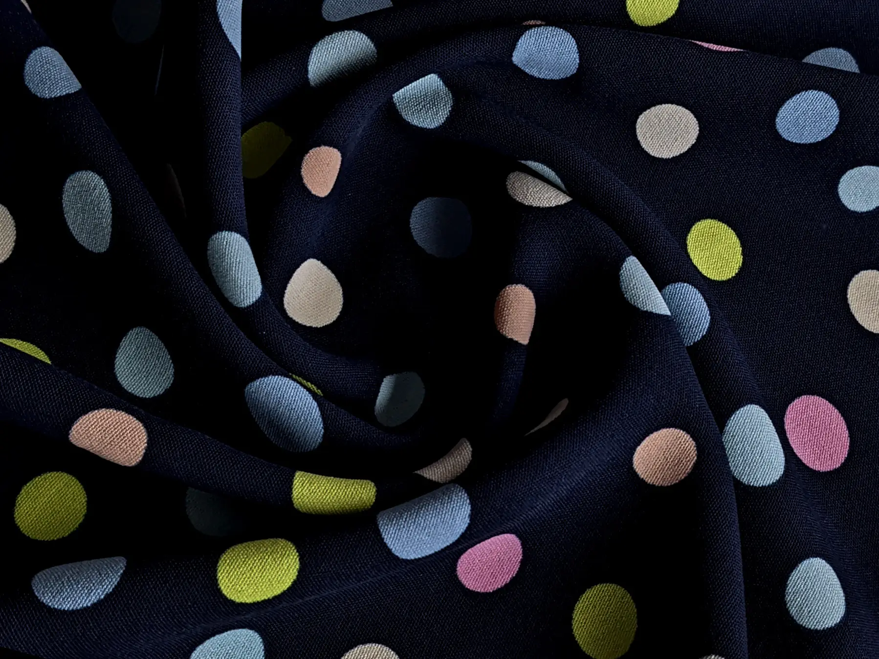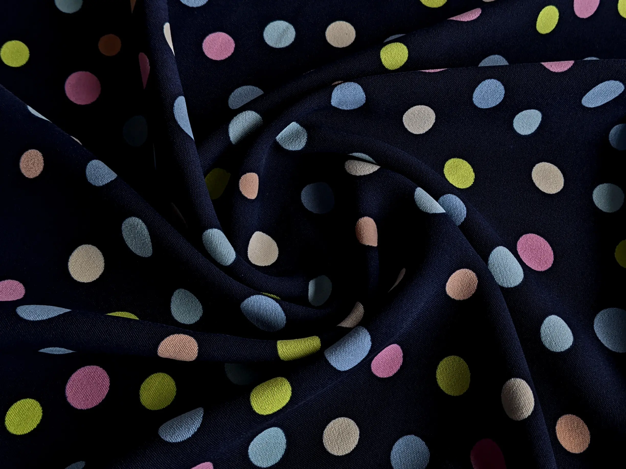 Американський креп малюнок різнокольорові горошки, темно-синій (відріз 0,7 м)