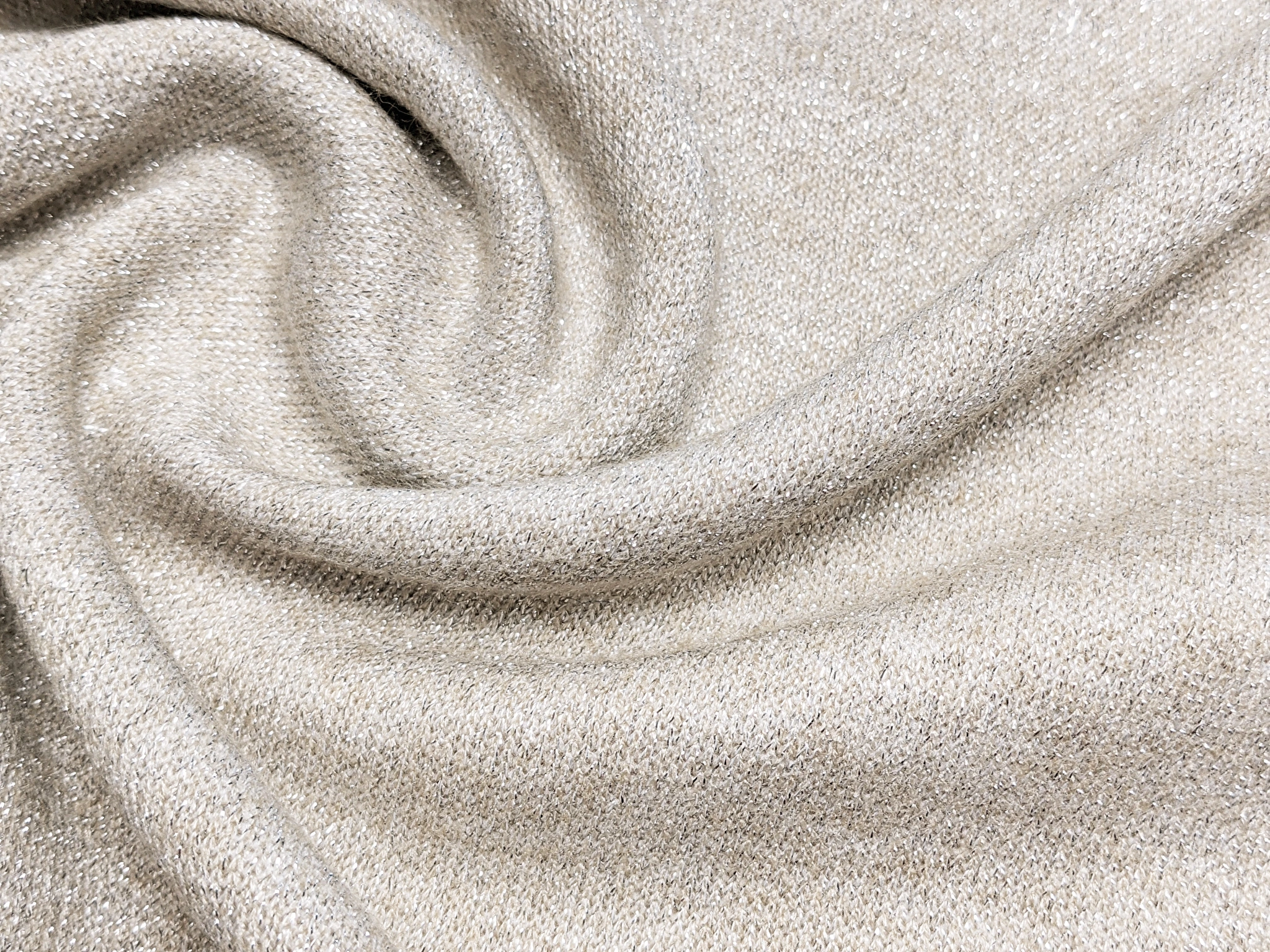 Трикотаж ангора королівська з люрексом - це якісне трикотажне полотно з блиском. Тканина щільна, тепла, з м'яким виворотом, люрексові нитки проплетені по лицьовій стороні полотна, таким чином виворіт зовсiм не колеться.