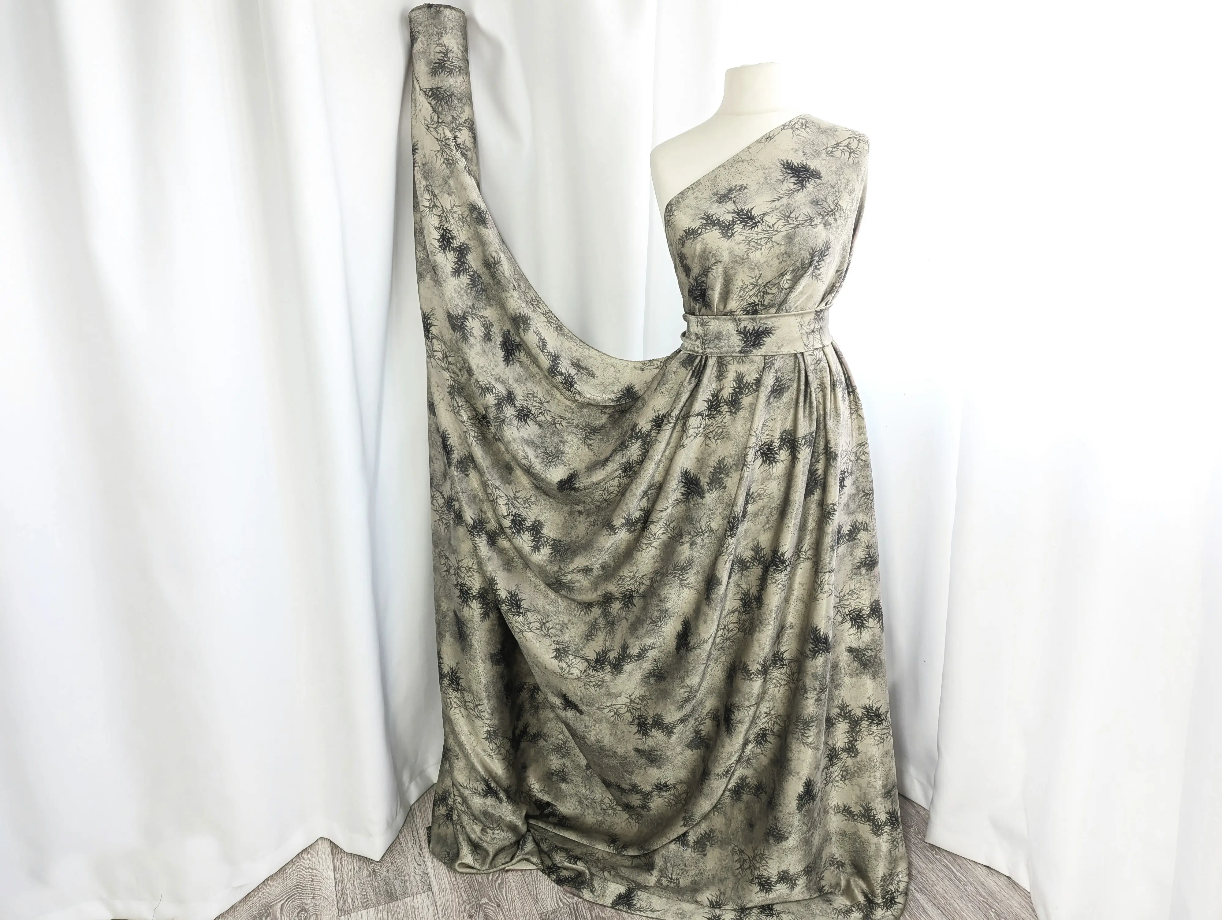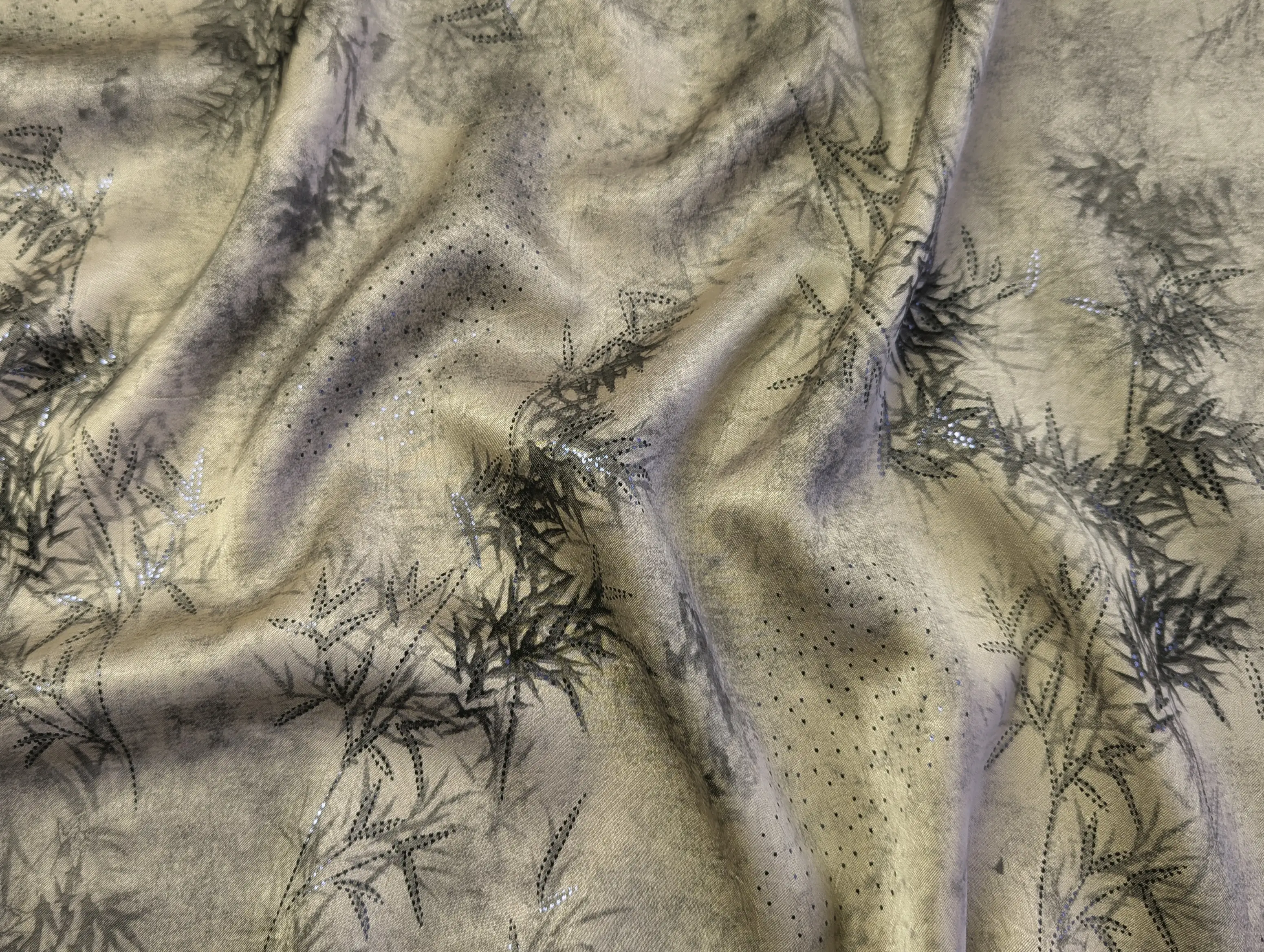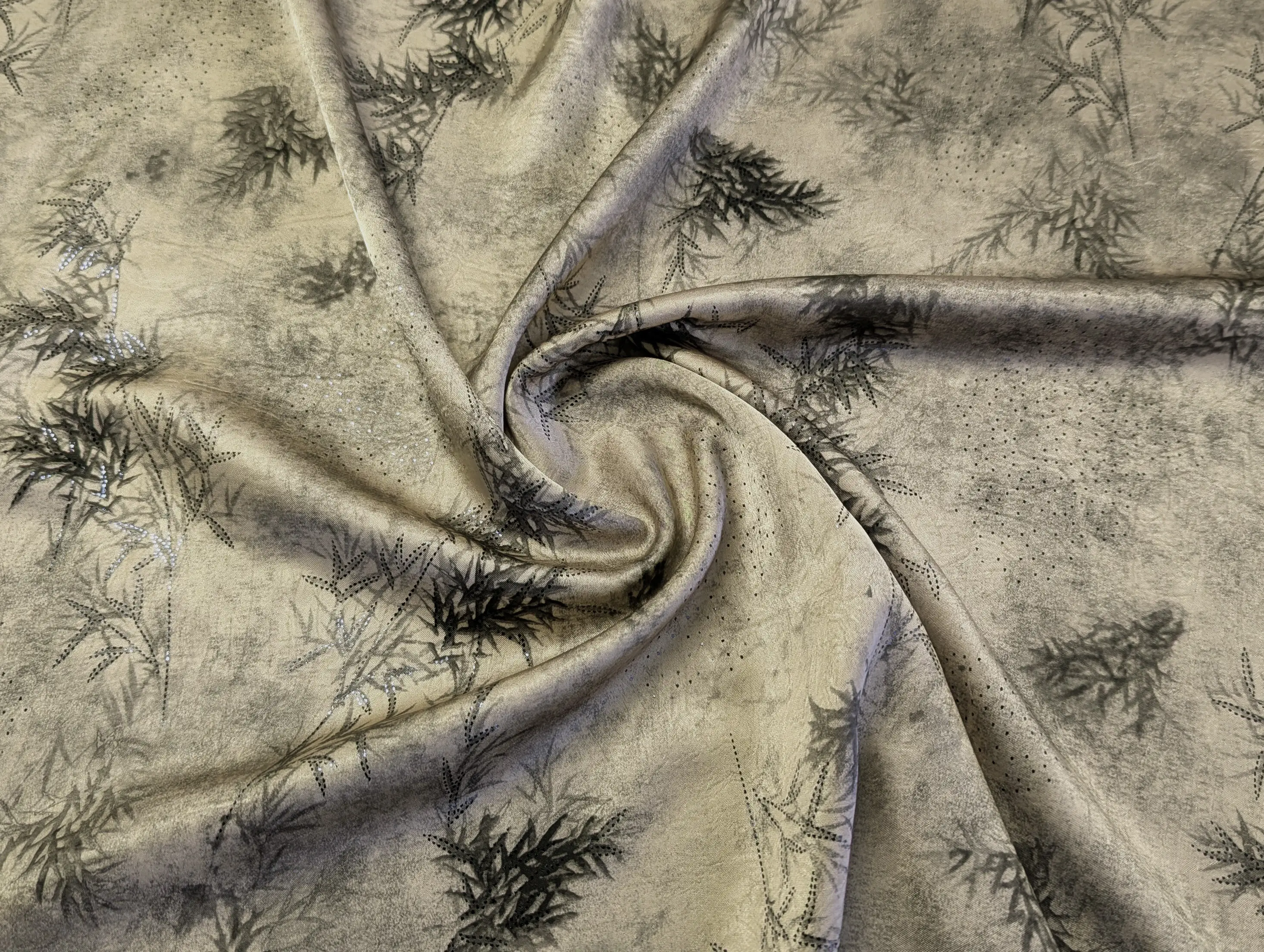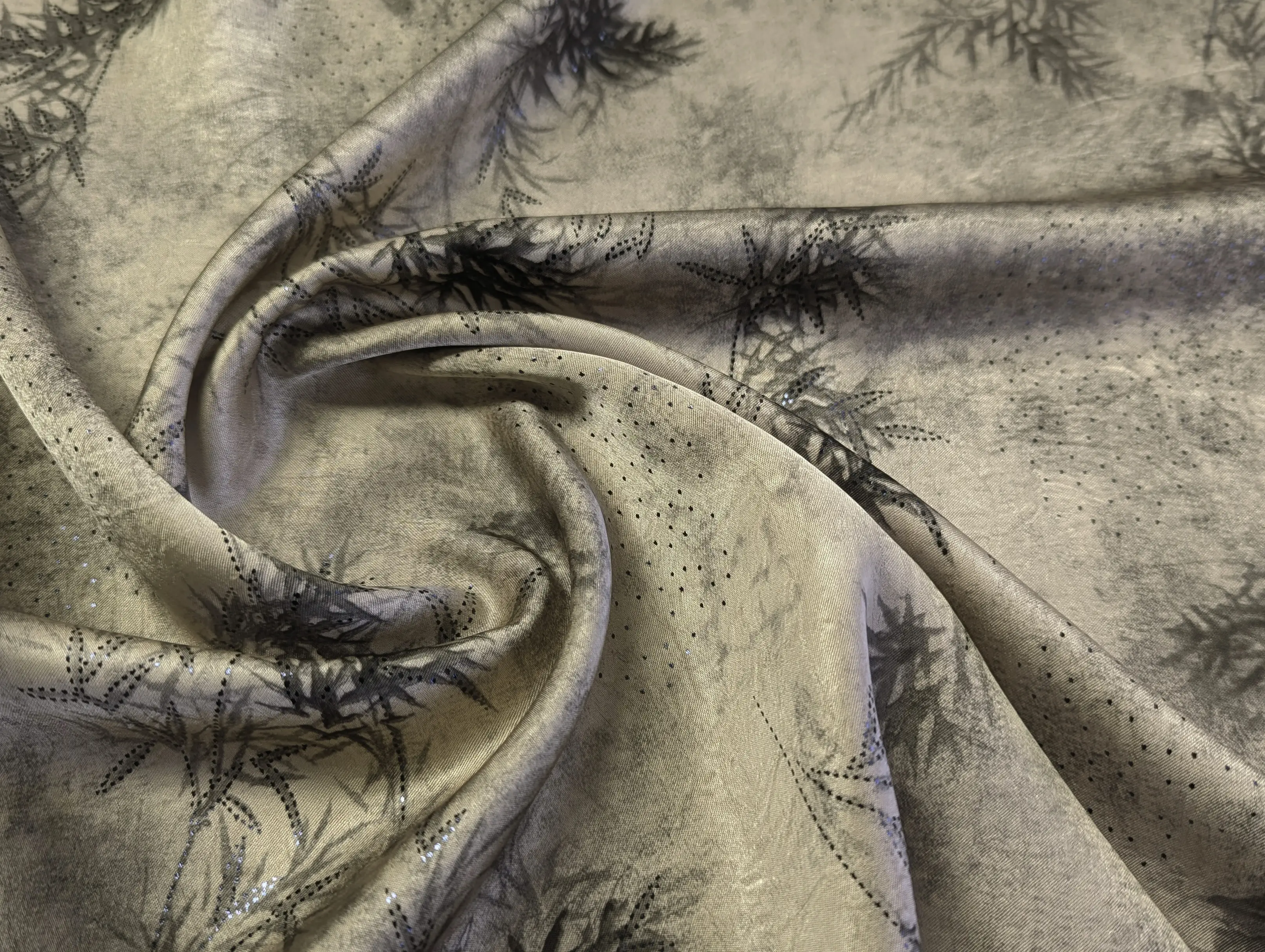Полотно прикрашене вишуканим 3D-принтом, який надає виробам глибини та об’єму, а також дрібними точками з чорної фольги, що витончено мерехтять при освітленні. Такий декоративний ефект додає тканині розкішного й святкового вигляду.