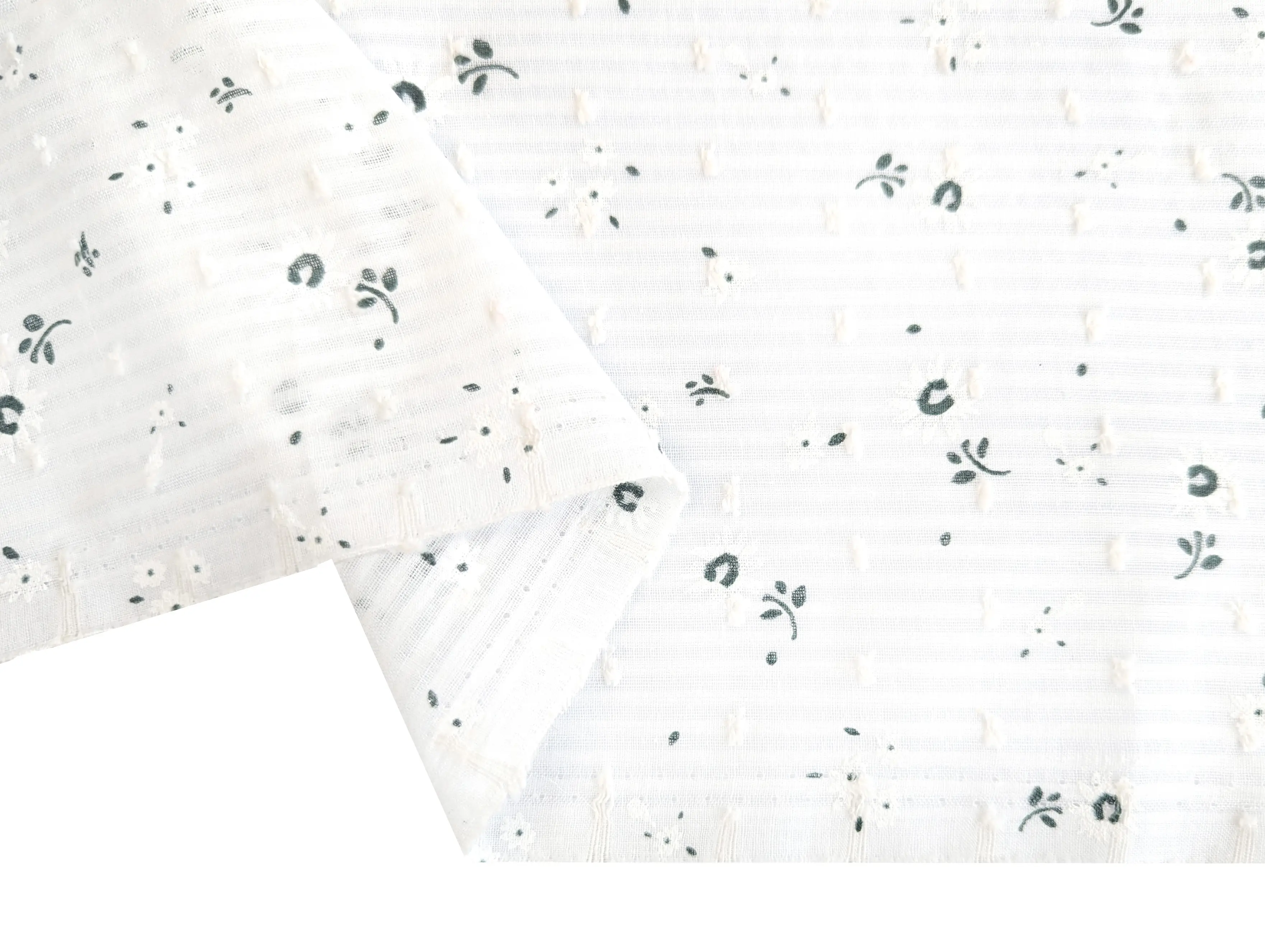 Батист прожиг мушка - це легка, дихаюча і повністю прозора тканина з натуральним складом і декоративним ефектом "прожиг" у дизайны смуг, а невеликі крапки по поверхні створюють ажурну фактуру. Тканина м'яка на дотик, відмінно пропускає повітря і дарує комфорт у спеку, добре драпірується, підкреслюючи легкість та жіночність виробів.