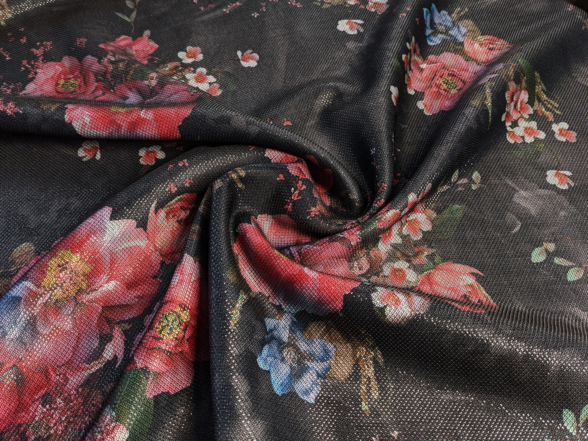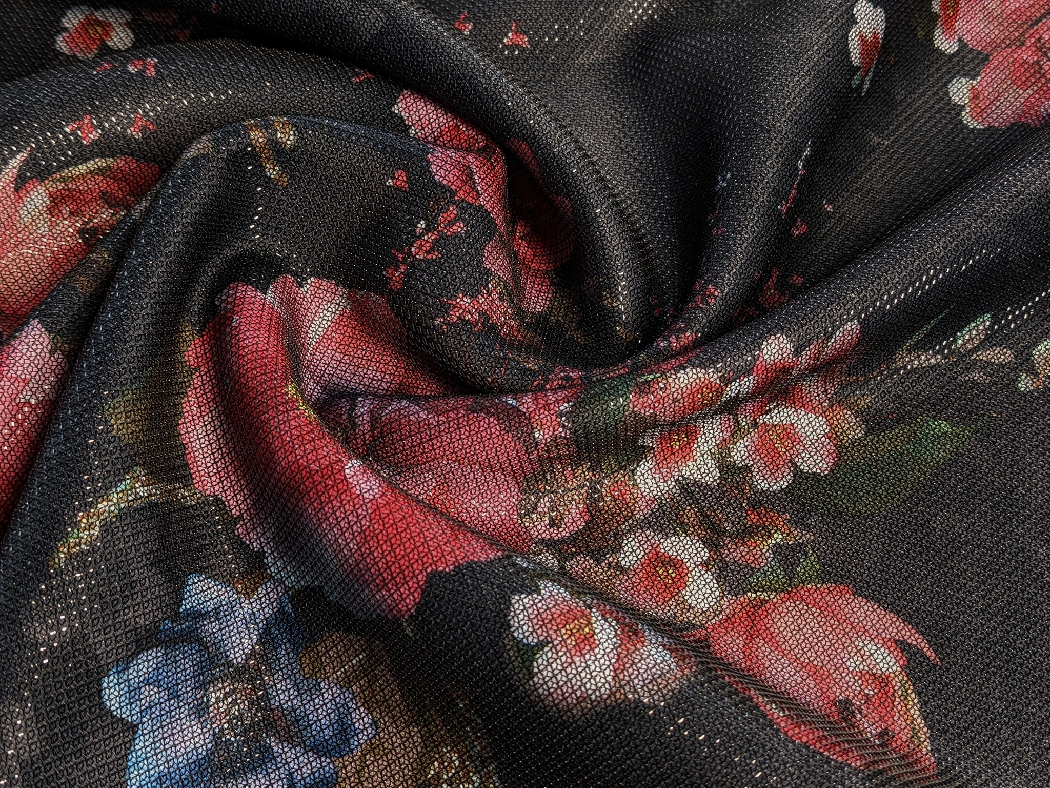 Щільний трикотаж диско луска - це ошатна тканина з блиском, яскравим квітковим візерунком і гладкою і приємним на дотик виворотом. Зворотний бік полотна еластичний, але щільний, завдяки чому тканина тримає форму, дозволяє формувати складки і шити сукню з пишною спідницею. Тканина виглядає ошатно, підійде для пошиття святкового і вечірнього вбрання як для дорослих, так і дітей.