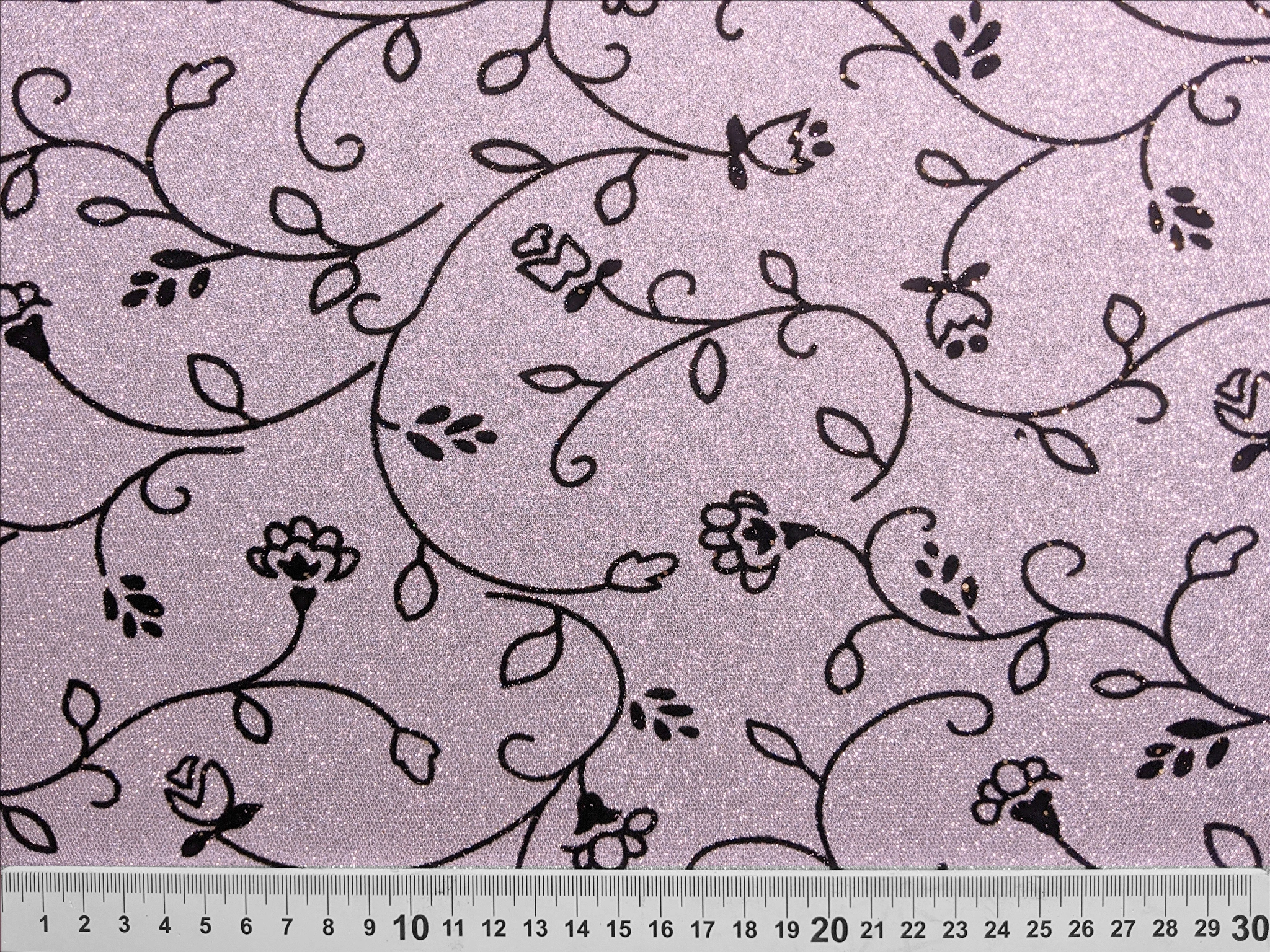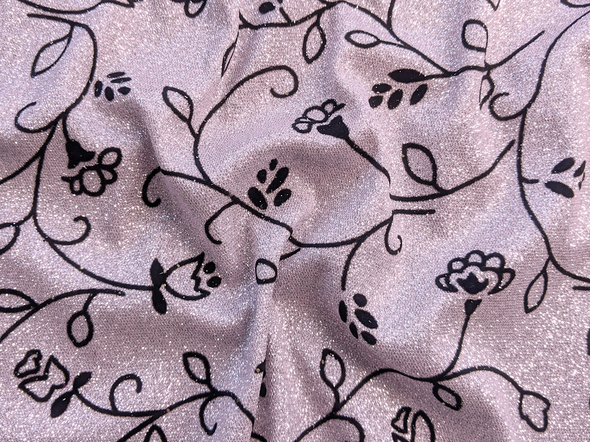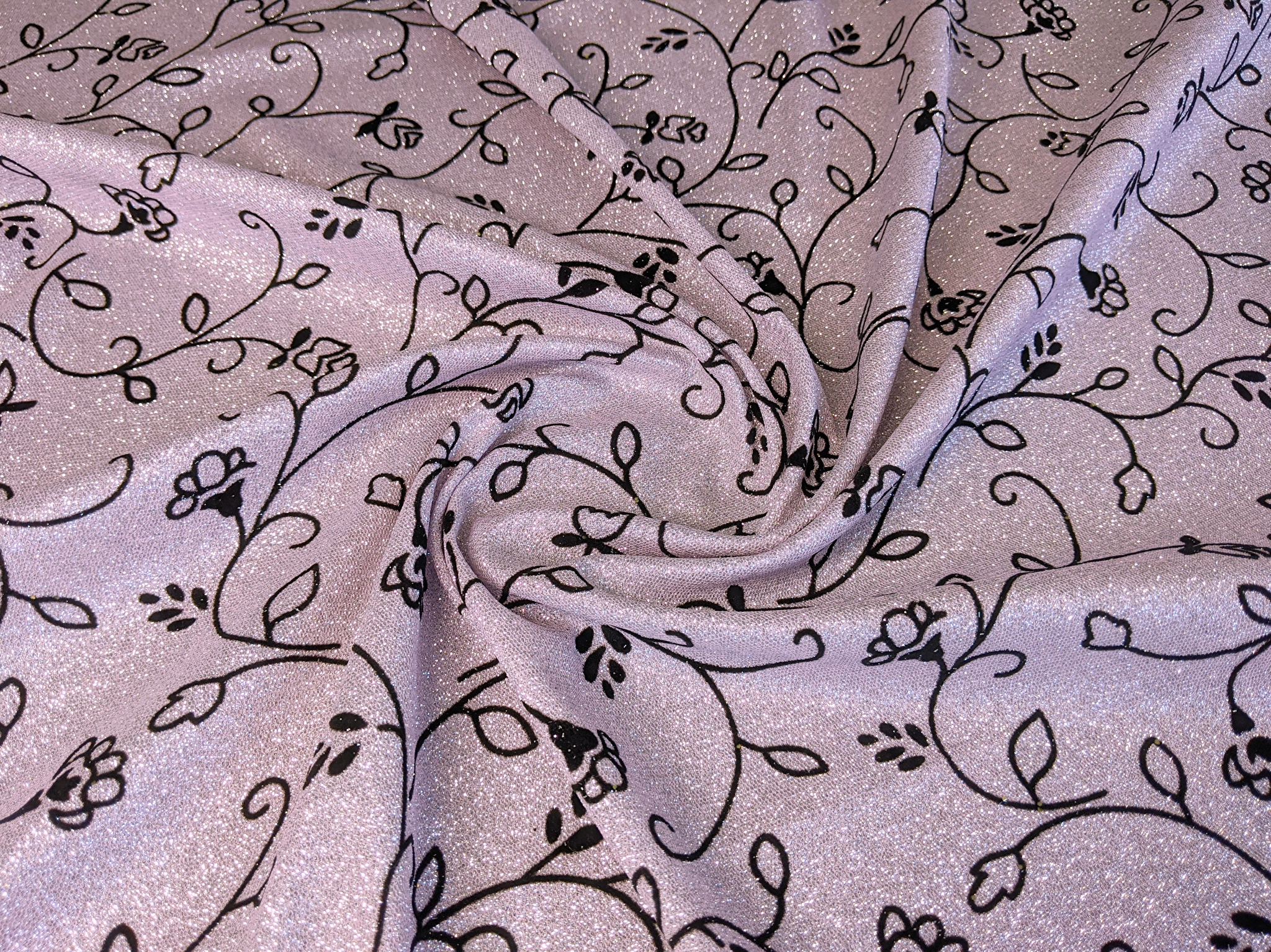 Диско флок - це блискуче трикотажне полотно з напиленням. З лицьового боку нанесено ніжний квітковий візерунок з оксамитового напилення, а виворіт гладкий. Полотно не світиться, трохи тягнеться.