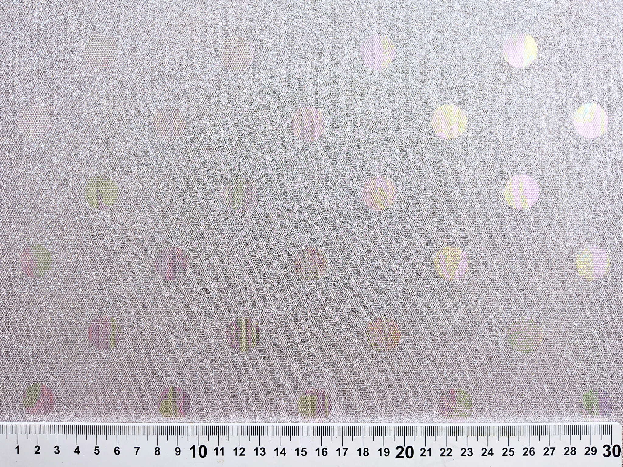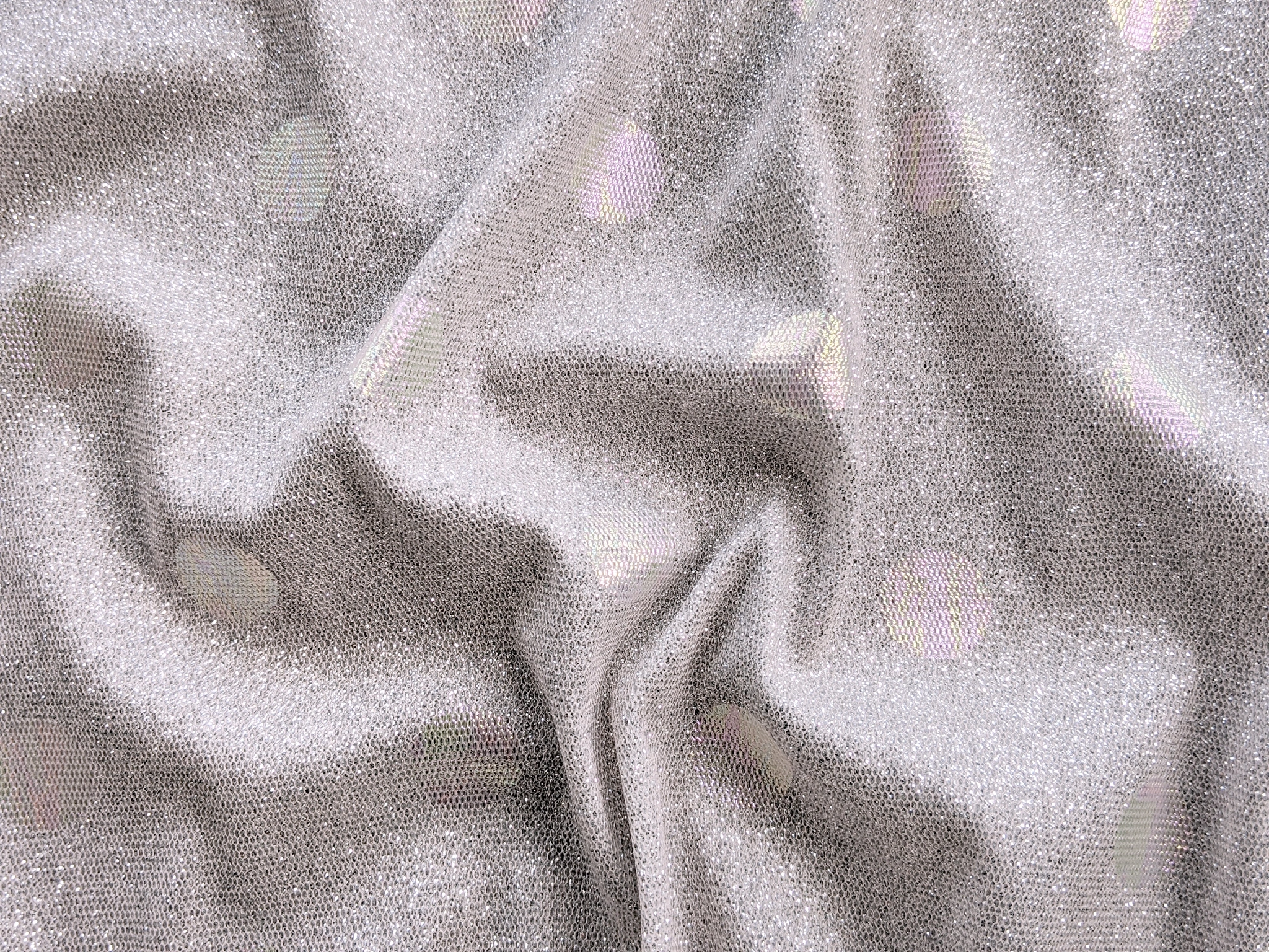 Трикотаж диско з горошками - це блискуче трикотажне полотно з напиленням. З лицьового боку горошки з райдужним забарвленням, а виворіт гладкий . Полотно трохи тягнеться, не світиться, не заминається.