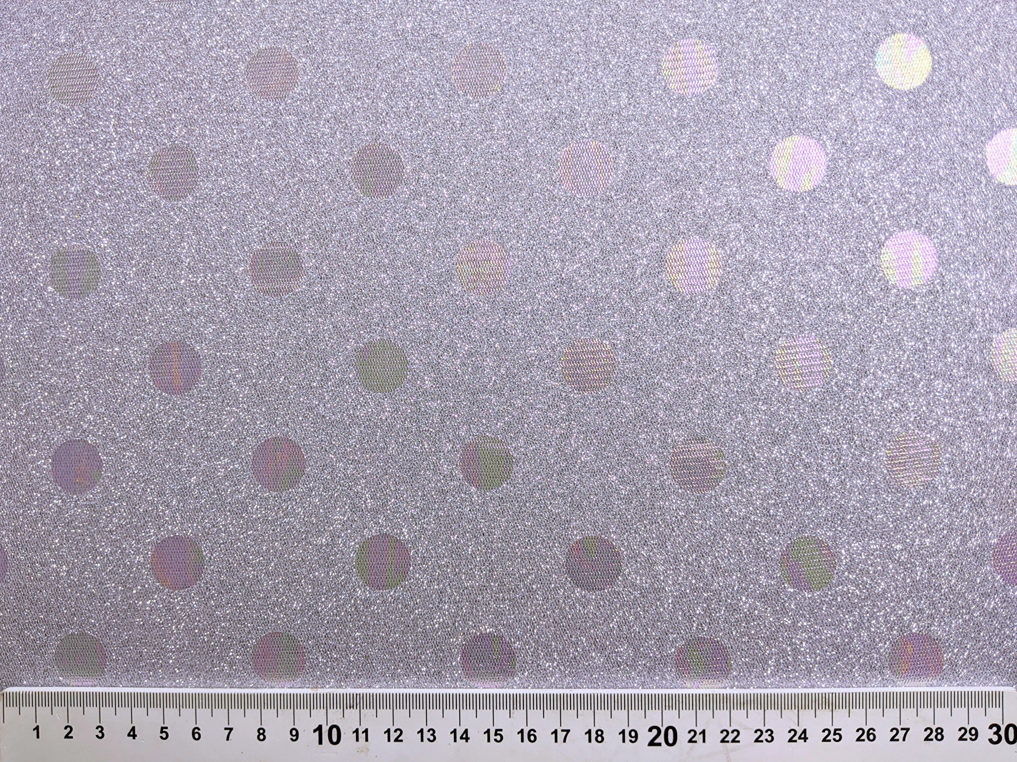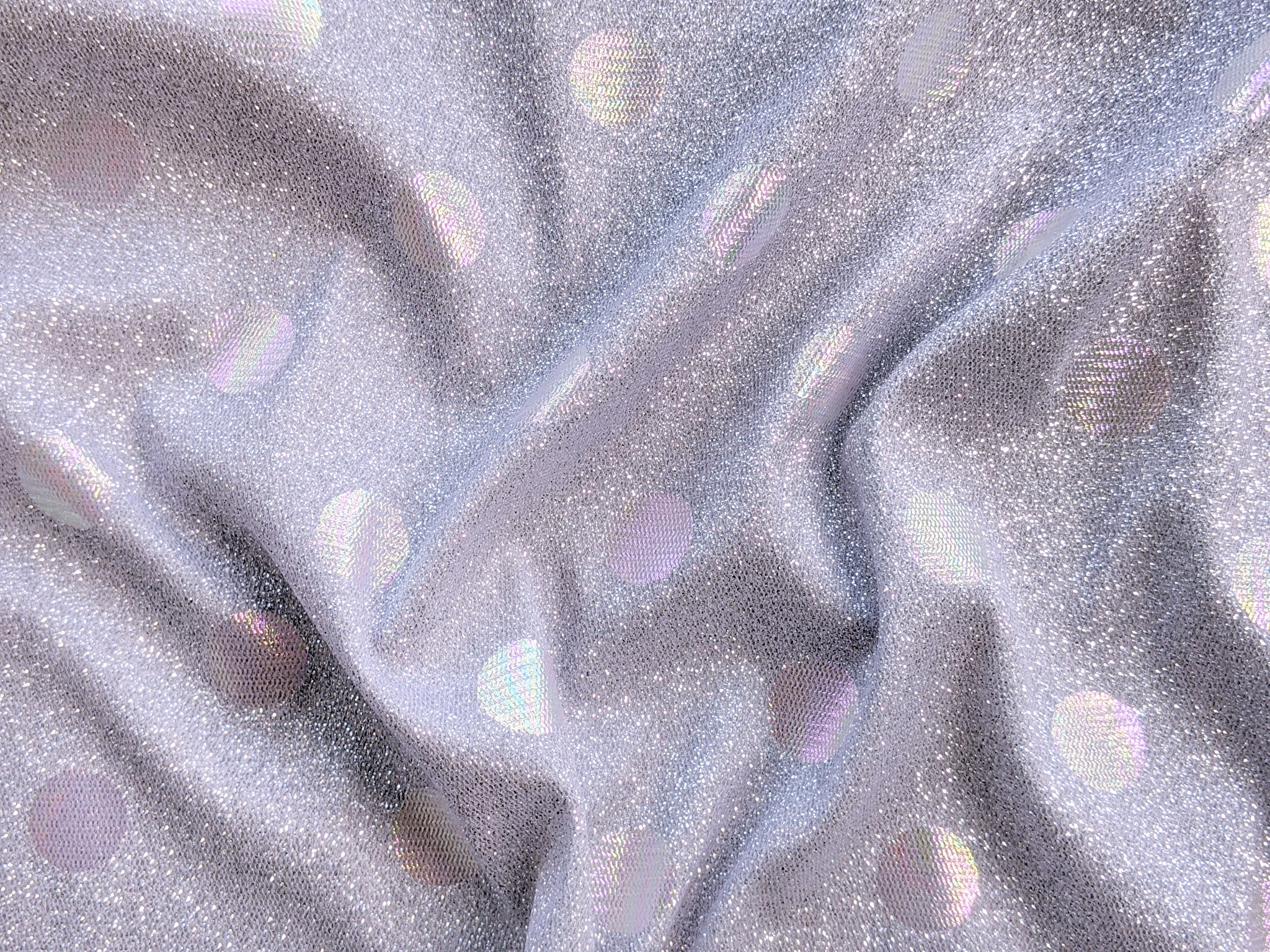 Трикотаж диско з горошками - це блискуче трикотажне полотно з напиленням. З лицьового боку горошки з райдужним забарвленням, а виворіт гладкий . Полотно трохи тягнеться, не світиться, не заминається.