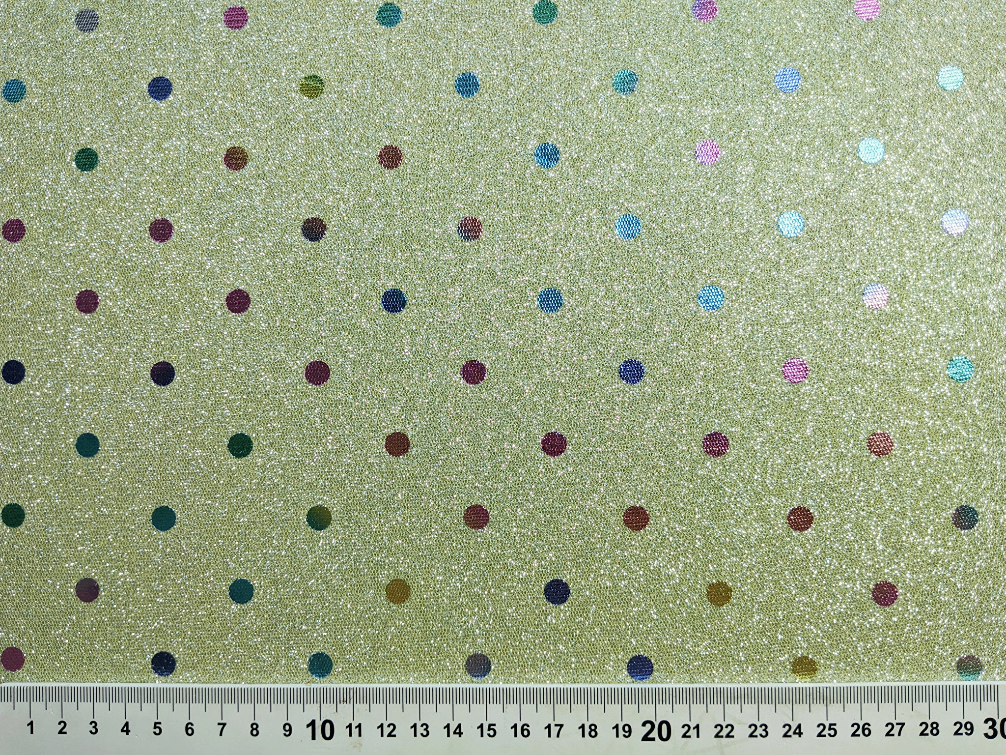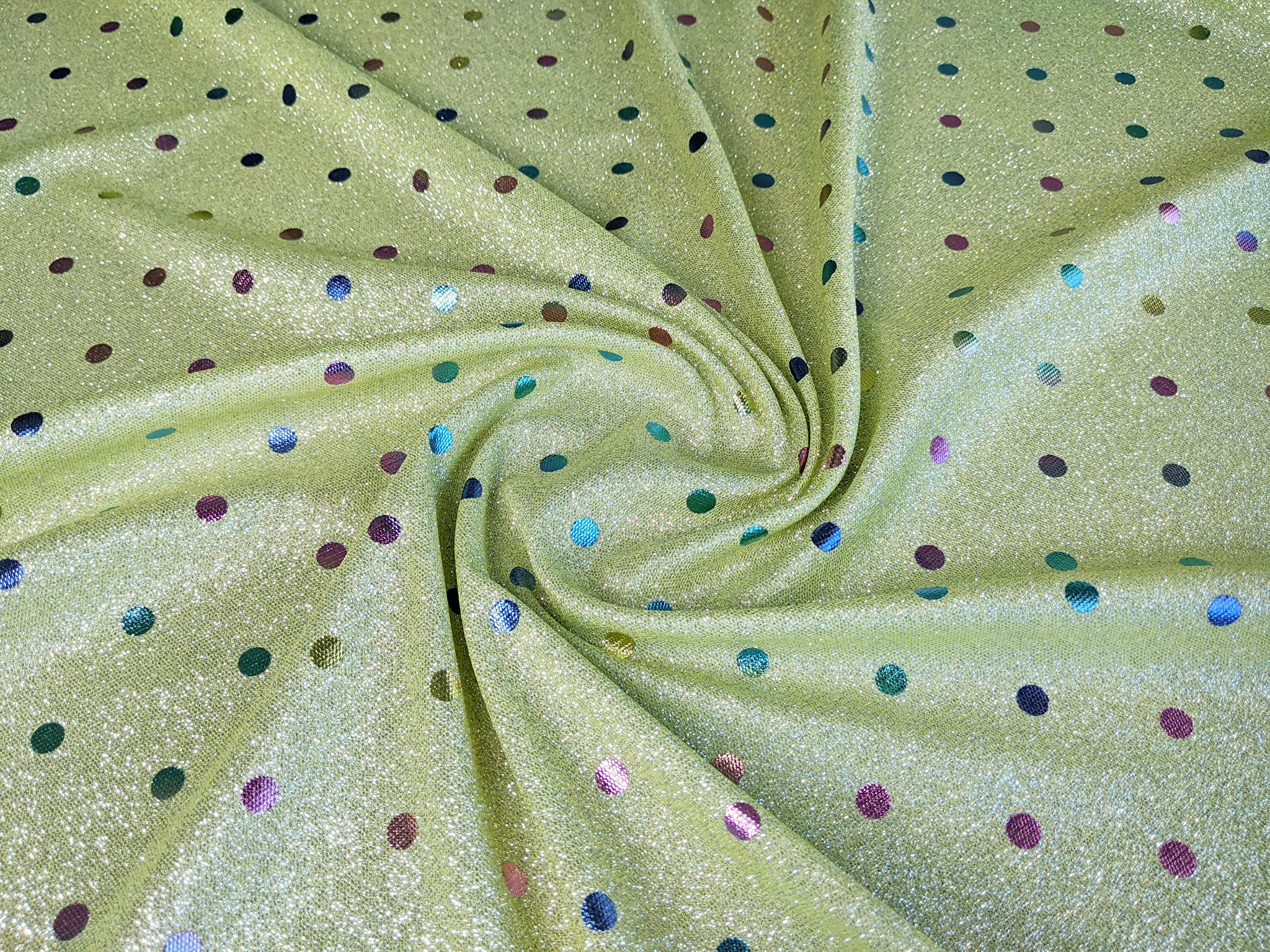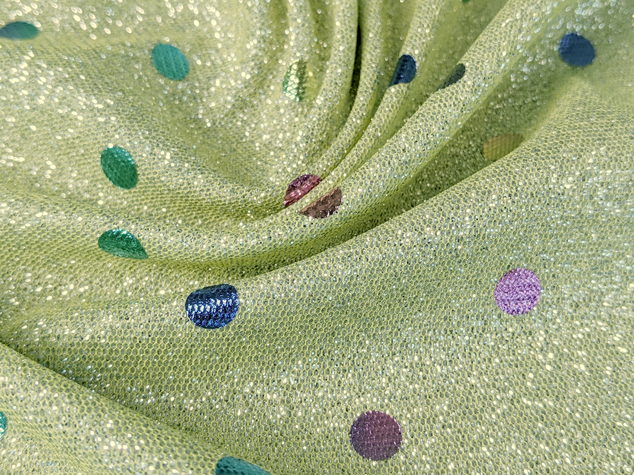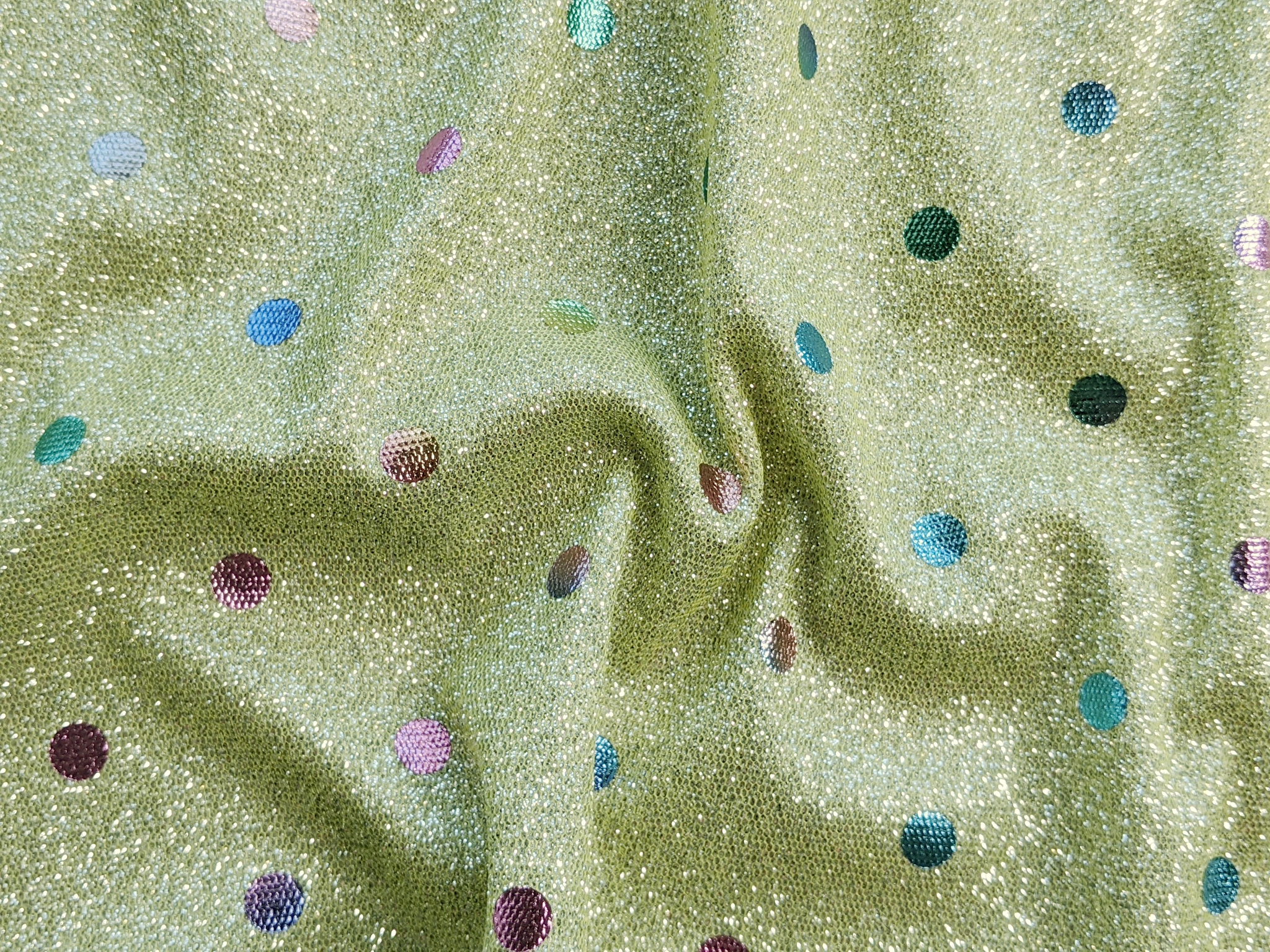 Трикотаж диско з горошками - це блискуче трикотажне полотно з напиленням. З лицьового боку горошки з райдужним забарвленням, а виворіт гладкий . Полотно трохи тягнеться, не світиться, не заминається.