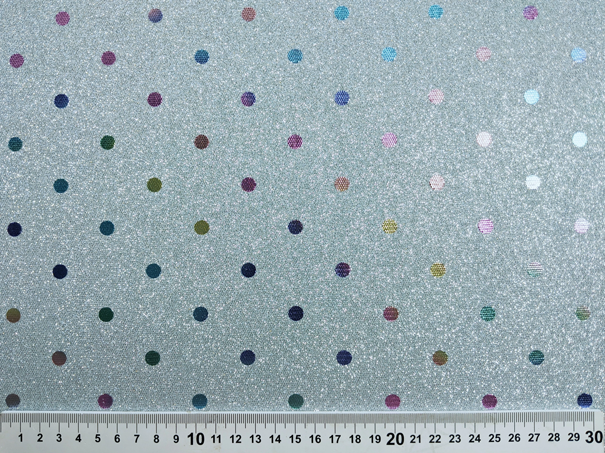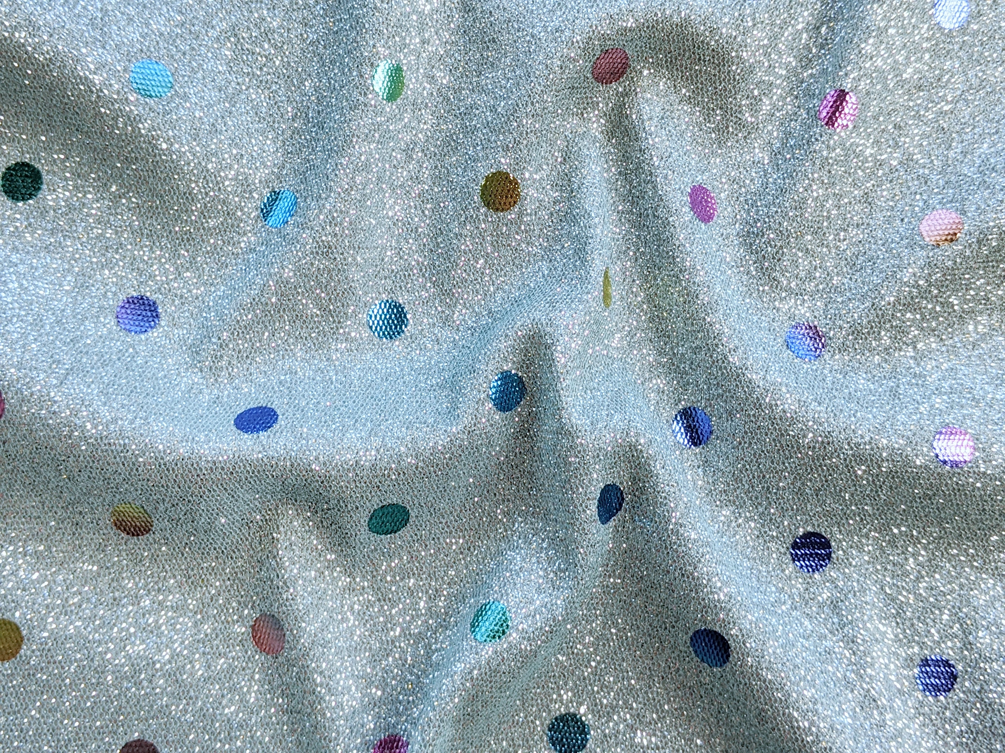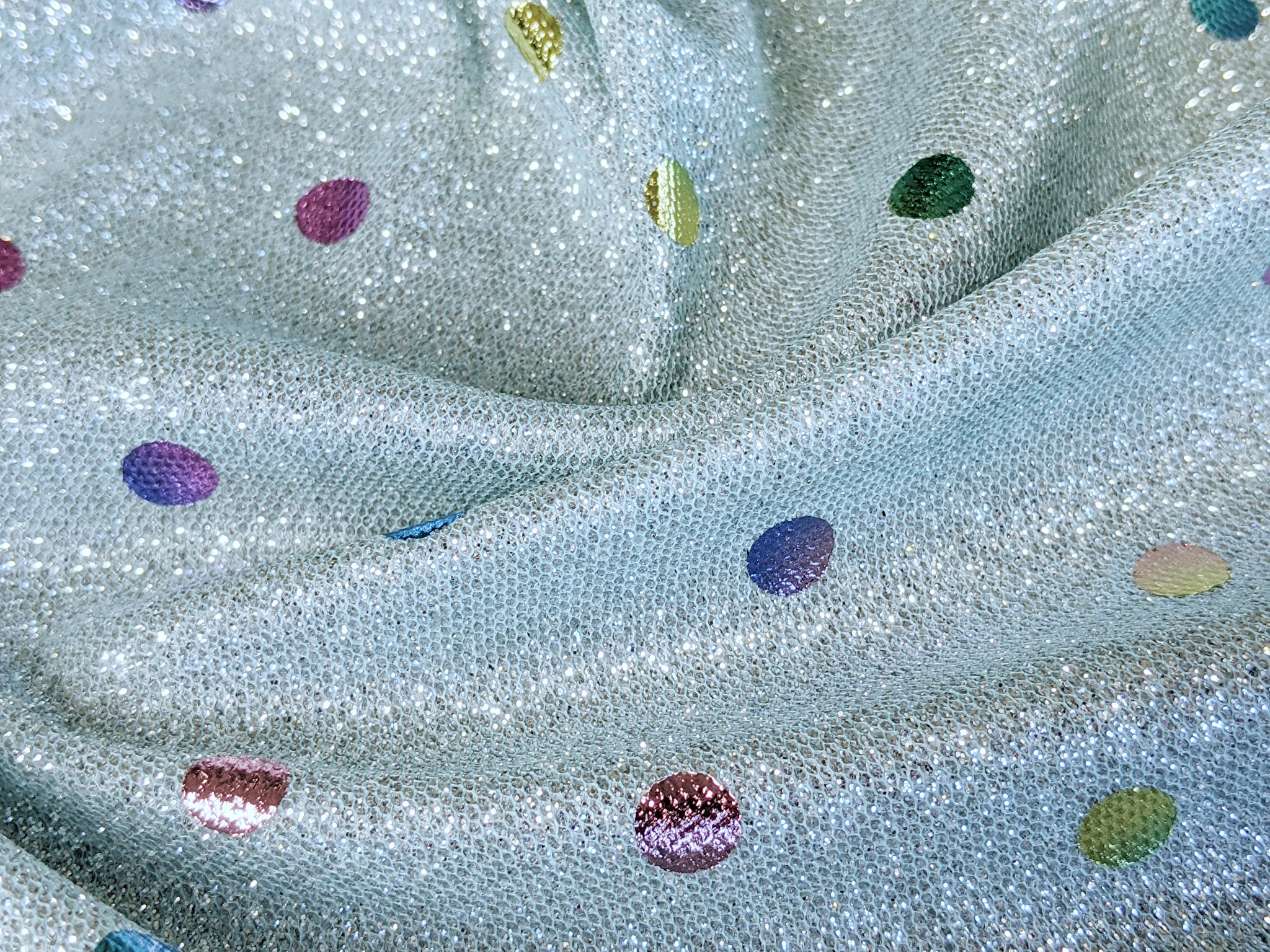 Трикотаж диско з горошками - це блискуче трикотажне полотно з напиленням. З лицьового боку горошки з райдужним забарвленням, а виворіт гладкий . Полотно трохи тягнеться, не світиться, не заминається.