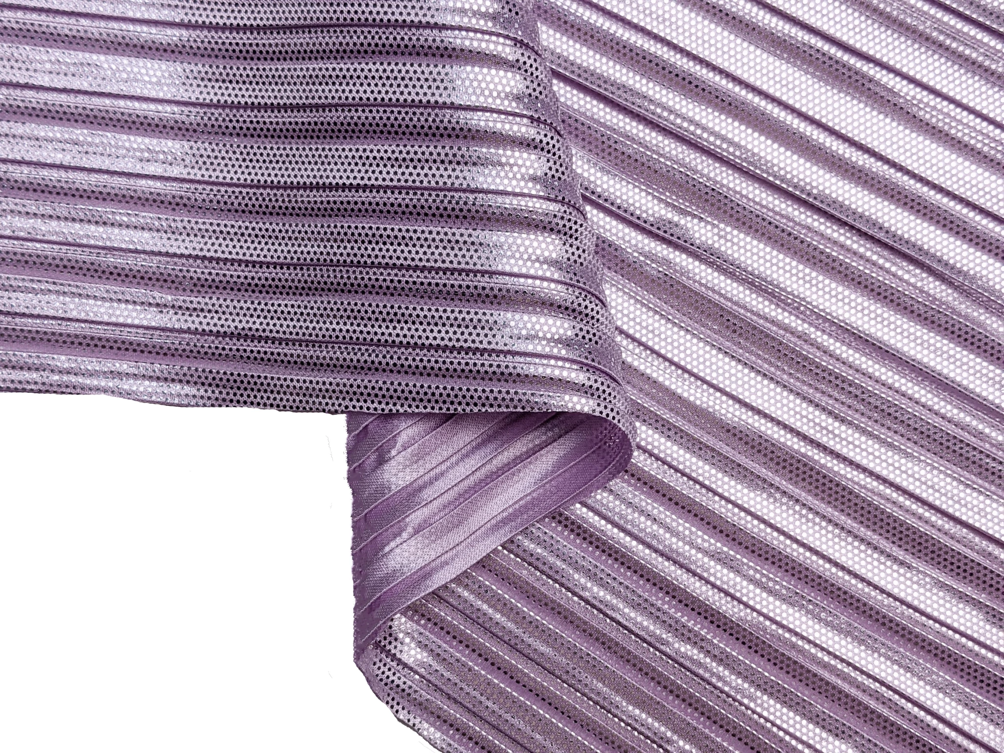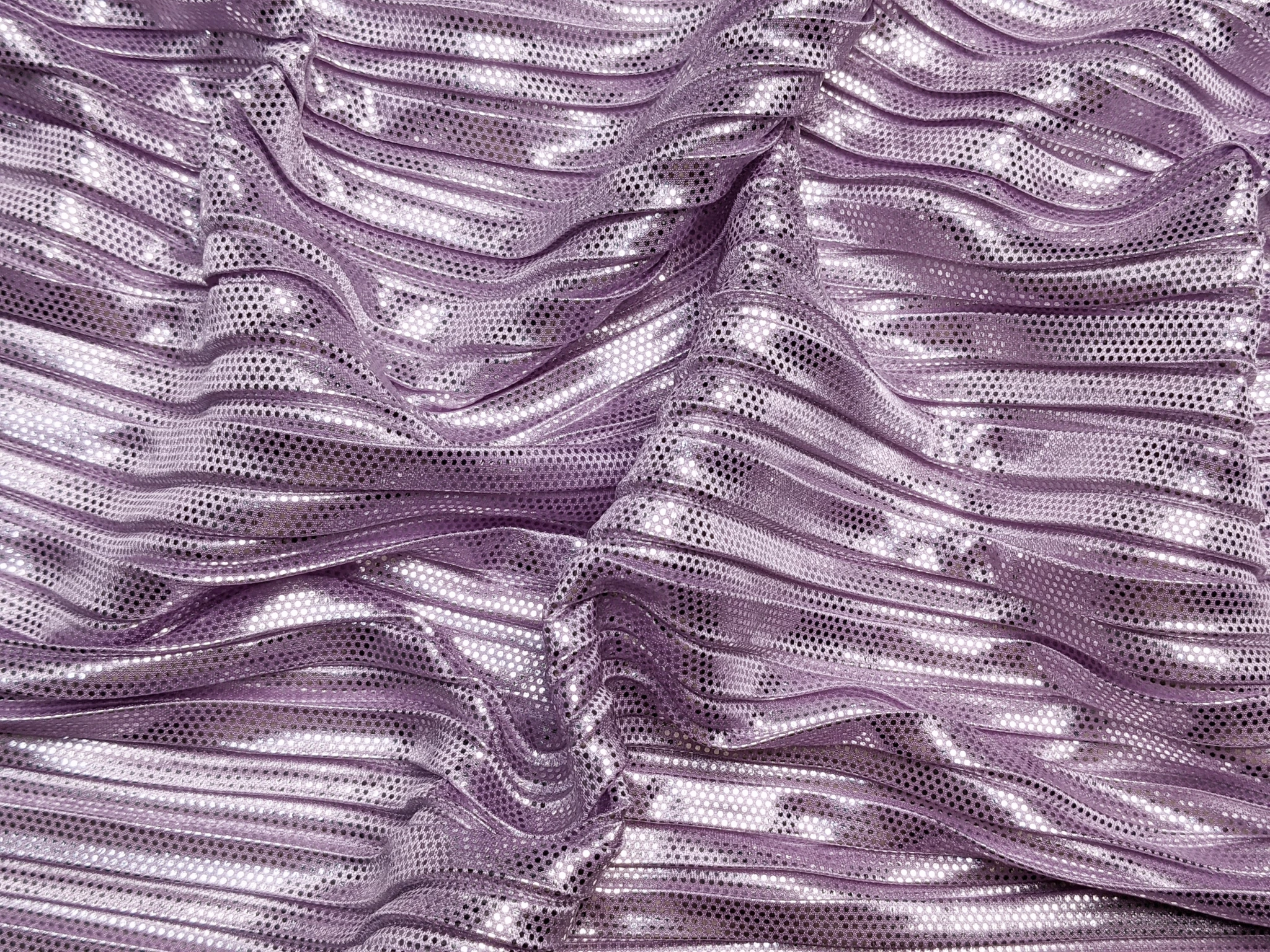 Диско плісе - це трикотажне полотно з блиском, виконане у вигляді складок поперек кромки. Розмір складки приблизно 7 мм та глубина 2 мм. Полотно має стрейч поперек рулону, що потрібно врахувати під час шиття. Тканина пліссе виглядає дуже ефектно, вишукано, жіночно, повітряно і має струмливий ефект. Вертикальні складки тканини витягають фігуру, підкреслюючи ваші переваги.