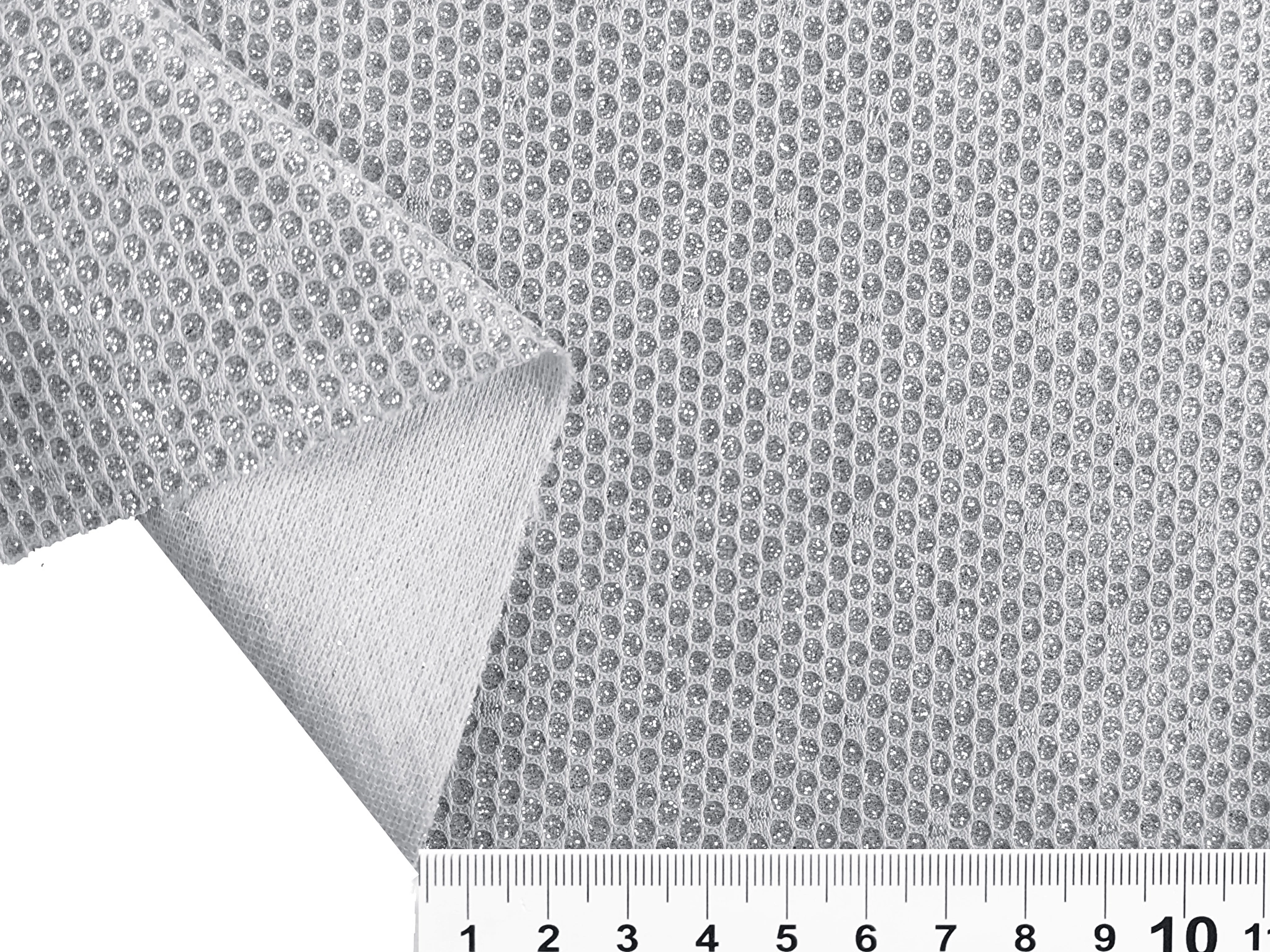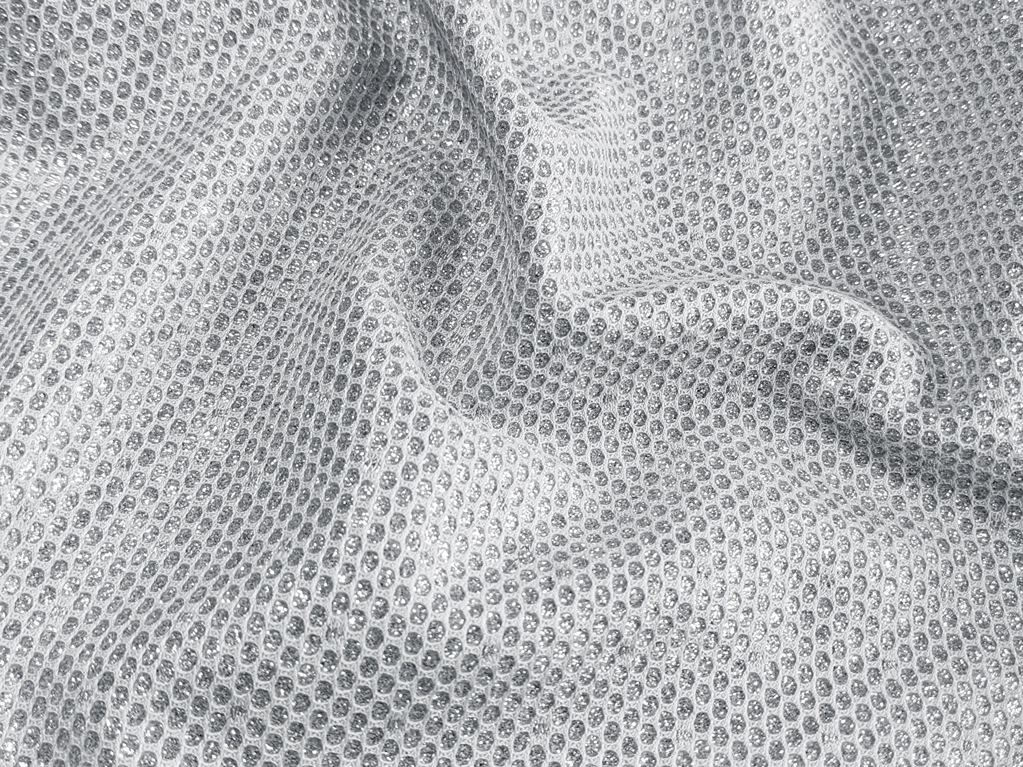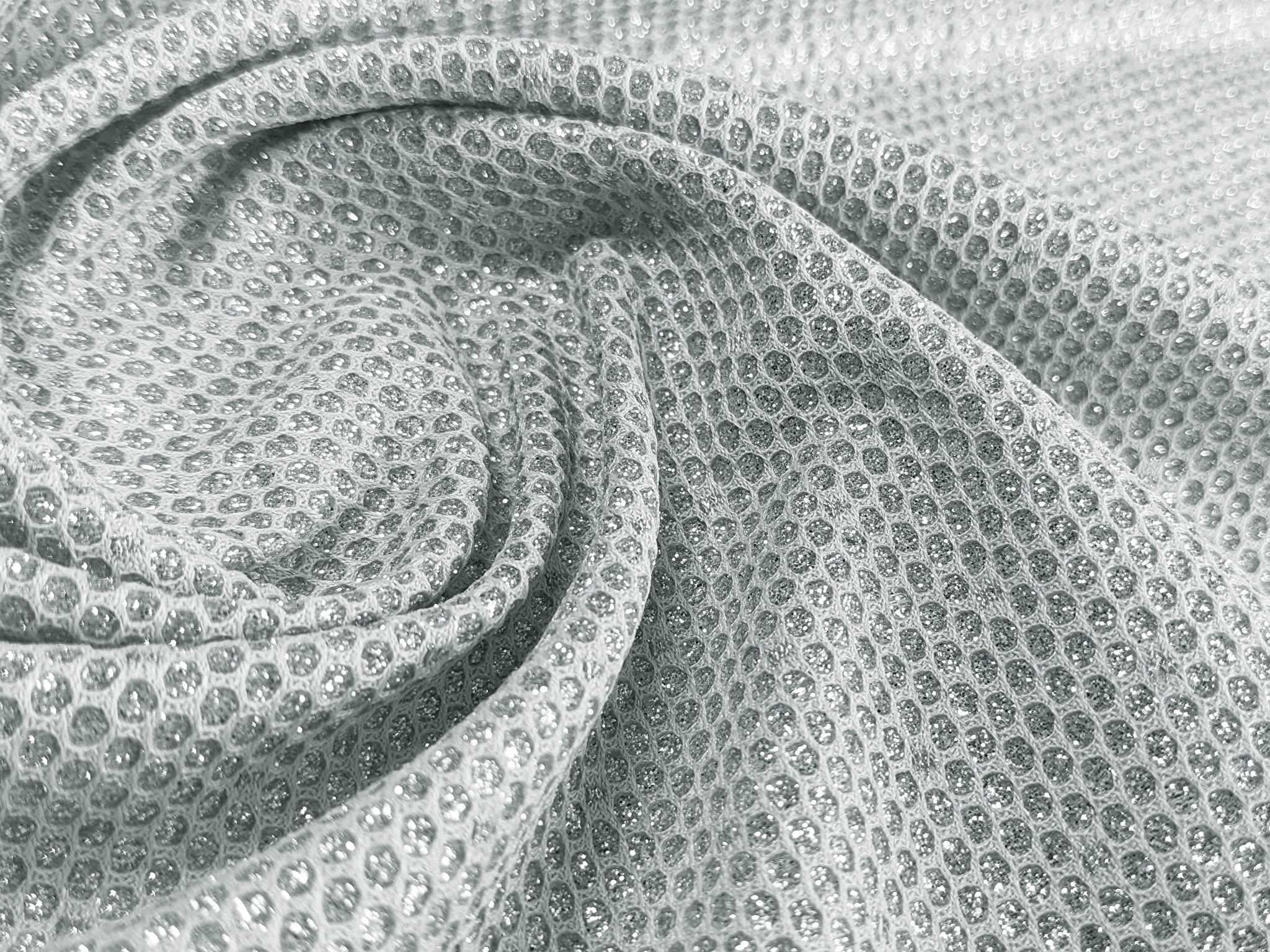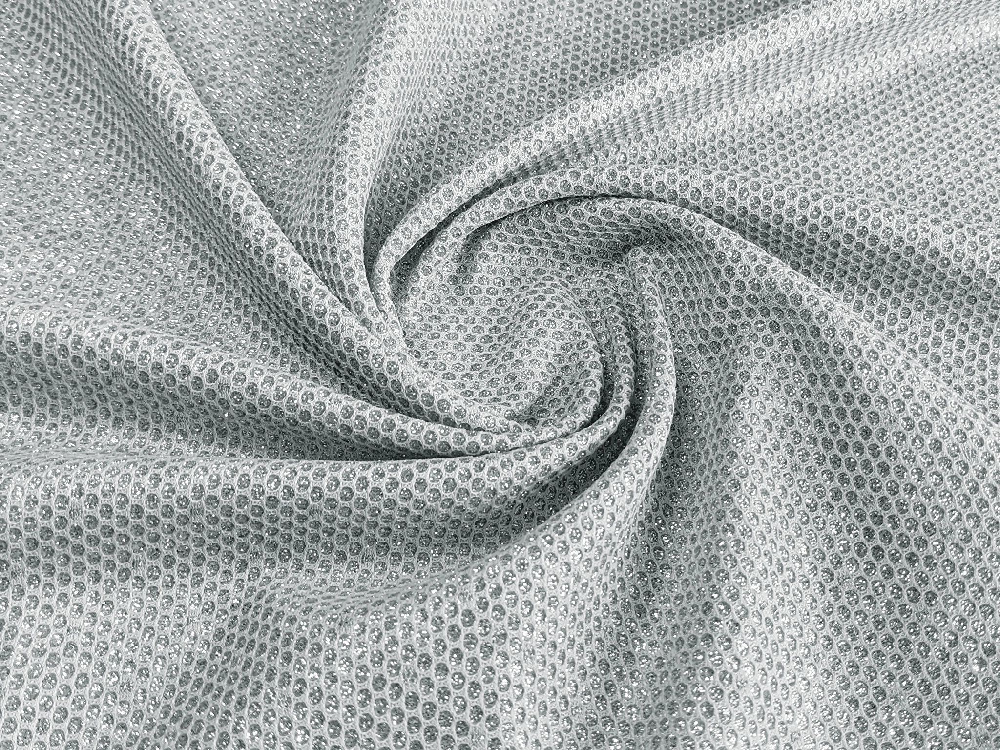 Трикотаж диско - мерехтливий матеріал з фактурною лицьовою стороною і гладким, шовковистим виворотом. Фактура і блиск по лицьовому боці досягнуті шляхом переплетення основної та металізованої ниток та глітера. Тканина непрозора на тілі, злегка еластична, практично не мнеться, при драпіруванні лягає в м'які, формотримаючі складки.