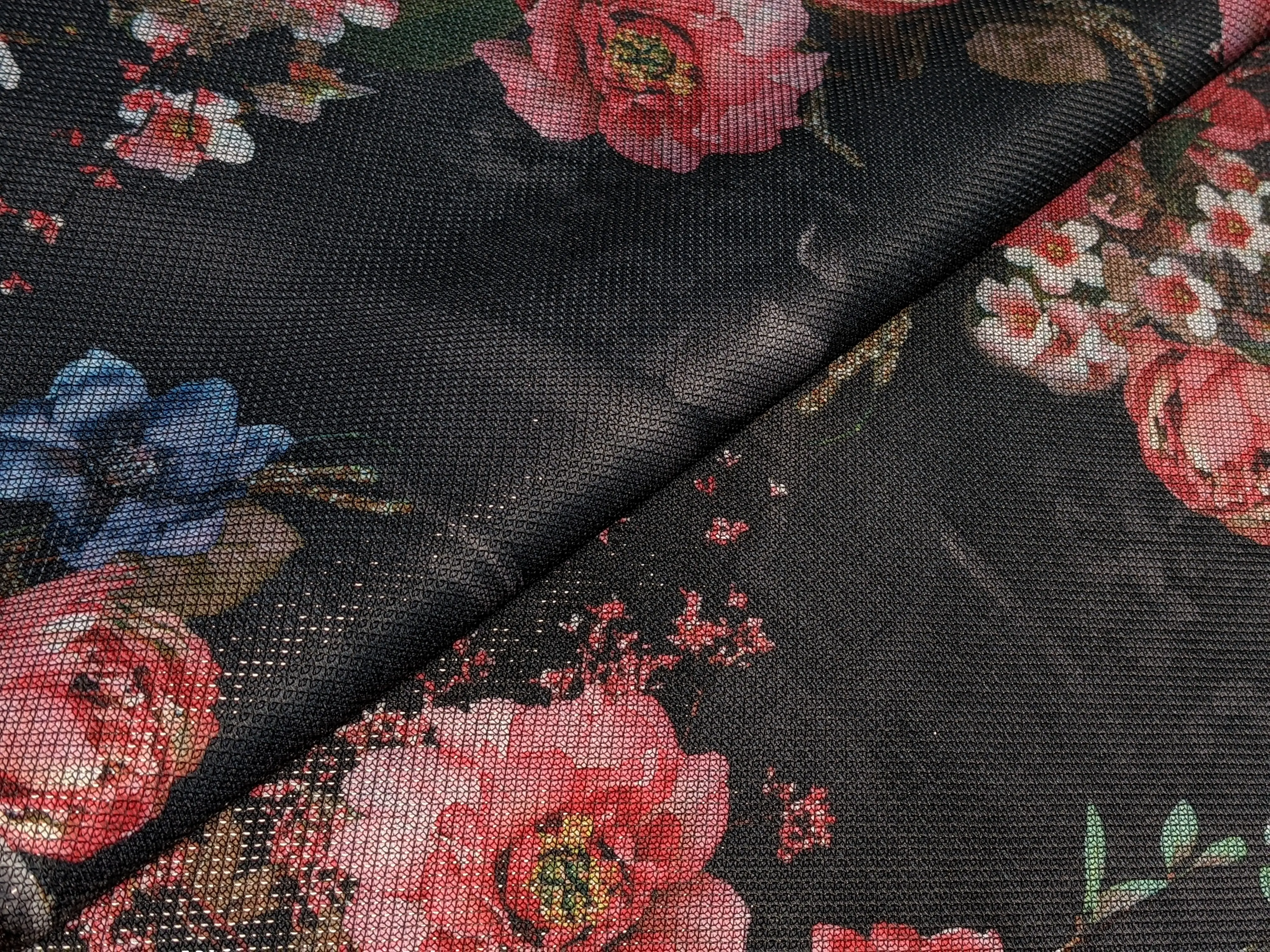 Щільний трикотаж диско луска - це ошатна тканина з блиском, яскравим квітковим візерунком і гладкою і приємним на дотик виворотом. Зворотний бік полотна еластичний, але щільний, завдяки чому тканина тримає форму, дозволяє формувати складки і шити сукню з пишною спідницею. Тканина виглядає ошатно, підійде для пошиття святкового і вечірнього вбрання як для дорослих, так і дітей.
