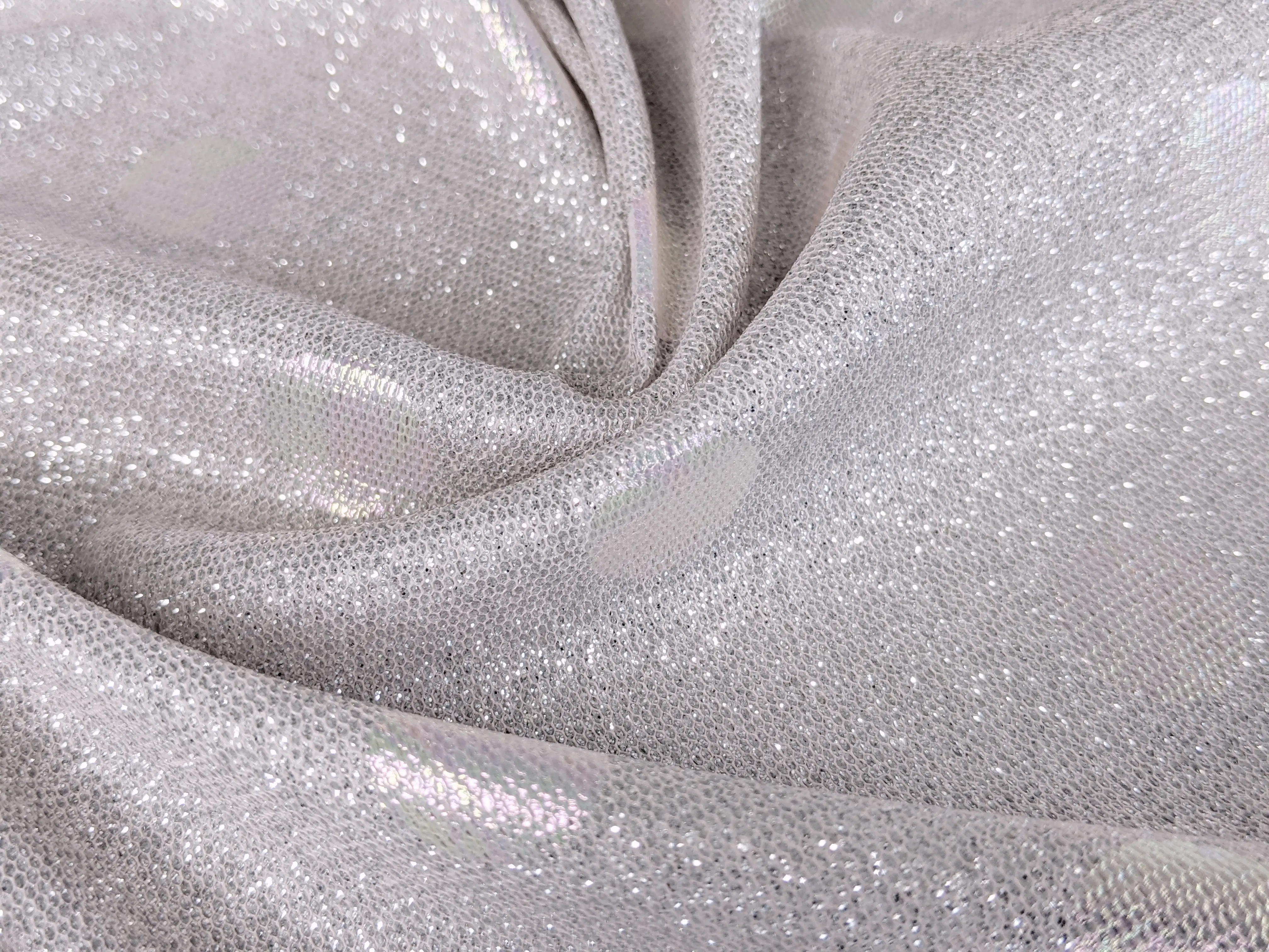 Трикотаж диско з горошками - це блискуче трикотажне полотно з напиленням. З лицьового боку горошки з райдужним забарвленням, а виворіт гладкий . Полотно трохи тягнеться, не світиться, не заминається.