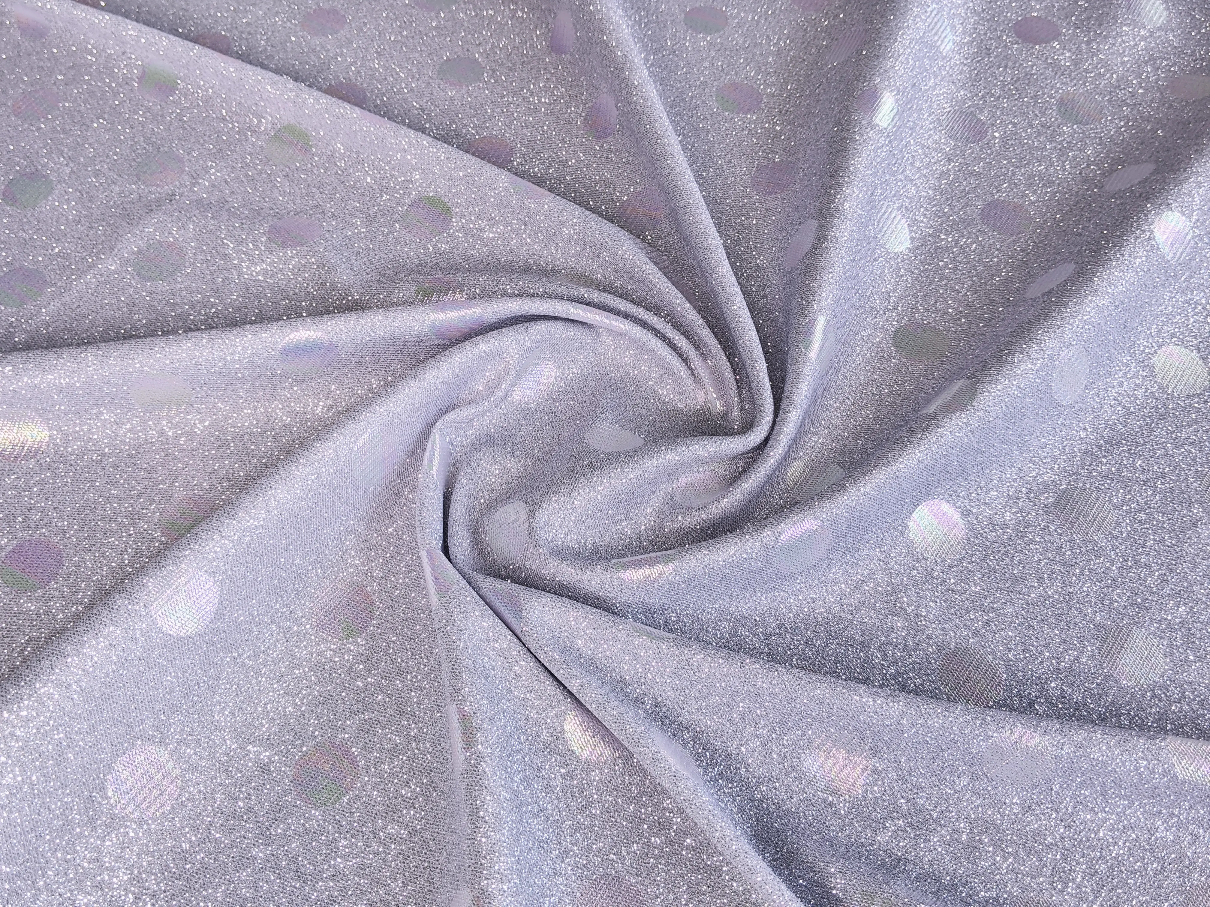 Трикотаж диско з горошками - це блискуче трикотажне полотно з напиленням. З лицьового боку горошки з райдужним забарвленням, а виворіт гладкий . Полотно трохи тягнеться, не світиться, не заминається.