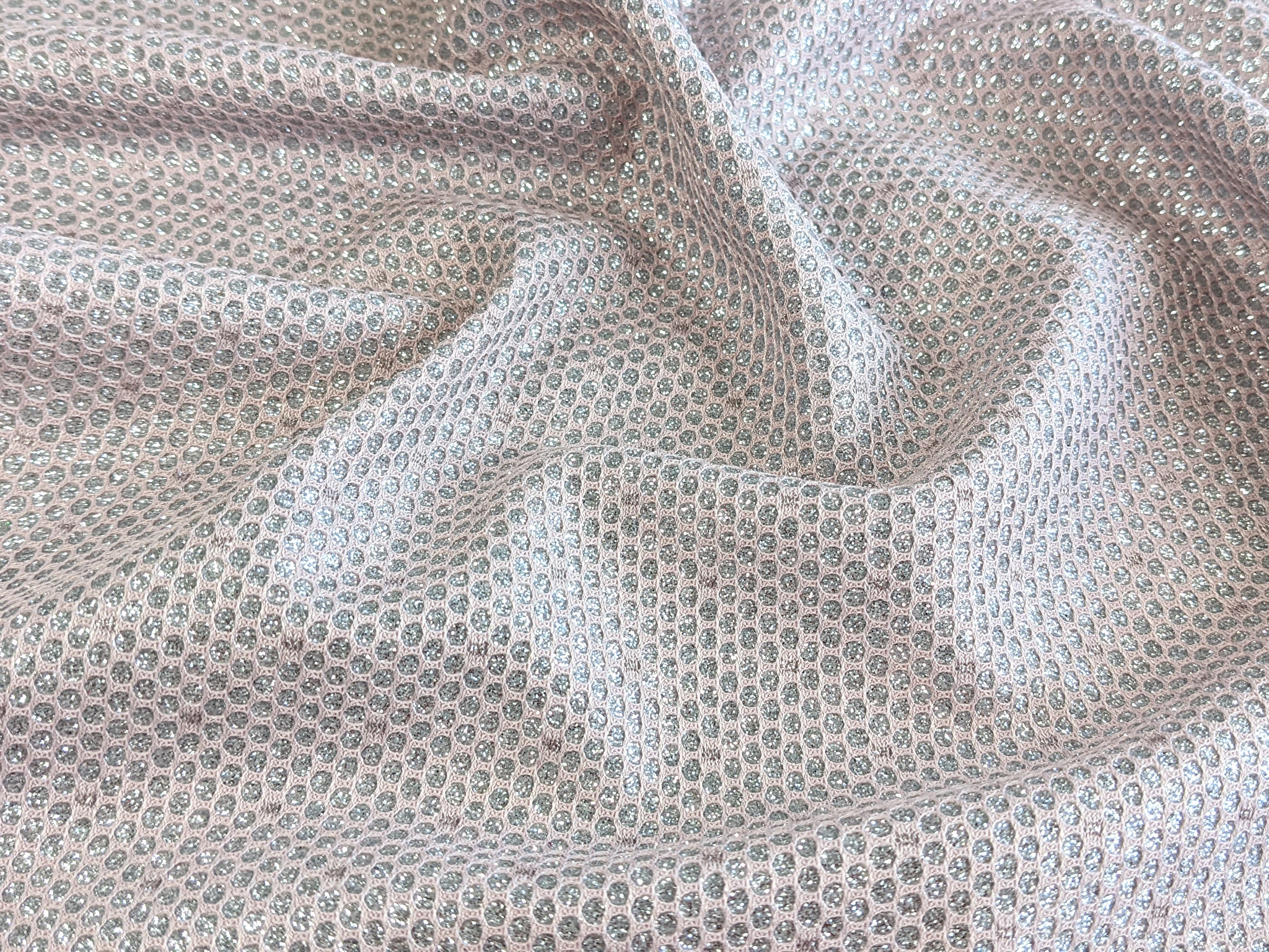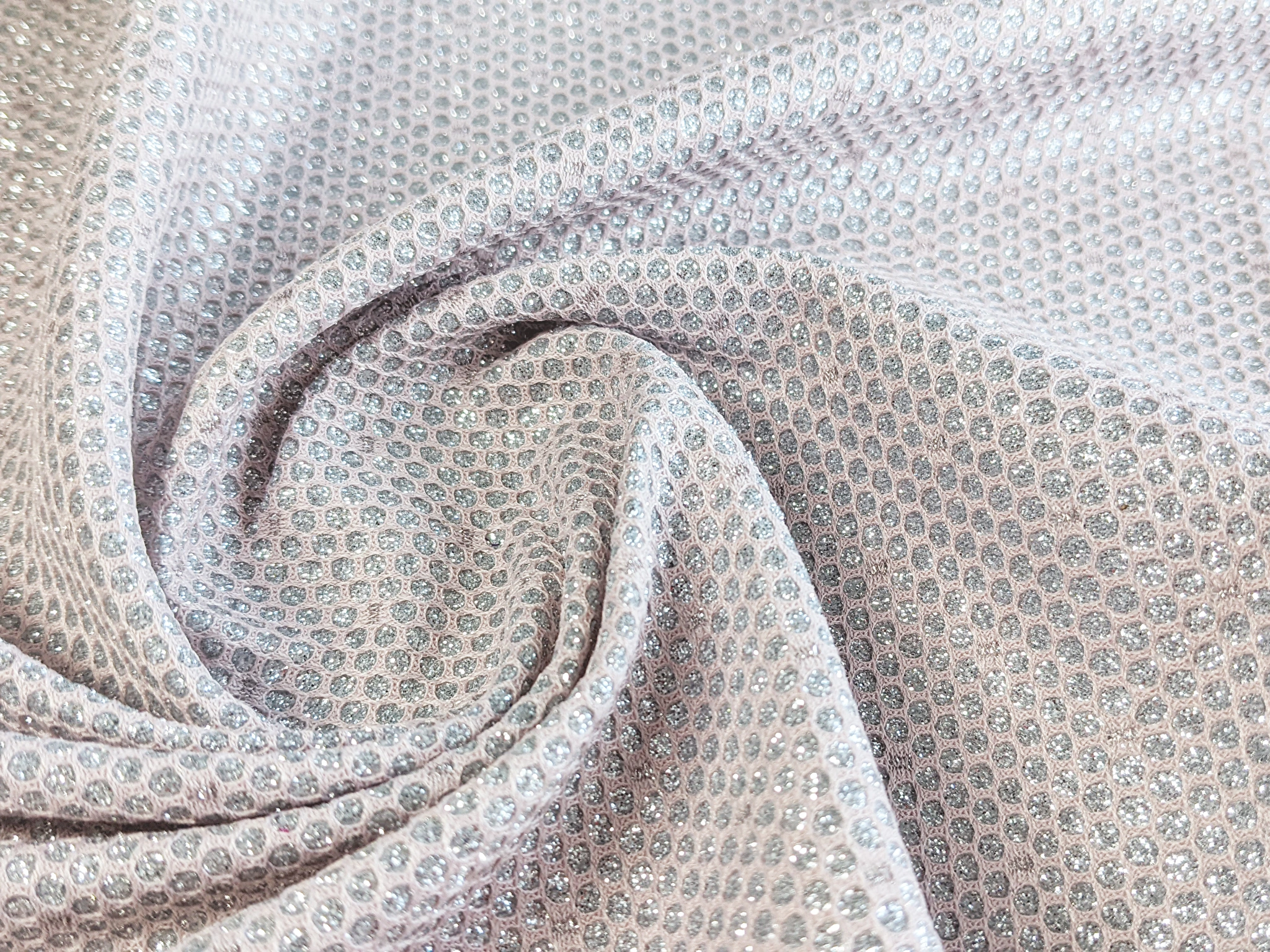 Трикотаж диско - мерехтливий матеріал з фактурною лицьовою стороною і гладким, шовковистим виворотом. Фактура і блиск по лицьовому боці досягнуті шляхом переплетення основної та металізованої ниток та глітера. Тканина непрозора на тілі, злегка еластична, практично не мнеться, при драпіруванні лягає в м'які, формотримаючі складки.