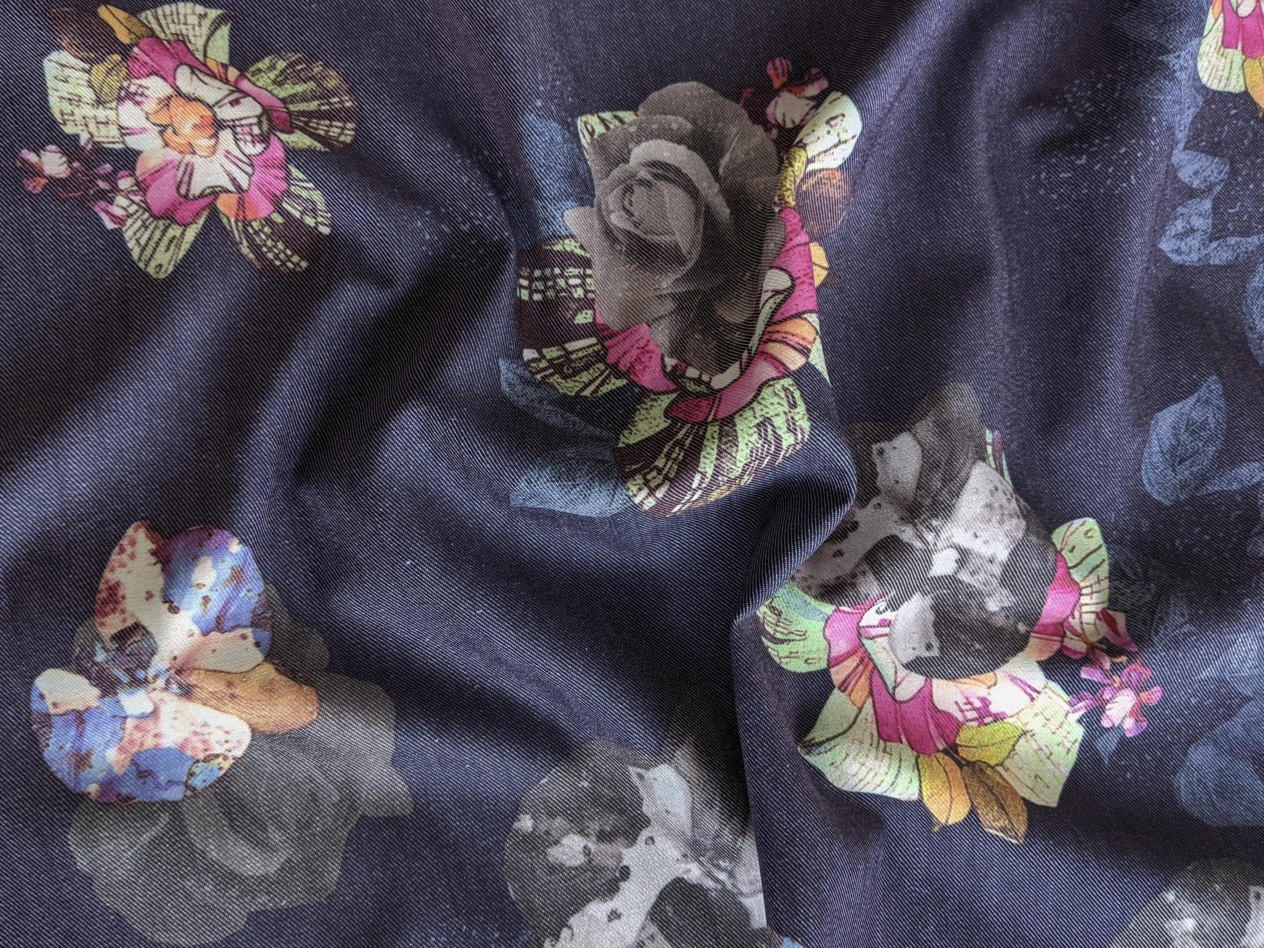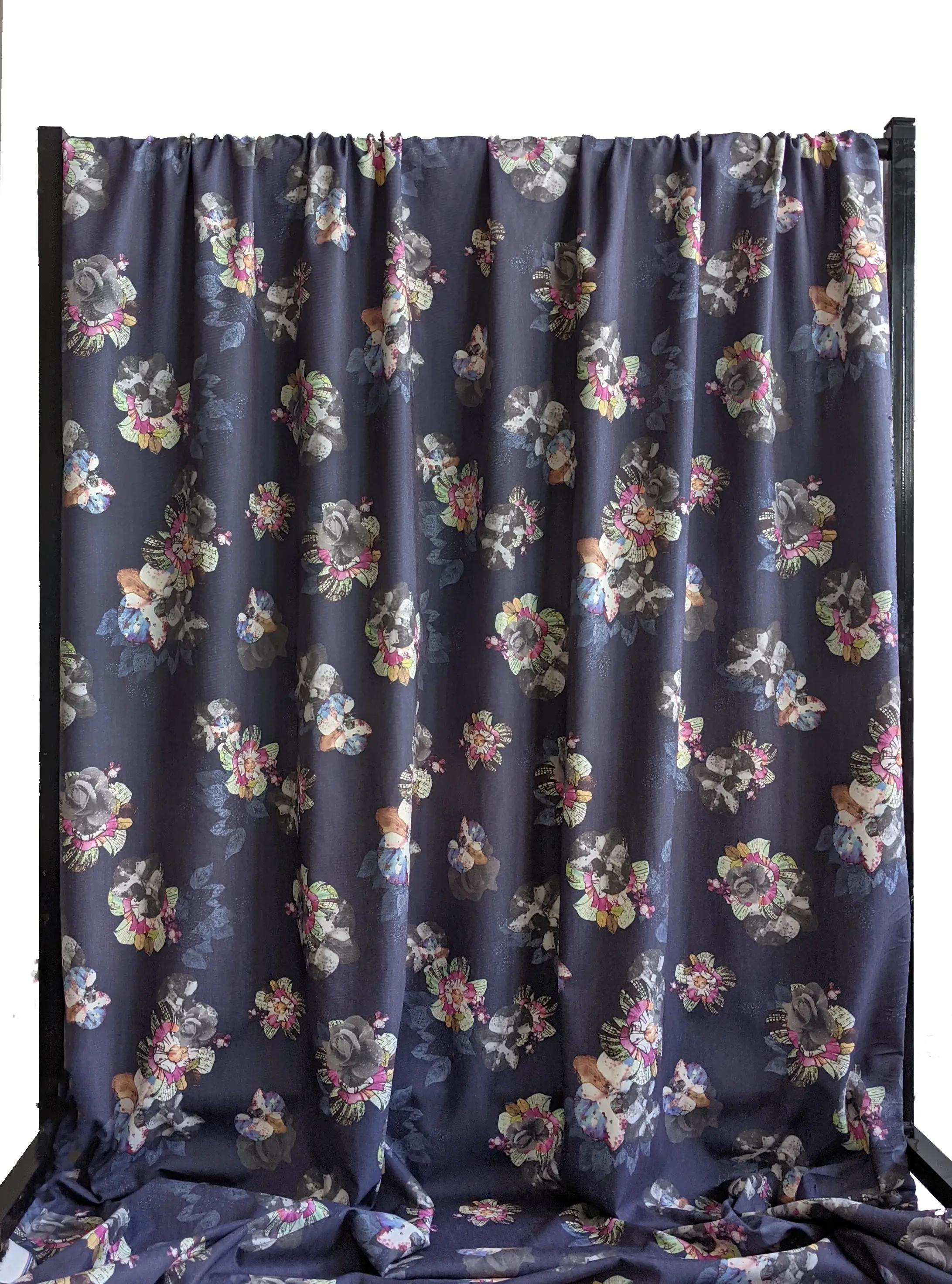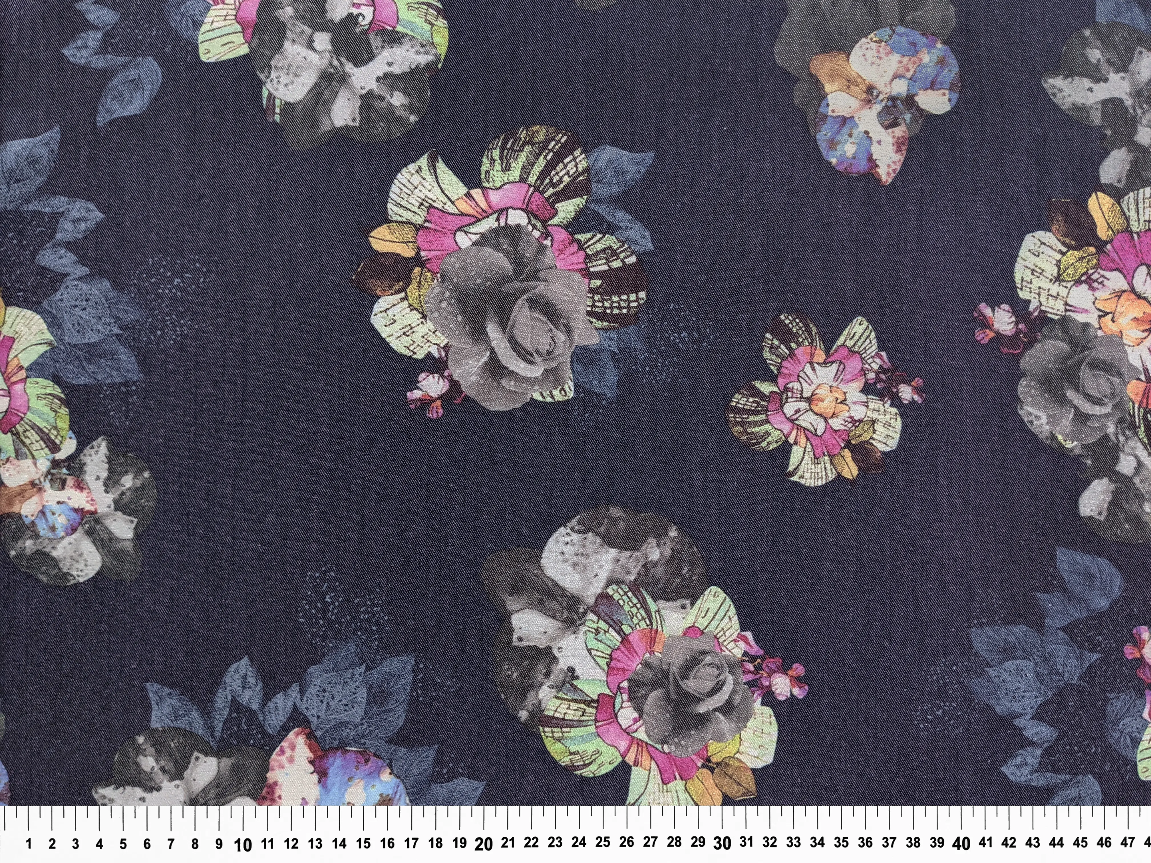 Щільна джинсова тканина з нанесеним квітковим малюнком. Має діагональне плетіння на лицьовій стороні, трохи еластичний. Не просвічується і не мнеться. У складі має котон і трохи спандекса. Поліестер робить тканину практичною і зносостійкою. Застосовується для пошиття літніх суконь, сорочок, жакетів та еко сумок.