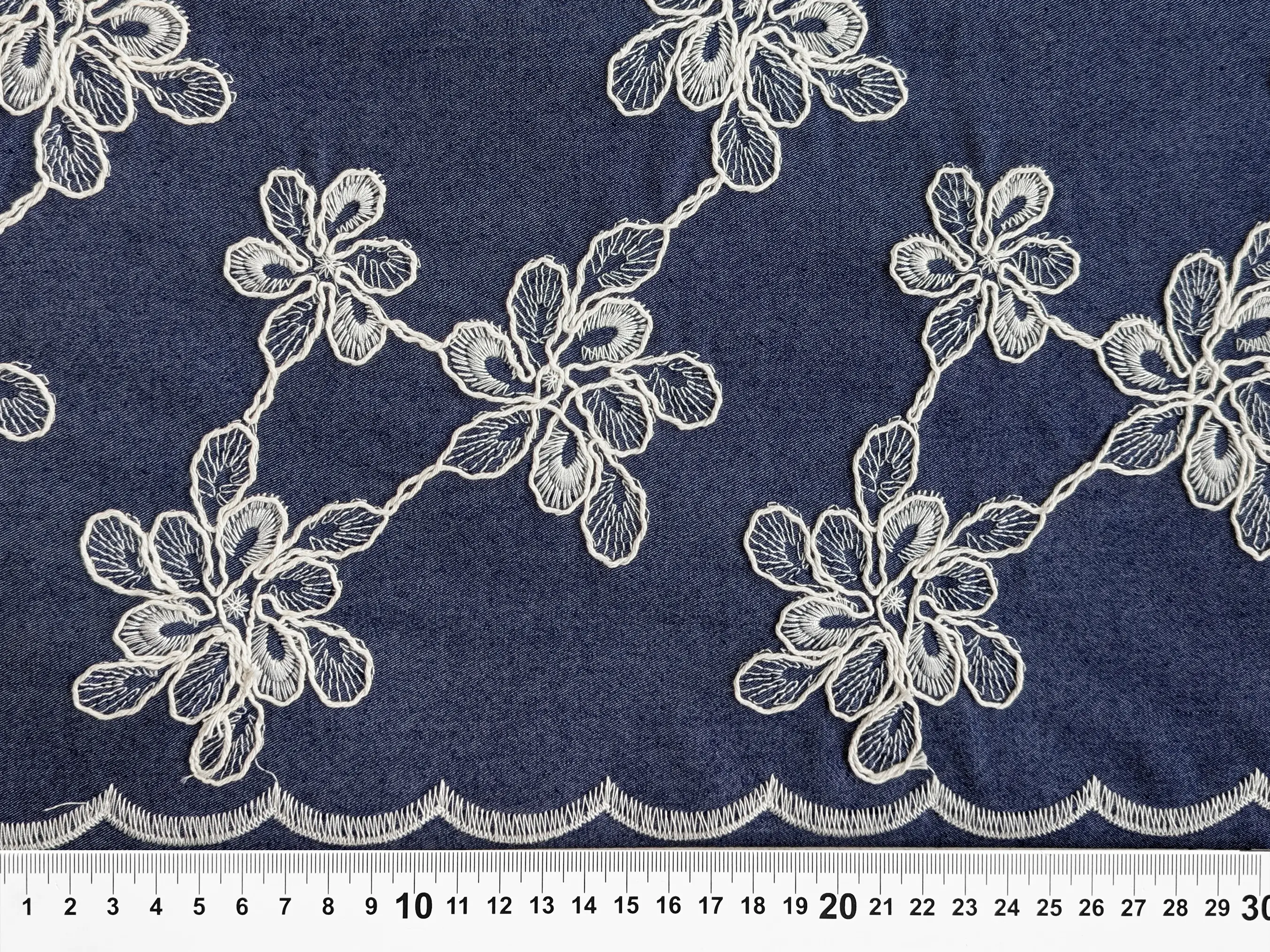 Джинс вишивка - ця тканина являє собою тонкий денім з додаванням віскози, що робить її більш м'якою і приємною на дотик. Додатково тканина прикрашена делікатною квітковою вишивкою, яка надає виробу вишуканий і оригінальний вигляд. Матеріал не просвічується, має легку еластичність по ширині і красиво лягає в складки. Завдяки натуральним волокнам полотно може злегка мнеться.