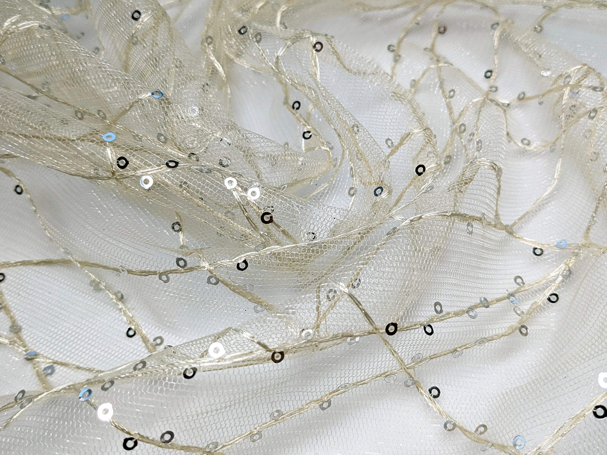 Фатин паєтка - це ажурне, тонке полотно, яке злегка жорстке і завдяки цьому тримає форму. З лицьового боку тканини хаотично нашиті дрібні паєтки, які надають ніжності та створюють святковий настрій.