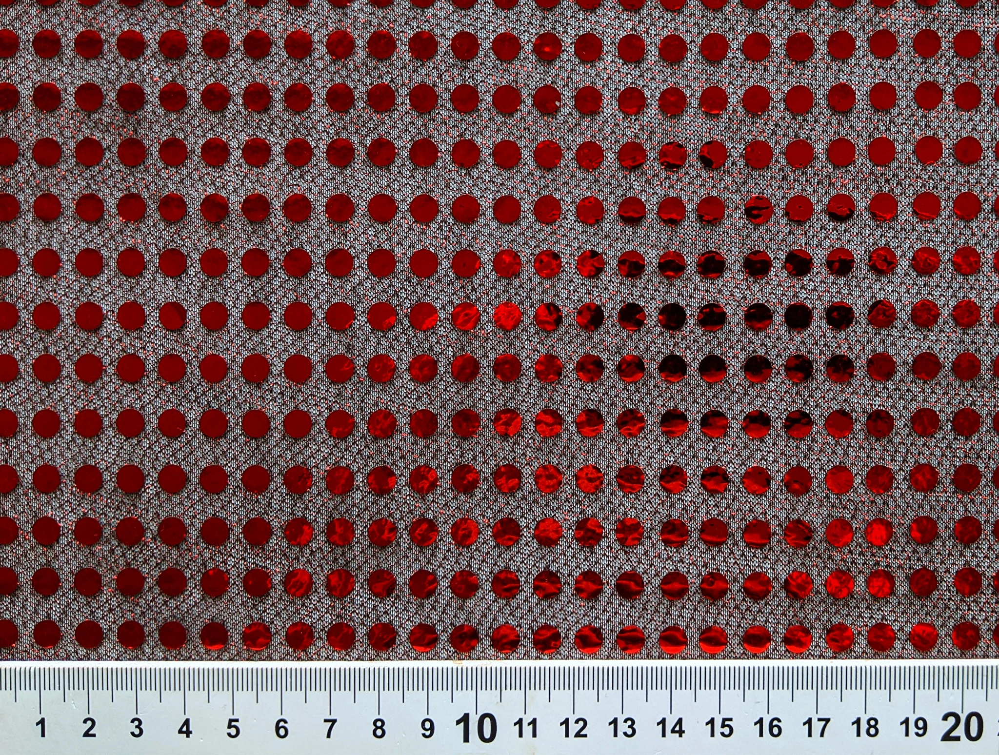 Круглі паєтки нанесені лінією на сітчасту основу по всьому полотну. Тканина не тягнеться, блищить і має просвіт, тому для пошиття суконь або спідниць потрібна додаткова підкладкова тканину. Паєтки щільно прилягають до сітки і не обсипаються. Тканина не мнеться і вимагає делікатного догляду. Застосовується для пошиття виробів танцювально-карнавального напрямку.