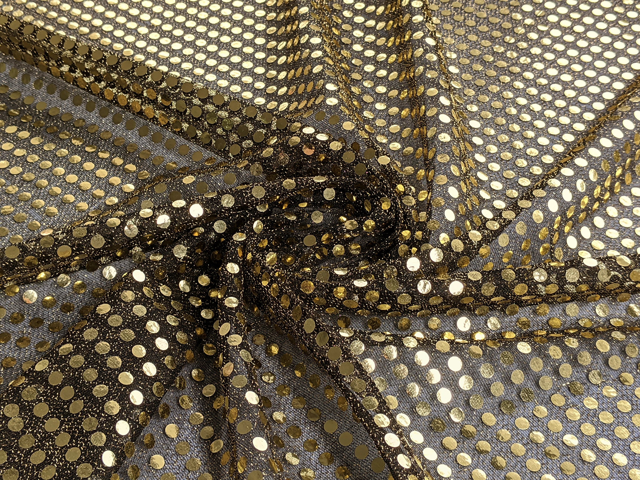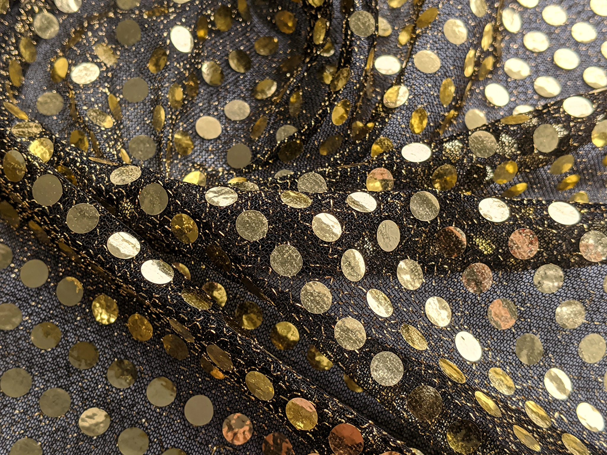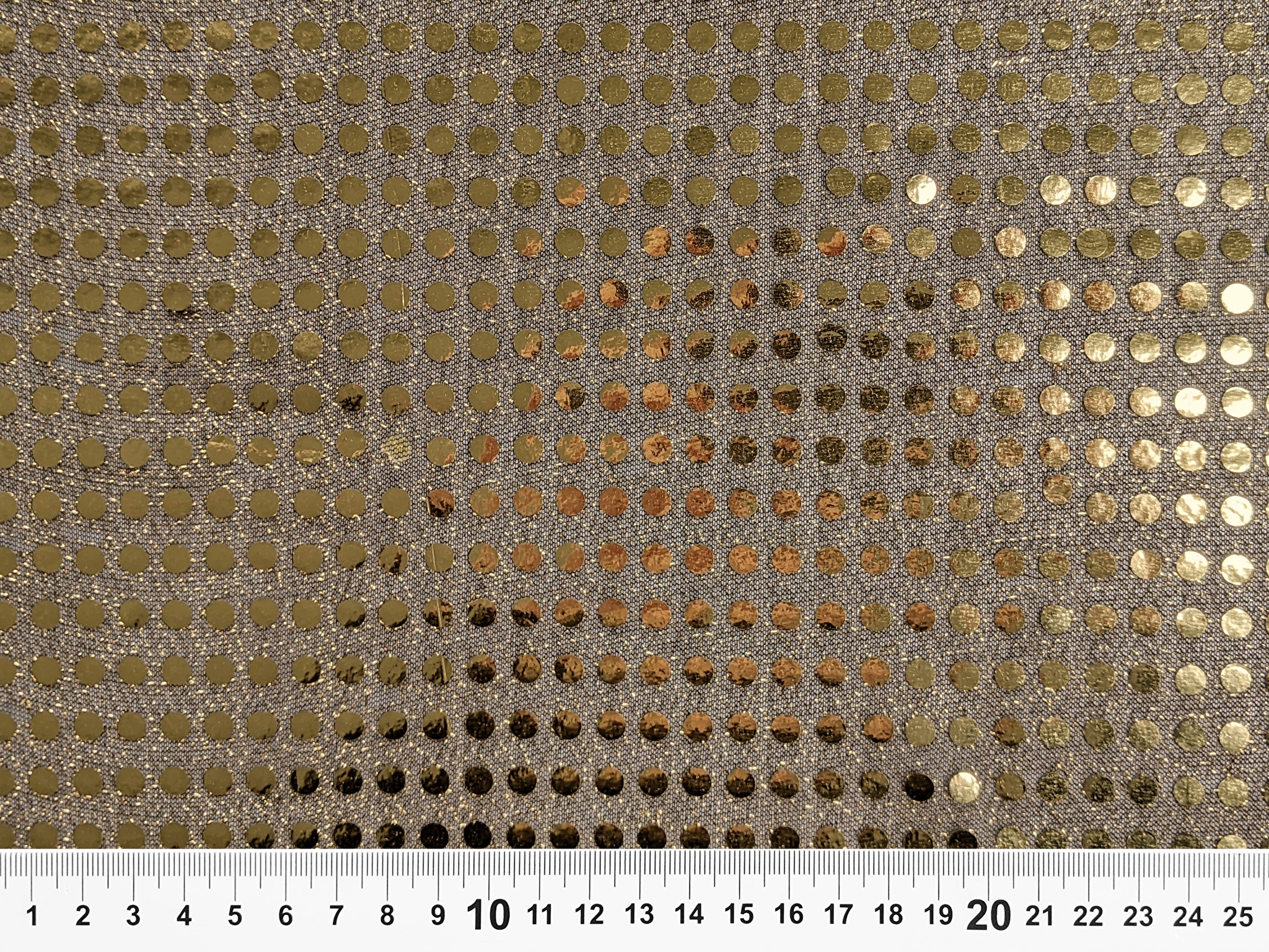 Круглі паєтки нанесені лінією на сітчасту основу по всьому полотну. Тканина не тягнеться, блищить і має просвіт, тому для пошиття суконь або спідниць потрібна додаткова підкладкова тканину. Паєтки щільно прилягають до сітки і не обсипаються. Тканина не мнеться і вимагає делікатного догляду. Застосовується для пошиття виробів танцювально-карнавального напрямку.