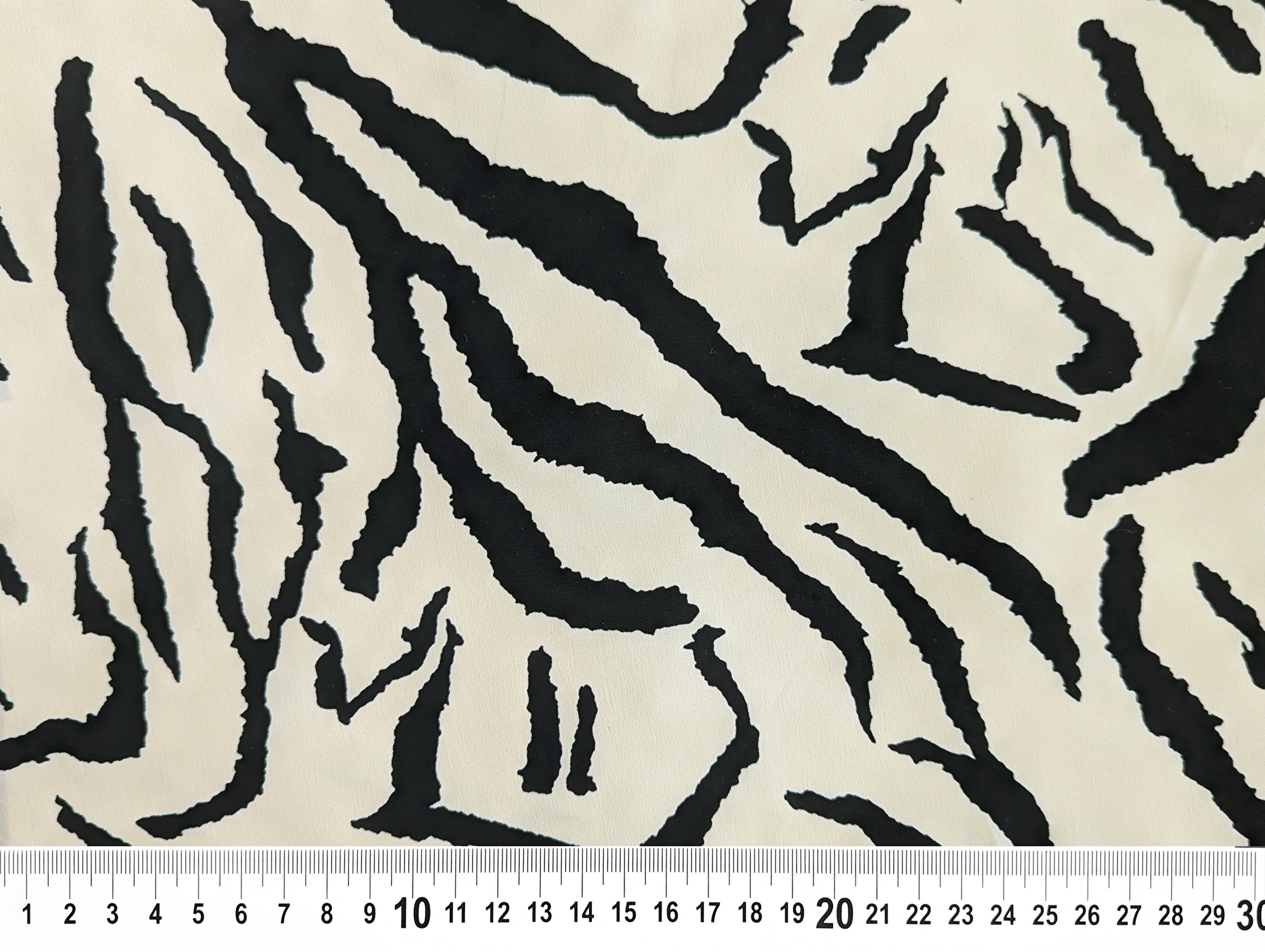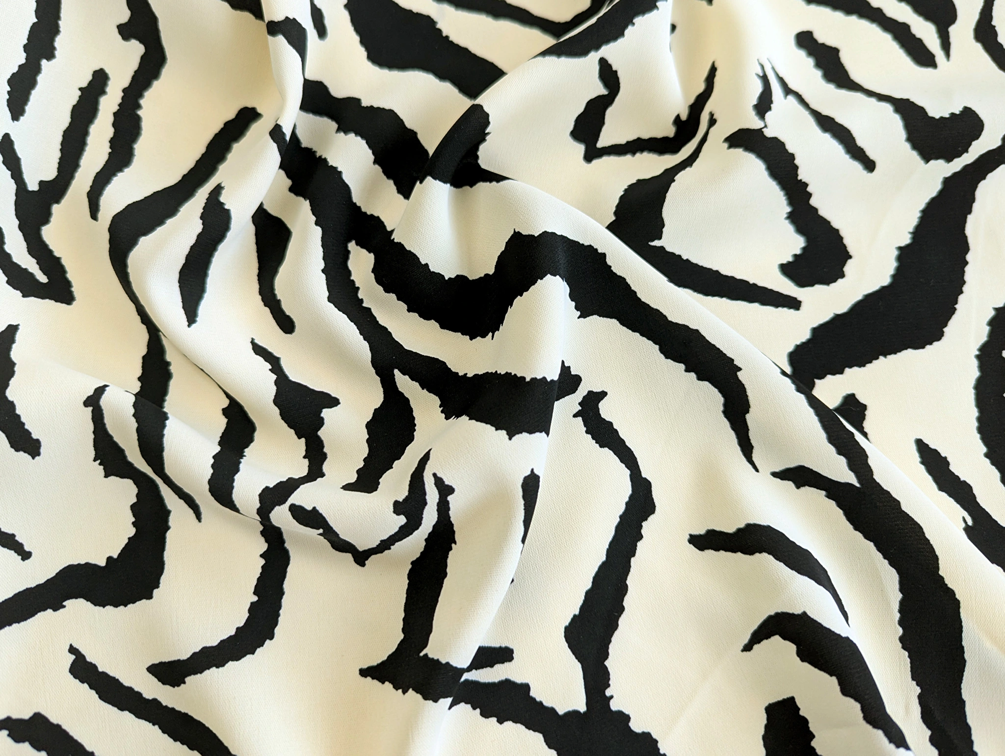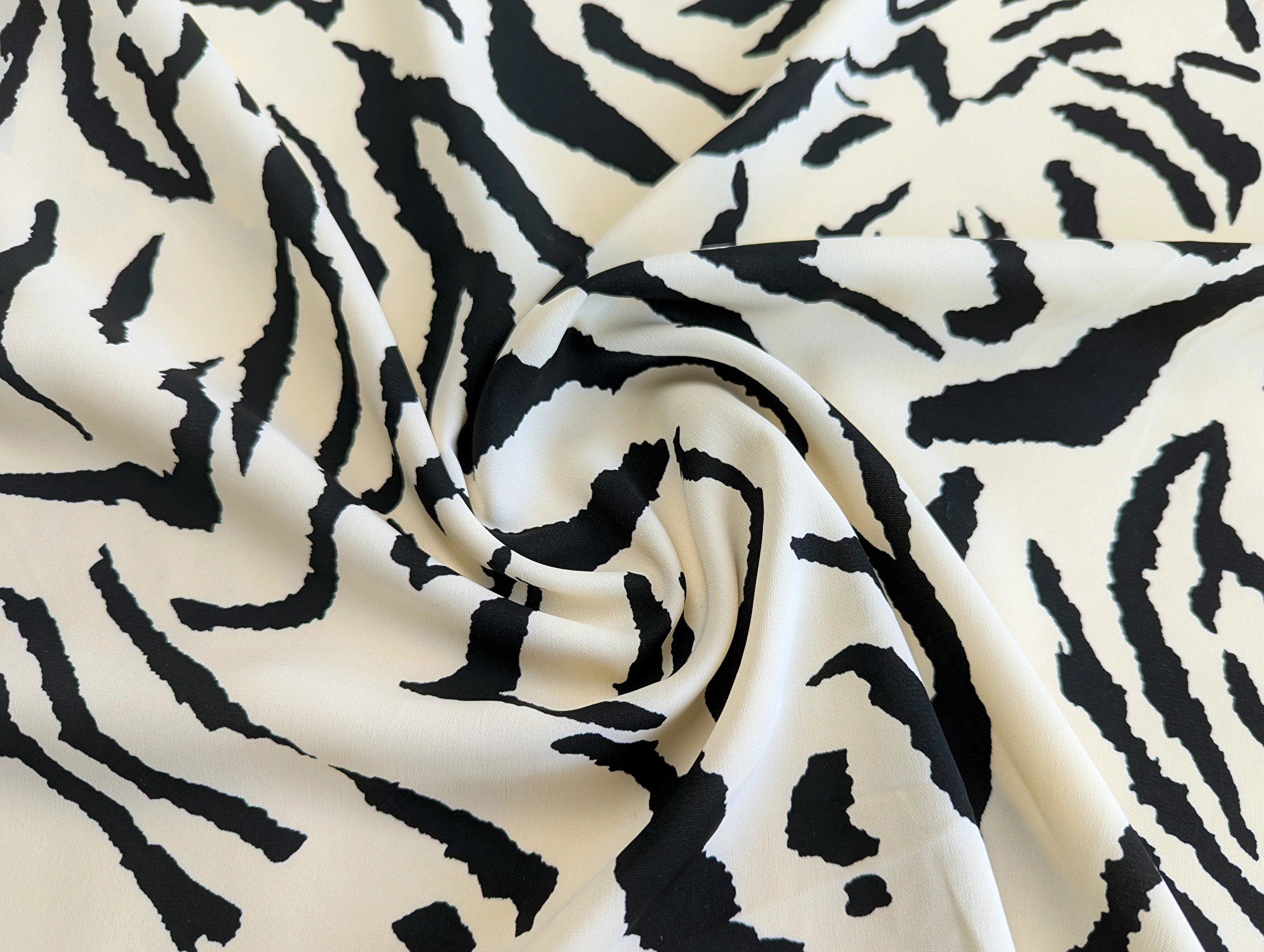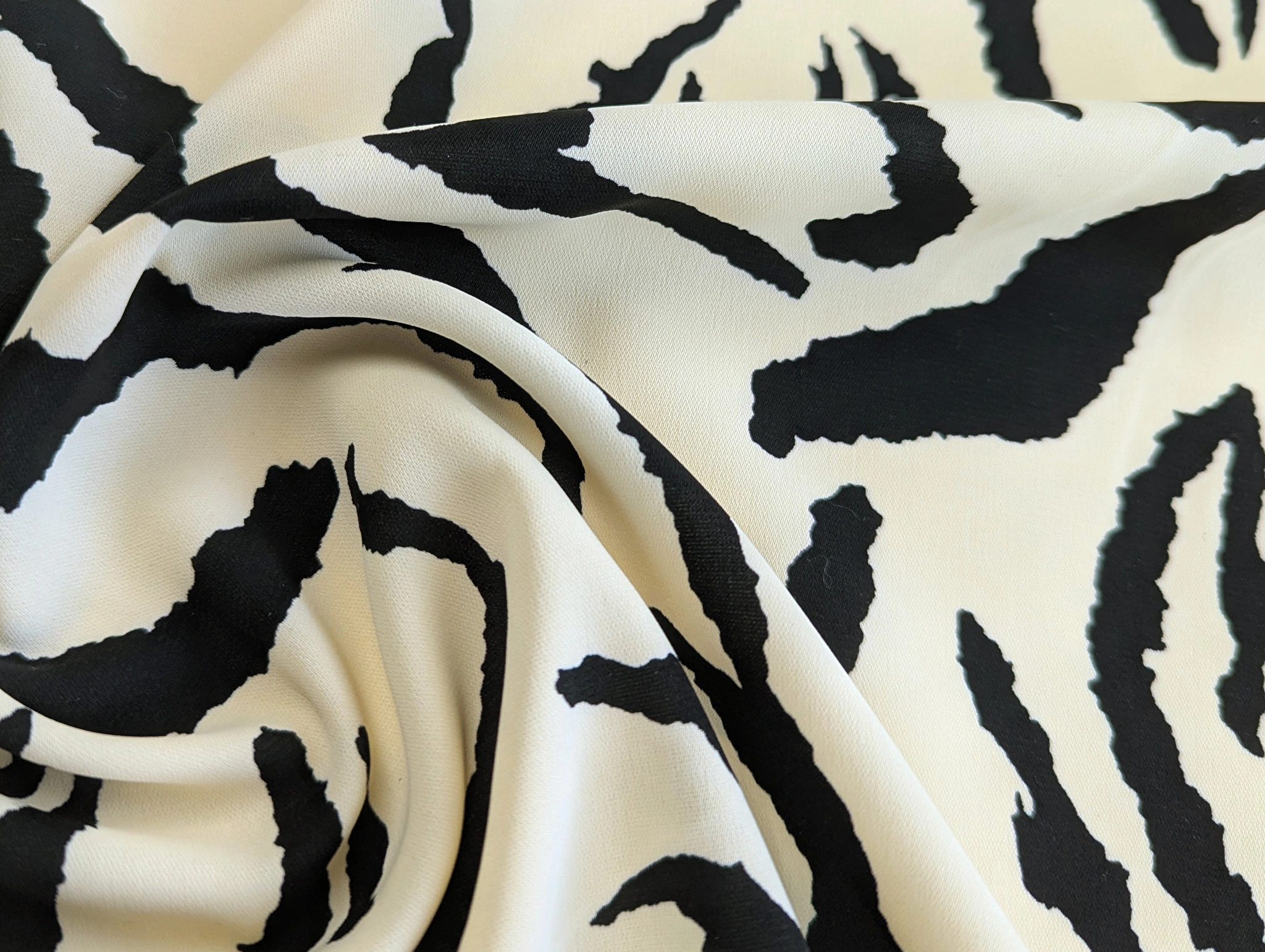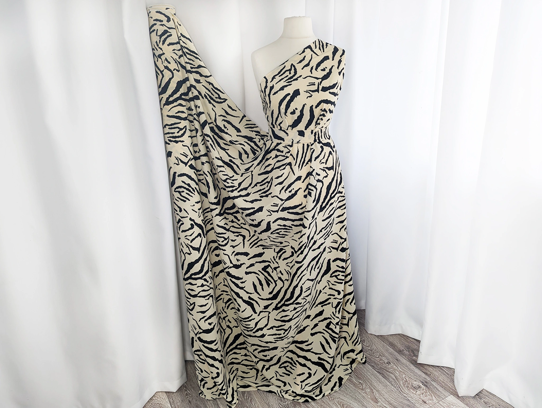 Костюмна шовковиста – це гладка, легка, але міцна тканина. Полотно дуже красиво лягає складками, не заминається. На світлі трохи просвічується. У складі має невелику кількість спандексу, за рахунок цього тканина трохи тягнеться. Шовковиста костюмка ковзна і приємна до тіла.