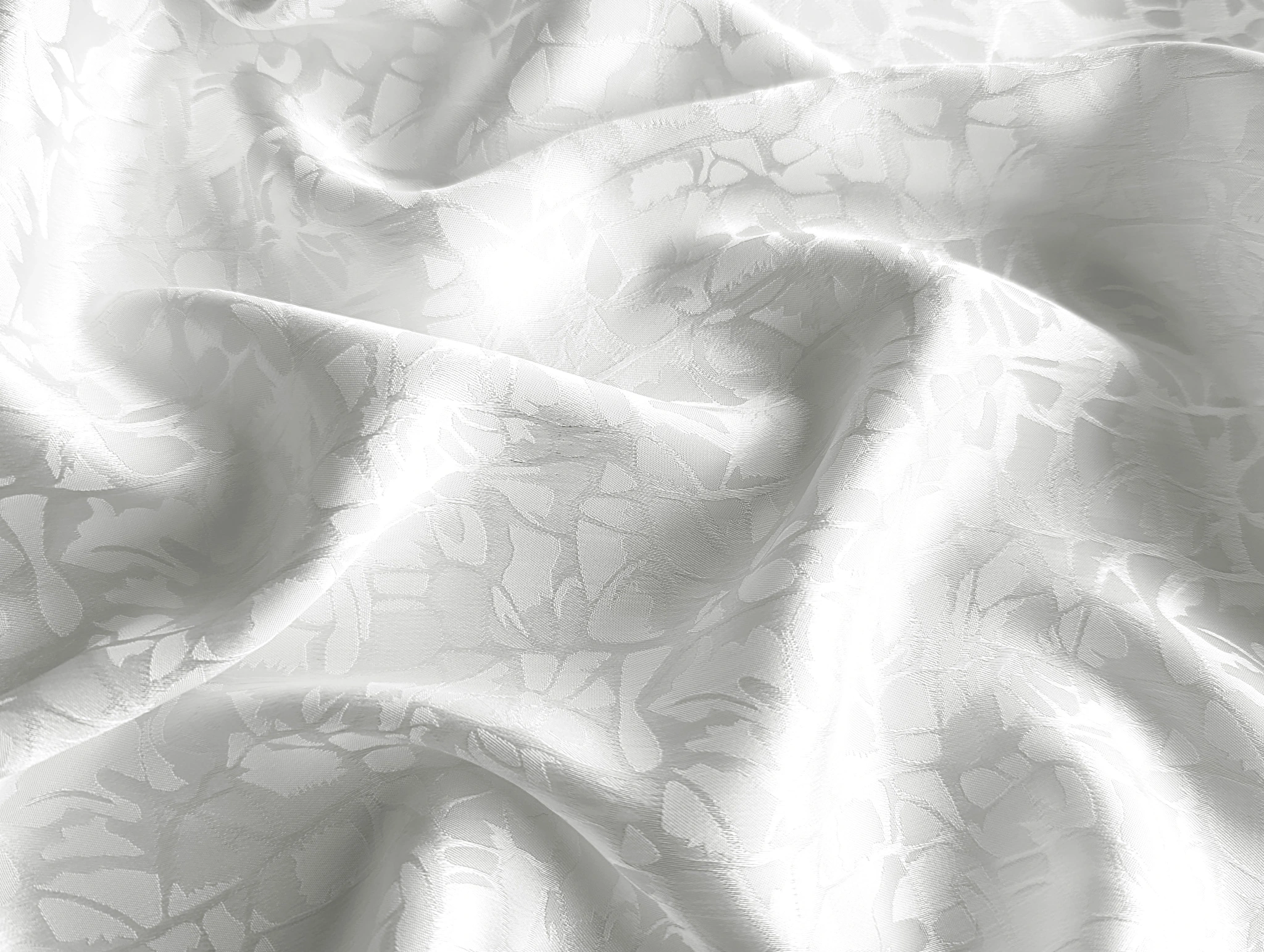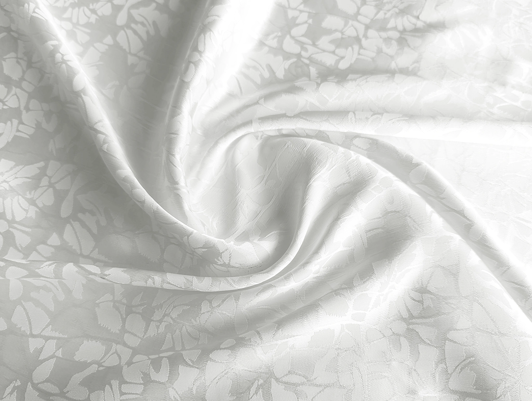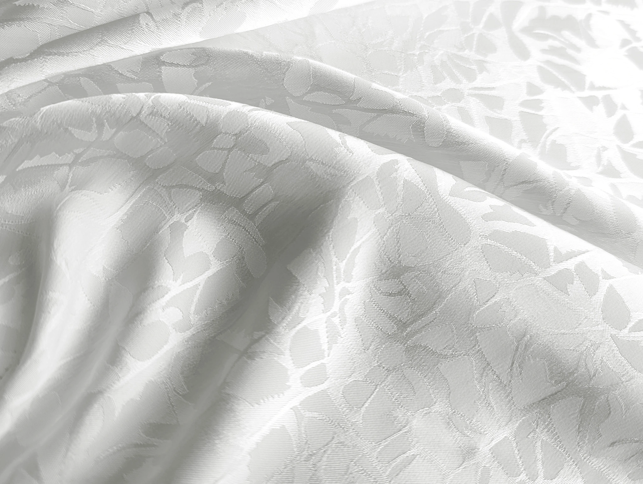 Костюмна Бель жакард - тонкий, струмливий шовковистий жакард з благородним сатиновим блиском. Тканина м'яка на дотик, непрозора на тілі, не мнеться, легка еластичність присутня по ширині полотна. Матеріал ковзний, легко драпірується, утворюючи м'які складки.