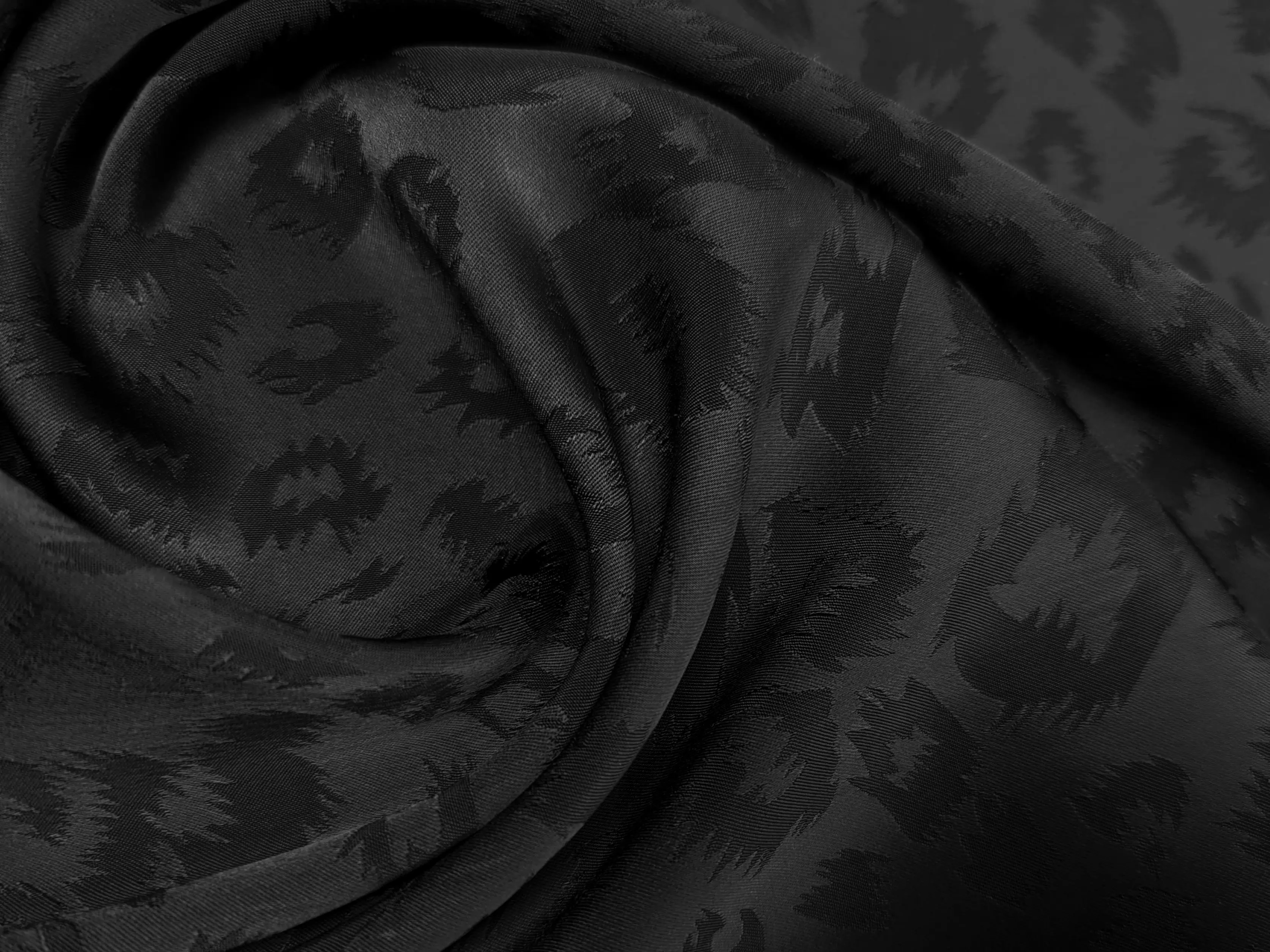 Костюмна Бель жакард - тонкий, струмливий шовковистий жакард з благородним сатиновим блиском. Тканина м'яка на дотик, непрозора на тілі, не мнеться, легка еластичність присутня по ширині полотна. Матеріал ковзний, легко драпірується, утворюючи м'які складки.