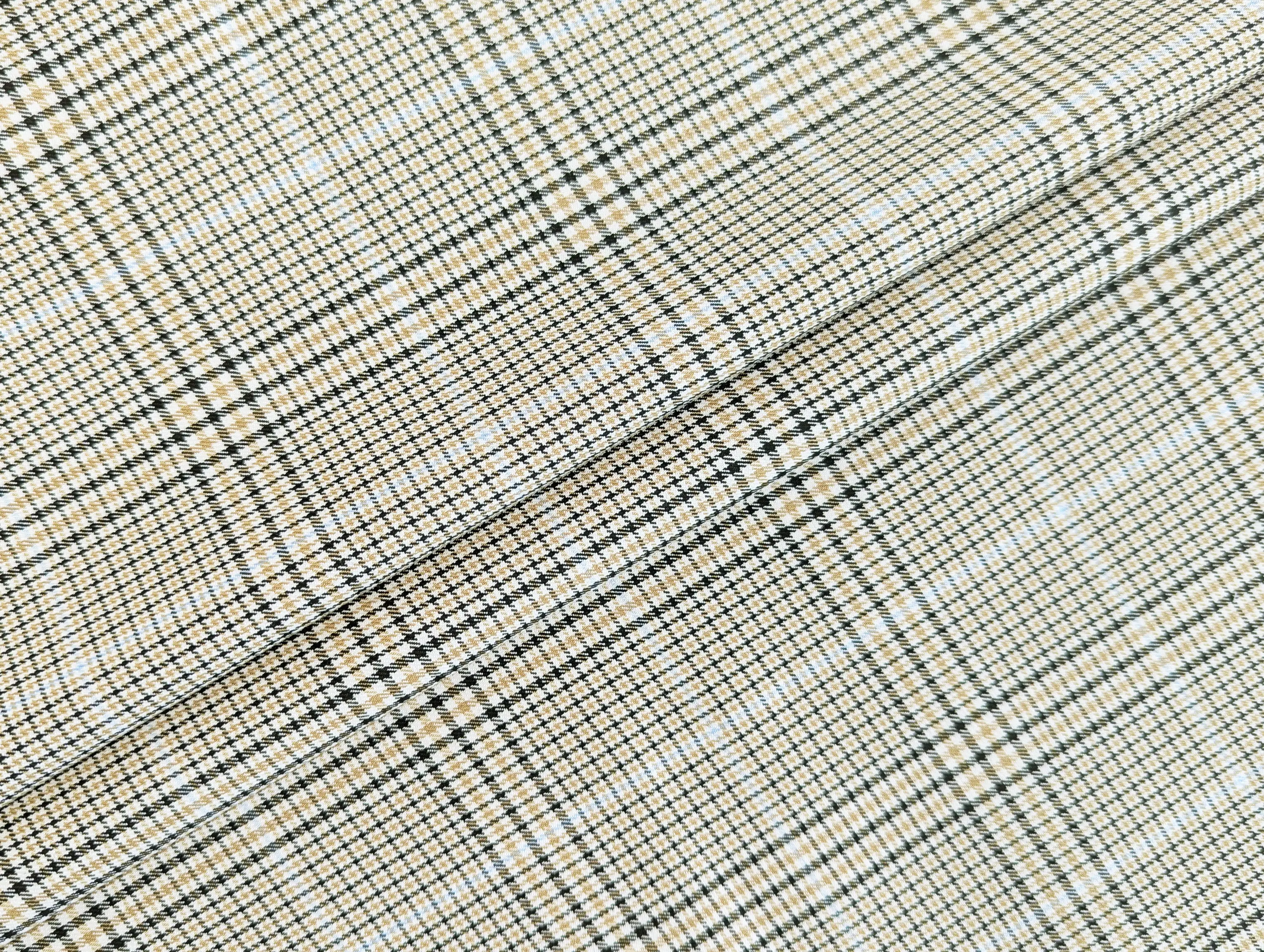 Клітина Шотландія – костюмна тканина середньої щільності. На дотик м'яка, має трохи шорстку фактуру і дрібний діагональний рубчик. У складі матеріалу присутні натуральні та синтетичні волокна. Костюмний тіар має легку еластичність по ширині полотна, не мнеться, добре драпірується.