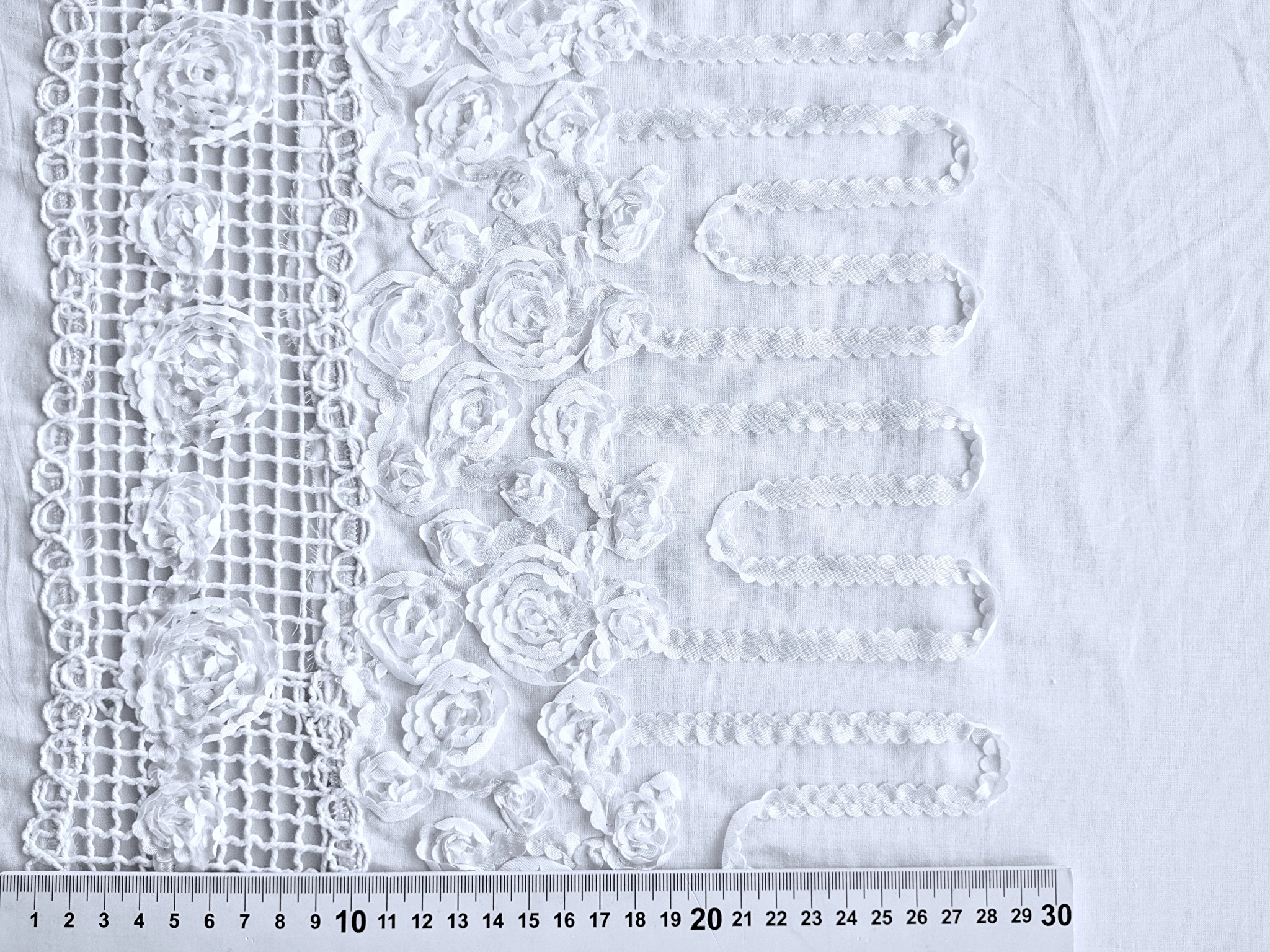 Тканина котон вишивка виконана у вигляді двостороннього купона. Дизайн плетіння нагадує мереживо, що надає виробам жіночний, оригінальний і романтичний вид. Також на вишивці зверху нашита стрічка у вигляді хвилеподібного візерунка. Сукня з котону вишивки стане ідеальним рішенням у спекотну погоду. До переваг тканини можна віднести: гігроскопічність, легкий догляд, повітропроникність, легкість, м'якість.