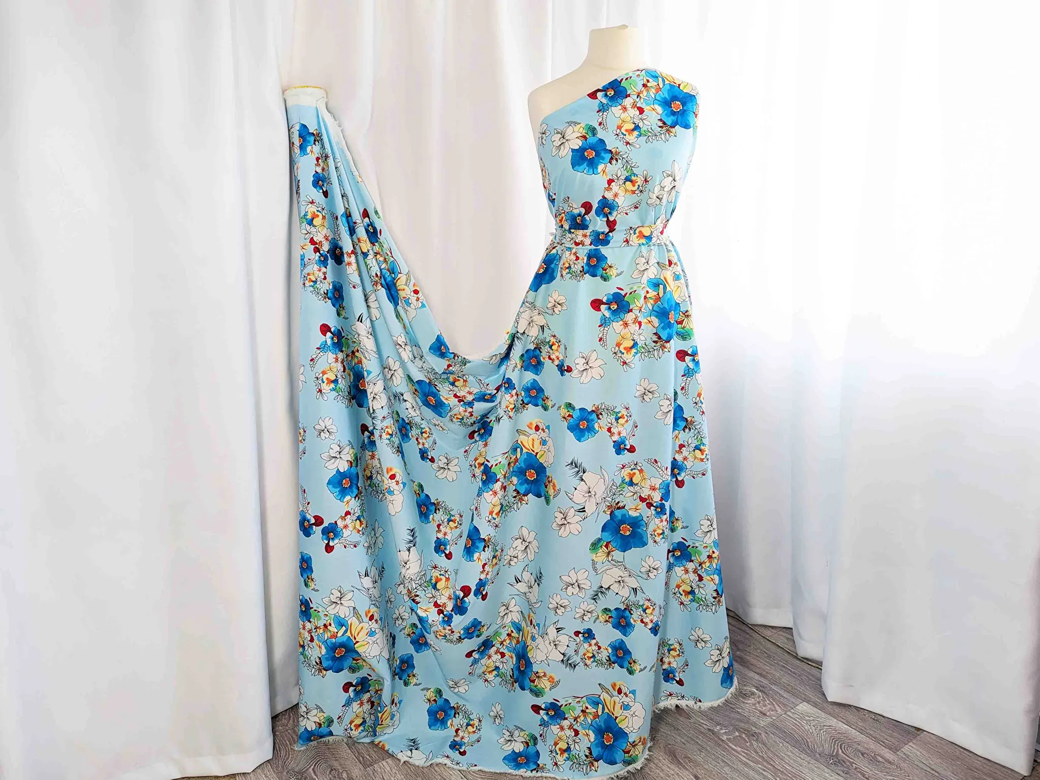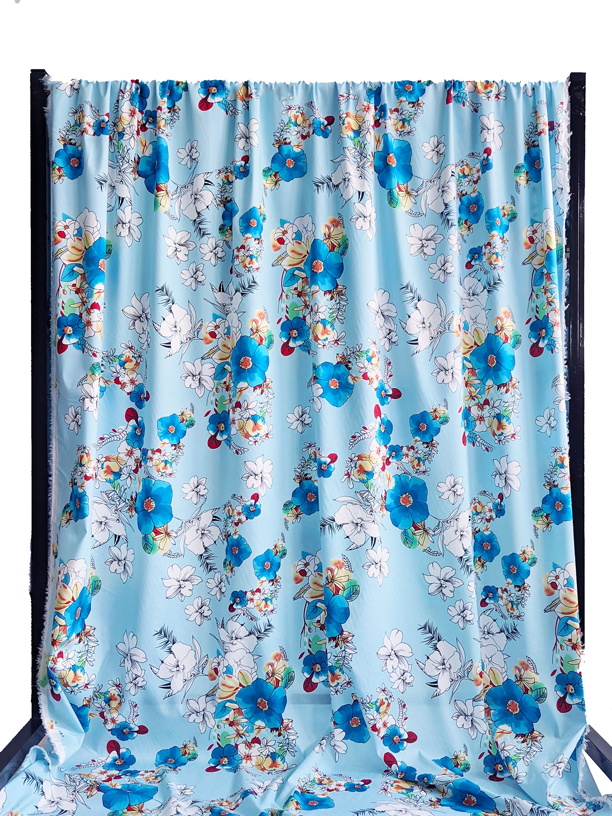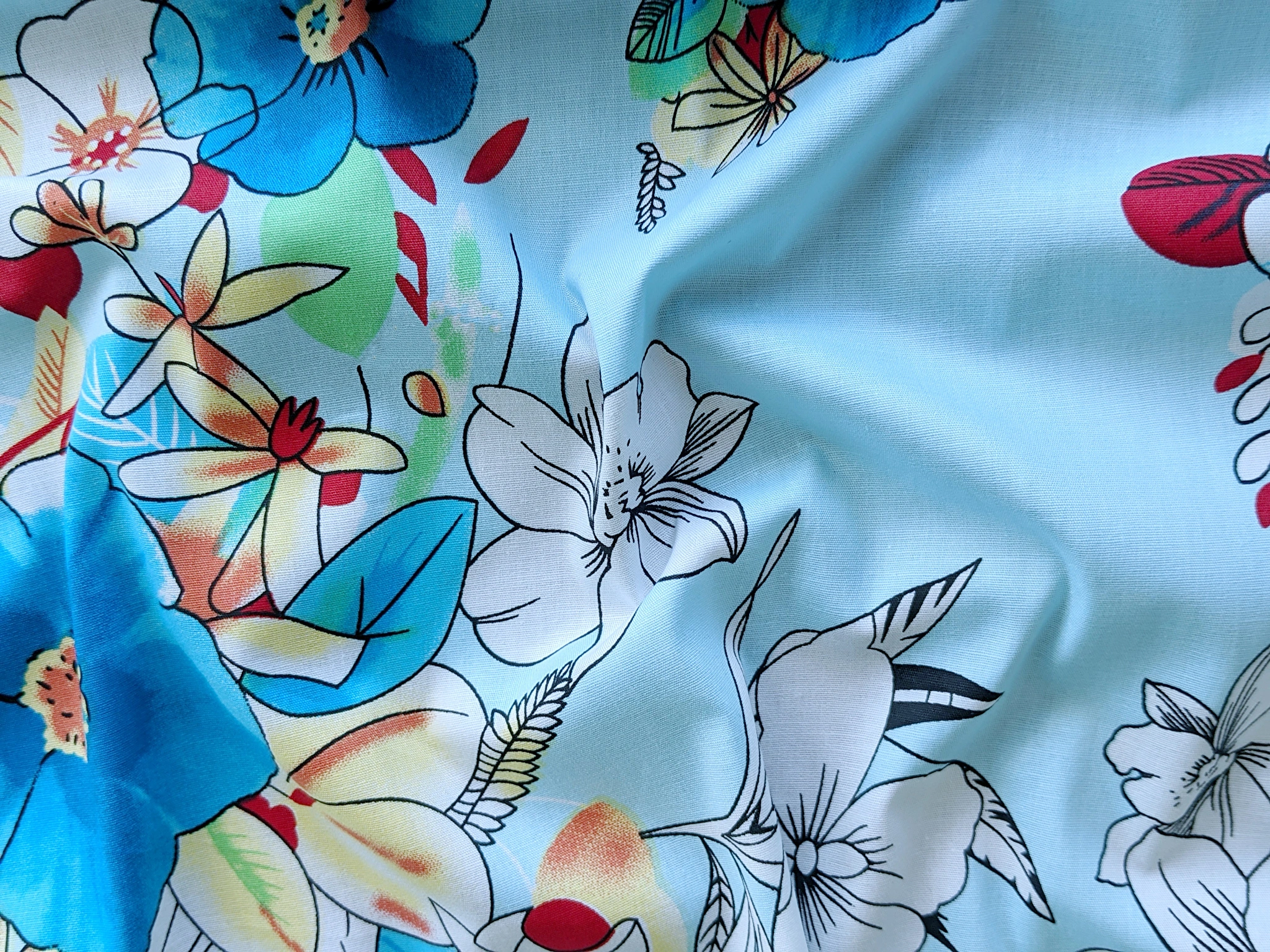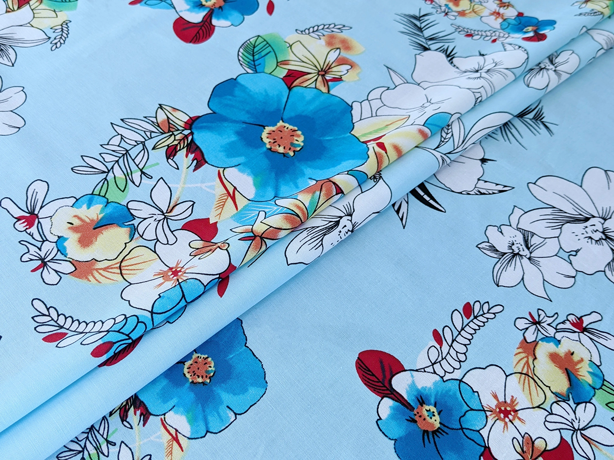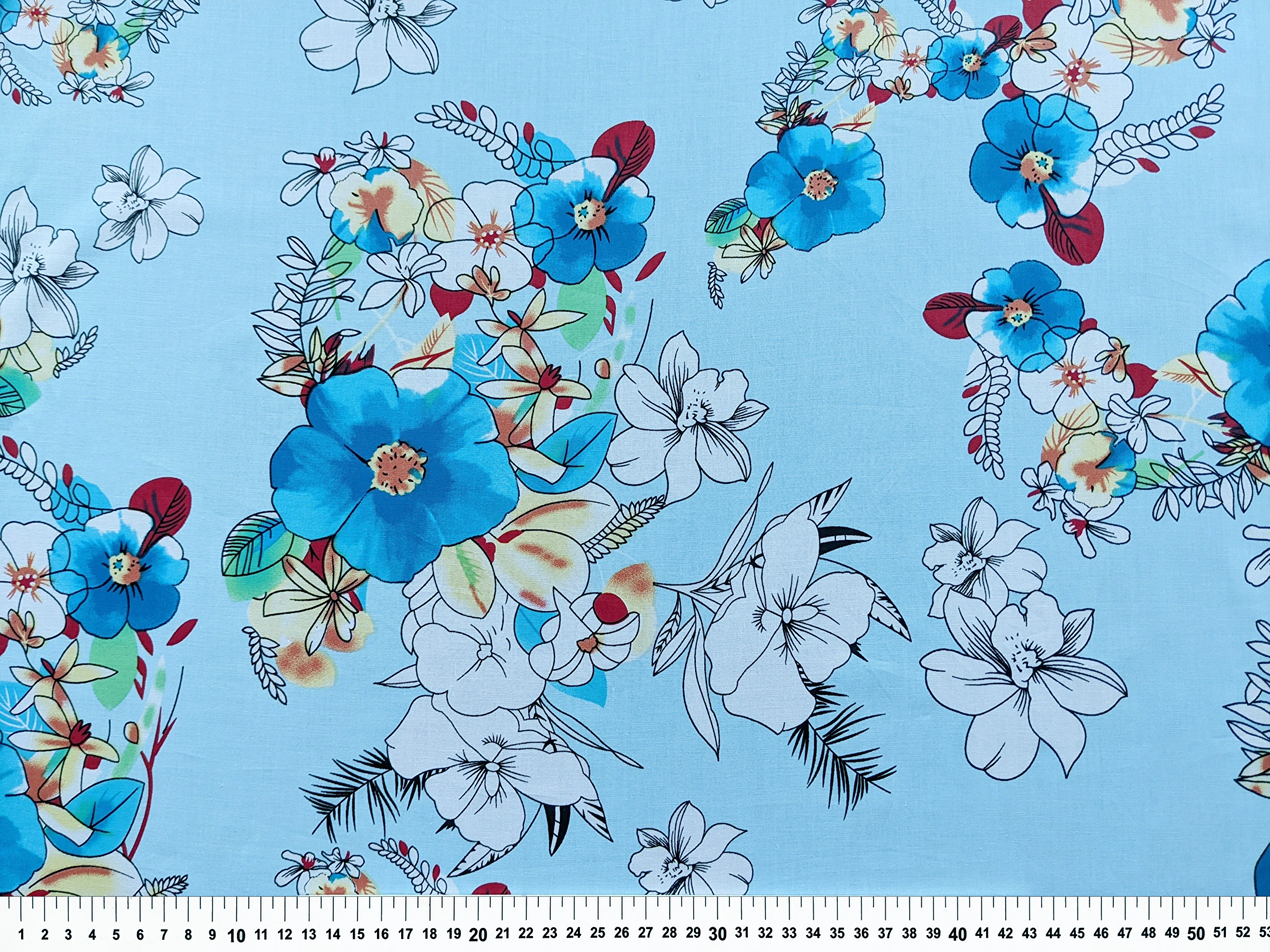 Котон стрейчевий малюнок великі квіти, блакитний (відріз 1,1 м) (с1801, 1712101, д1 цв3)