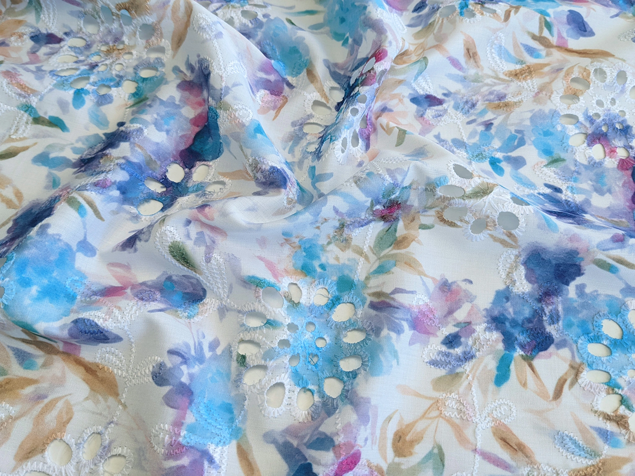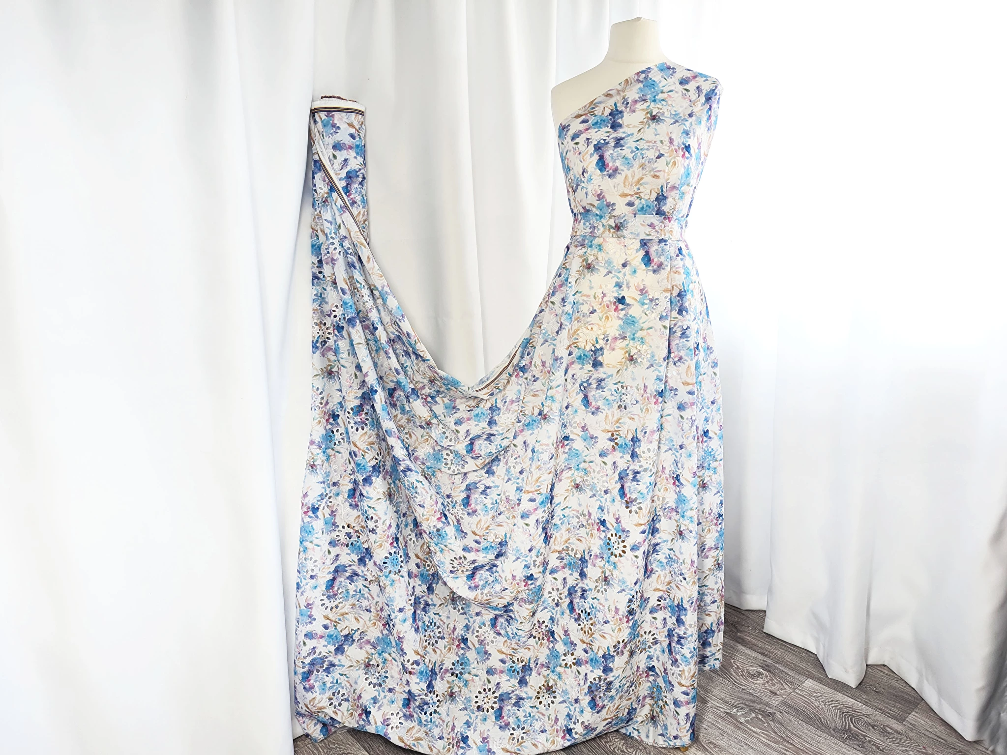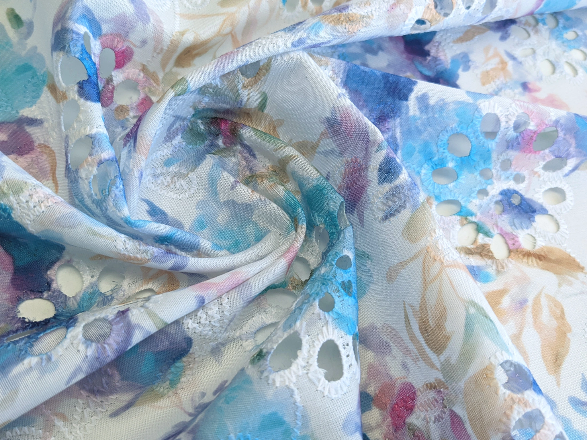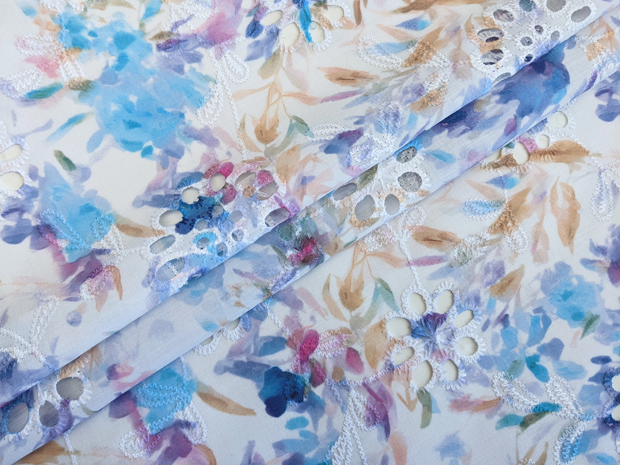 Коттон вишивка - це легкий і тонкий матеріал, поверхня якого розшита квітковими мотивами і прикрашена фігурним прорізним малюнком у вигляді дірочок. Тканина без еластану, не мнеться, під час драпірування набуває повітряної стійкої форми. За рахунок наскрізної перфорації матеріал просвічує, тому для деяких виробів буде необхідна підкладка.