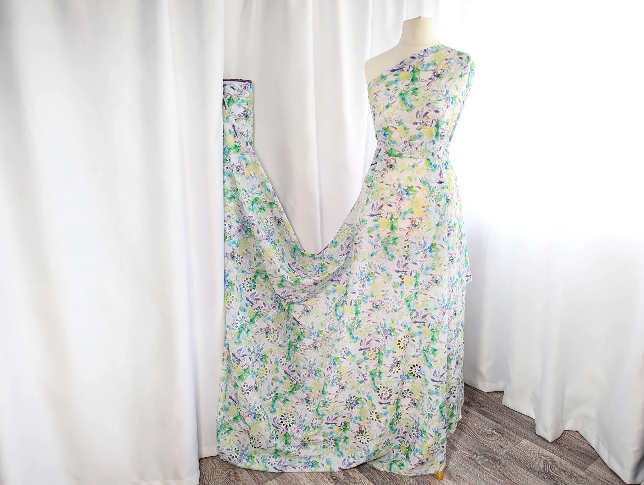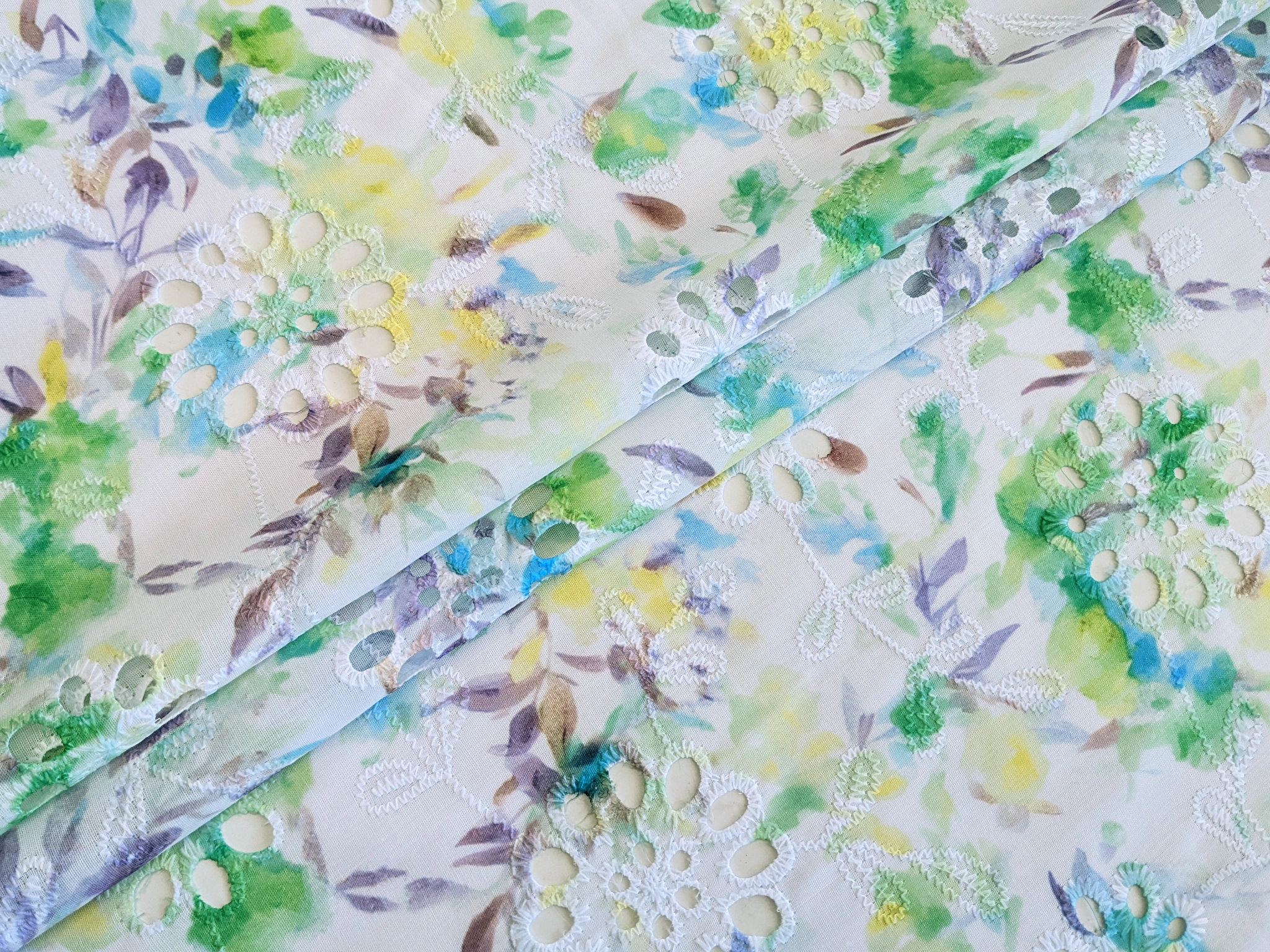 Коттон вишивка - це легкий і тонкий матеріал, поверхня якого розшита квітковими мотивами і прикрашена фігурним прорізним малюнком у вигляді дірочок. Тканина без еластану, не мнеться, під час драпірування набуває повітряної стійкої форми. За рахунок наскрізної перфорації матеріал просвічує, тому для деяких виробів буде необхідна підкладка.