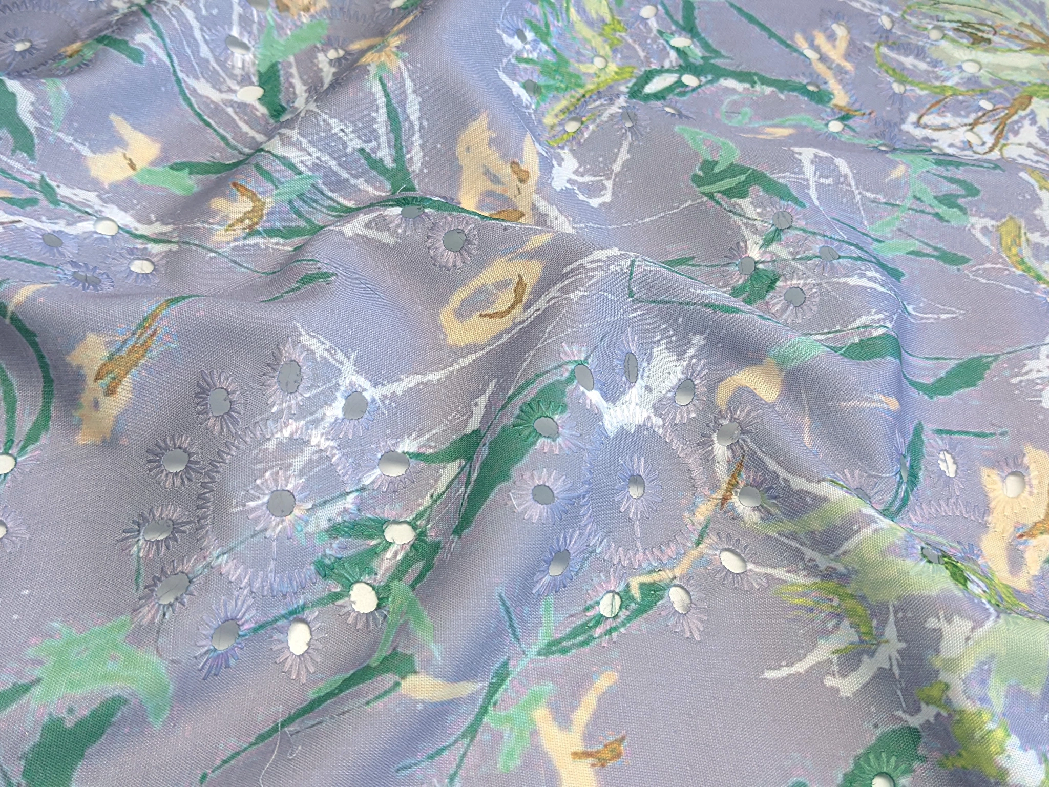 Коттон вишивка - це легкий і тонкий матеріал, поверхня якого розшита квітковими мотивами і прикрашена фігурним прорізним малюнком у вигляді дірочок. Тканина без еластану, не мнеться, під час драпірування набуває повітряної стійкої форми. За рахунок наскрізної перфорації матеріал просвічує, тому для деяких виробів буде необхідна підкладка.
