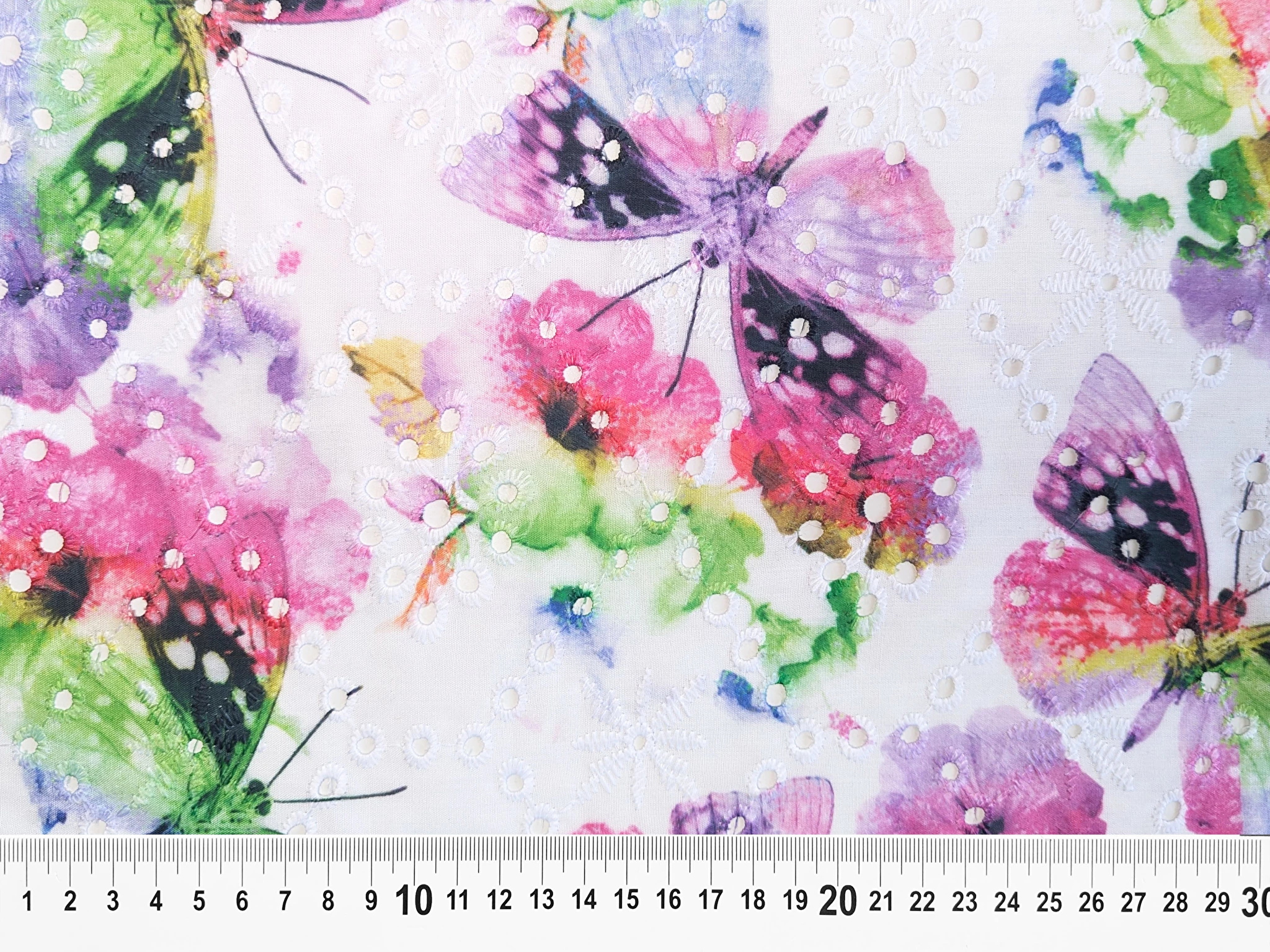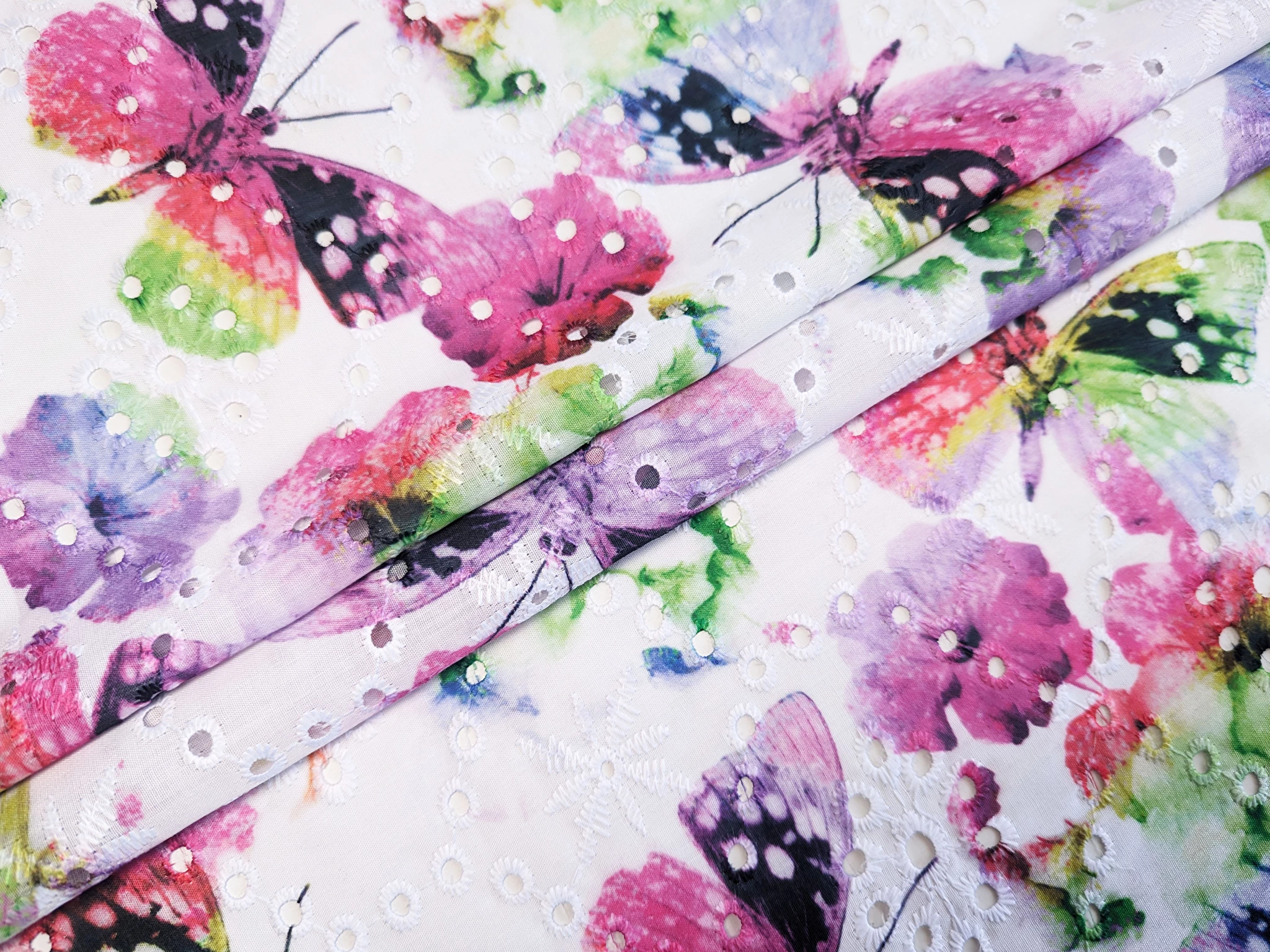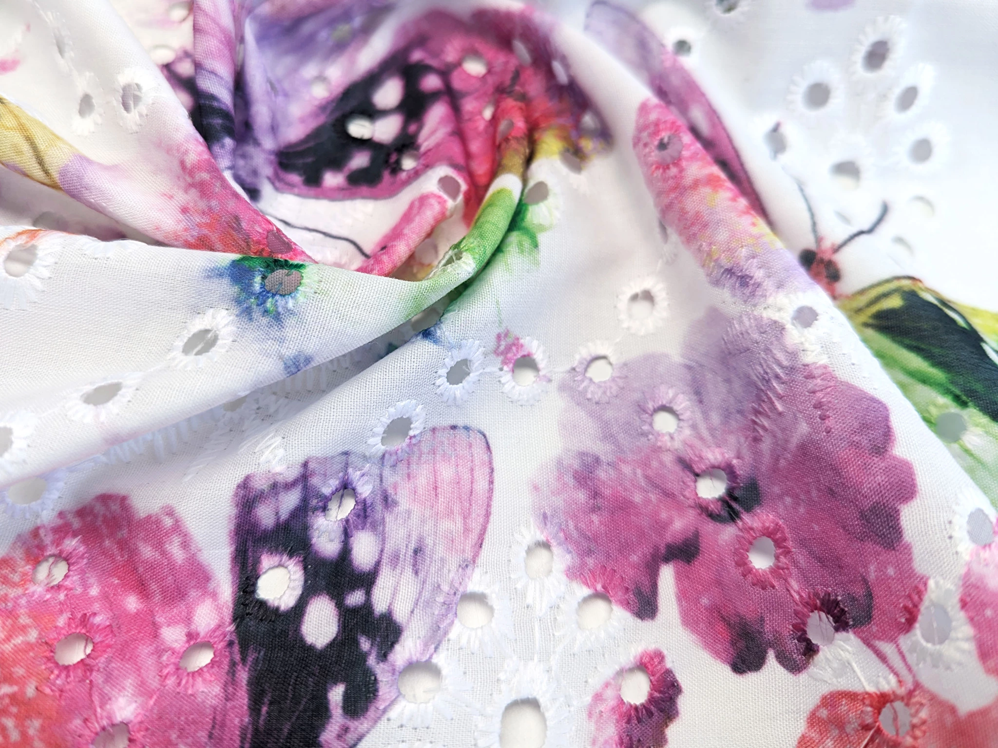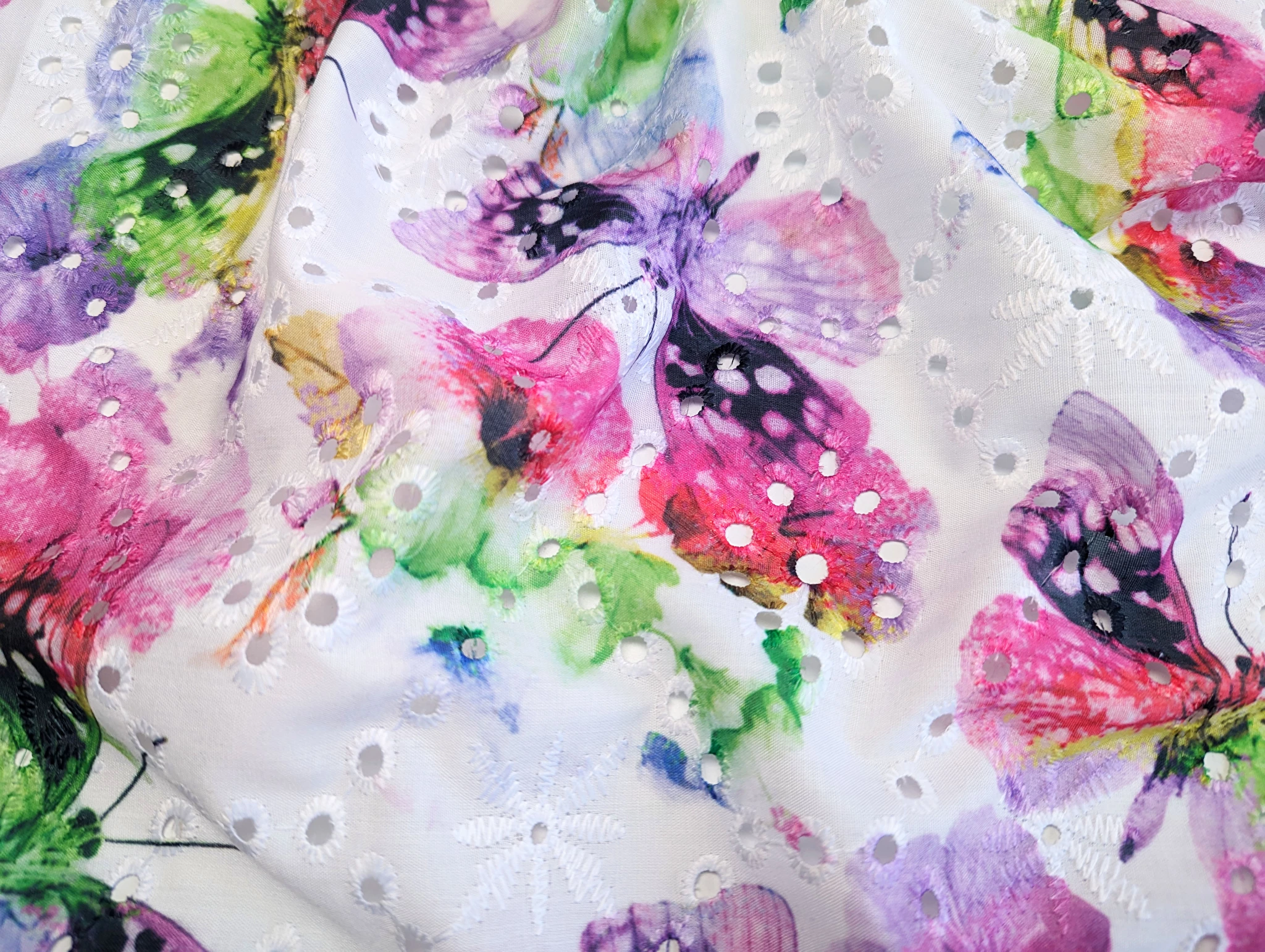 Коттон вишивка - це легкий і тонкий матеріал, поверхня якого розшита квітковими мотивами і прикрашена фігурним прорізним малюнком у вигляді дірочок. Тканина без еластану, не мнеться, під час драпірування набуває повітряної стійкої форми. За рахунок наскрізної перфорації матеріал просвічує, тому для деяких виробів буде необхідна підкладка.