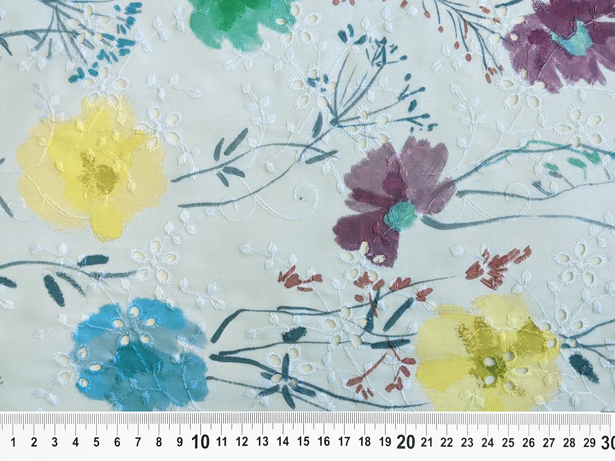 Коттон вишивка - це легкий і тонкий матеріал, поверхня якого розшита квітковими мотивами і прикрашена фігурним прорізним малюнком у вигляді дірочок. Тканина без еластану, не мнеться, під час драпірування набуває повітряної стійкої форми. За рахунок наскрізної перфорації матеріал просвічує, тому для деяких виробів буде необхідна підкладка.