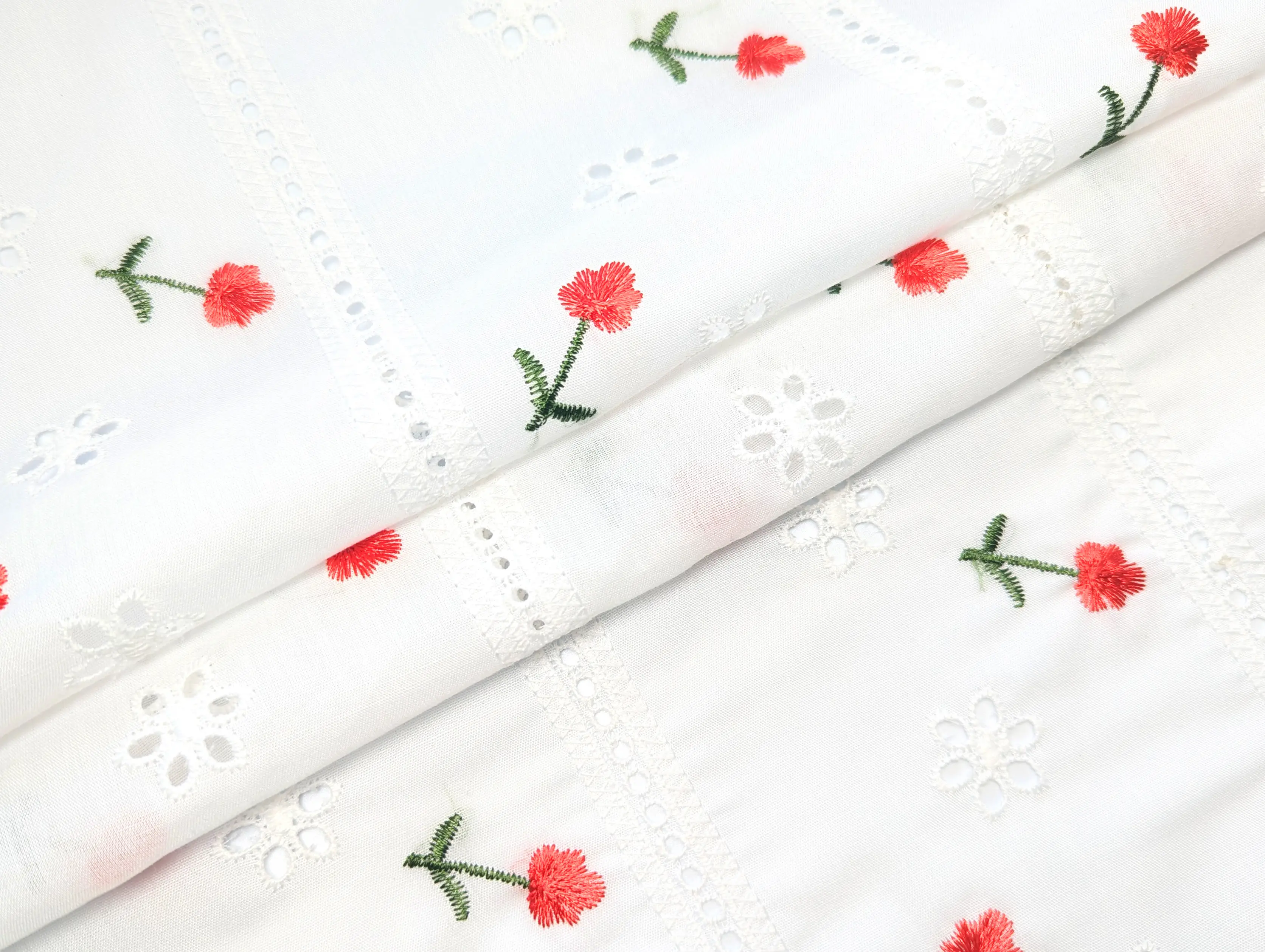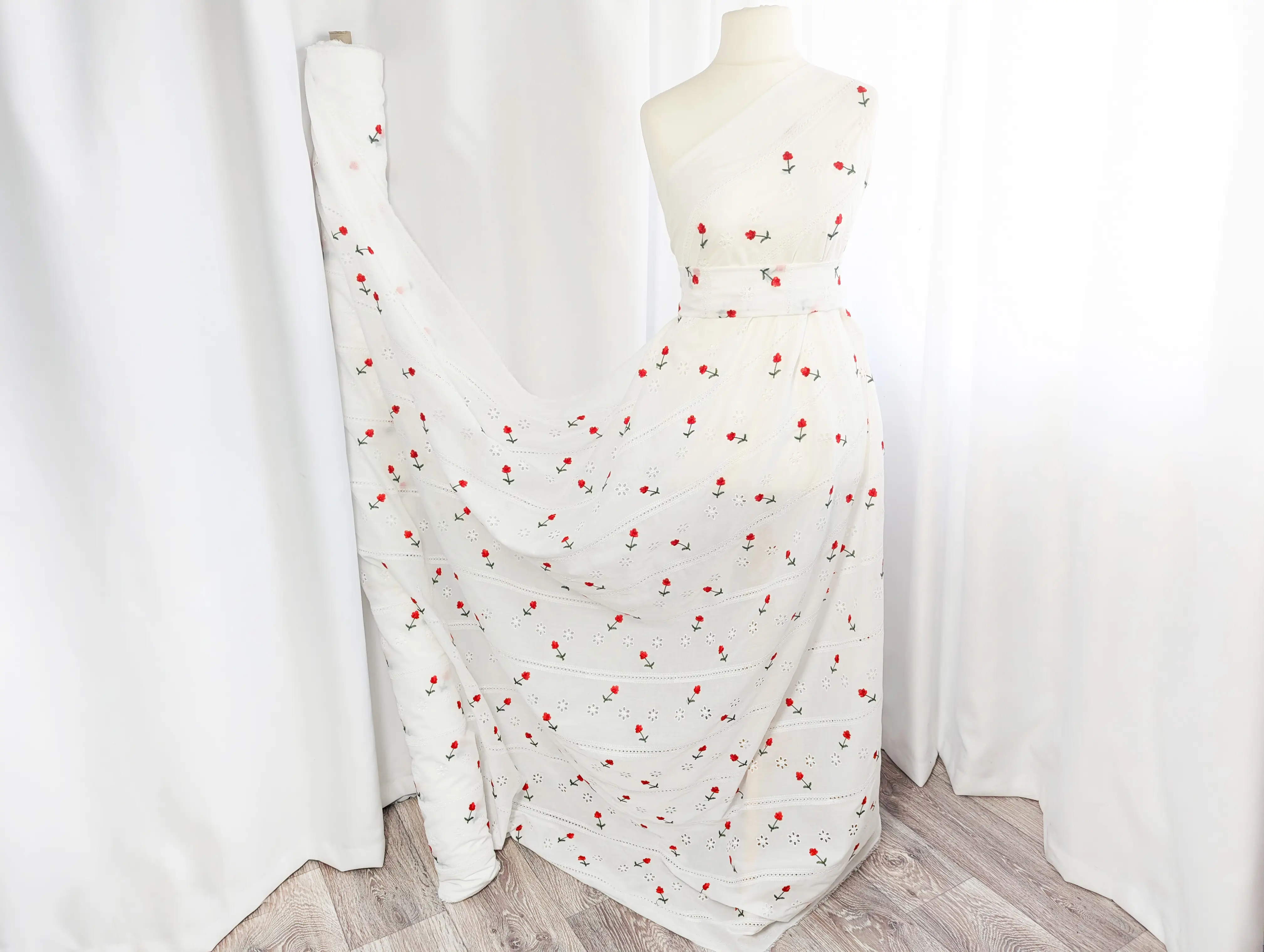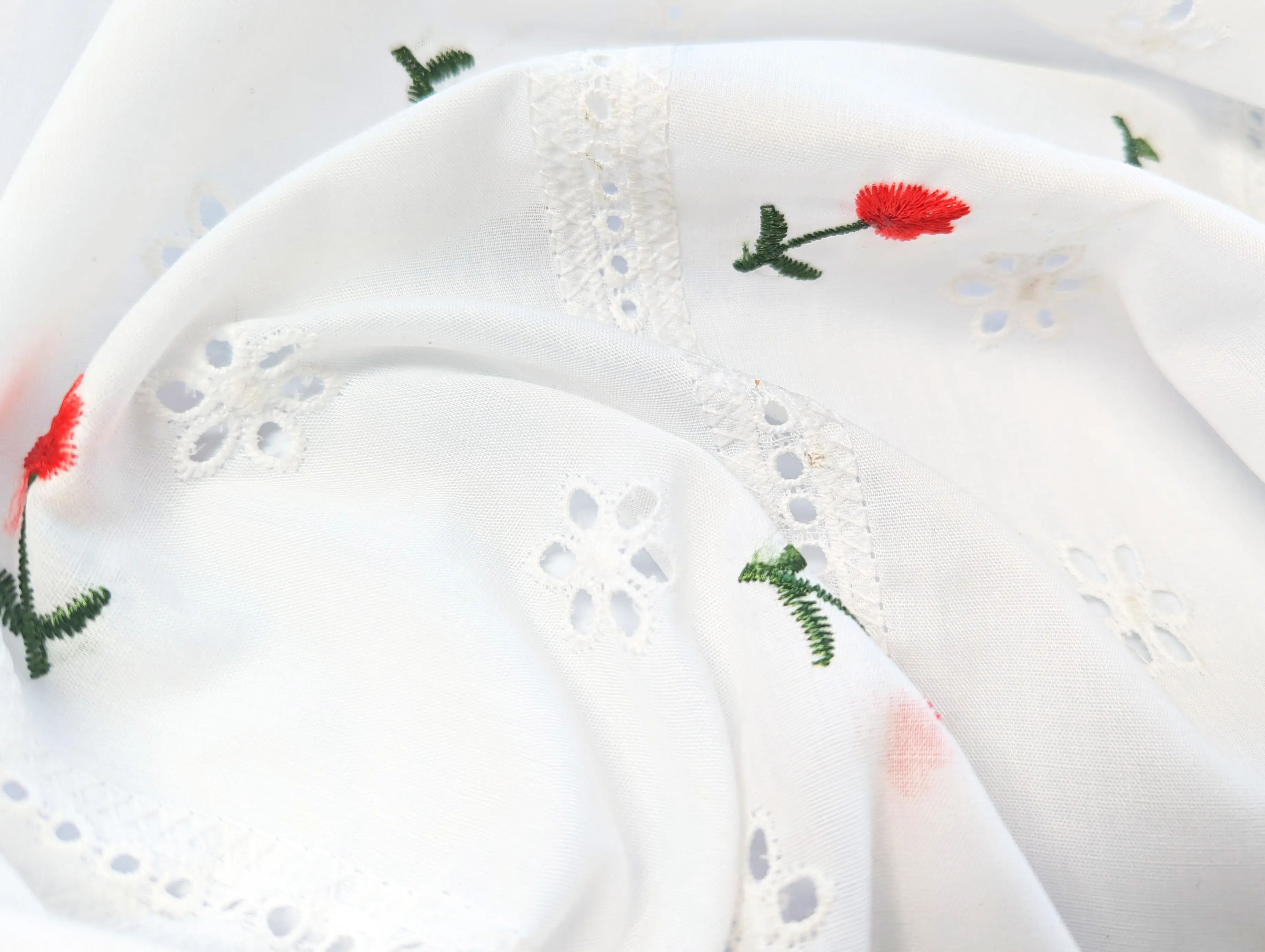 Котон вишивка – це легкий та тонкий матеріал, поверхня якого розшита квітковими мотивами та прикрашена фігурним прорізним малюнком у вигляді дірочок. Тканина без еластану, не зминається, при драпіруванні набуває повітряної стійкої форми. За рахунок наскрізної перфорації матеріал просвічує, тому для деяких виробів буде потрібна підкладка.