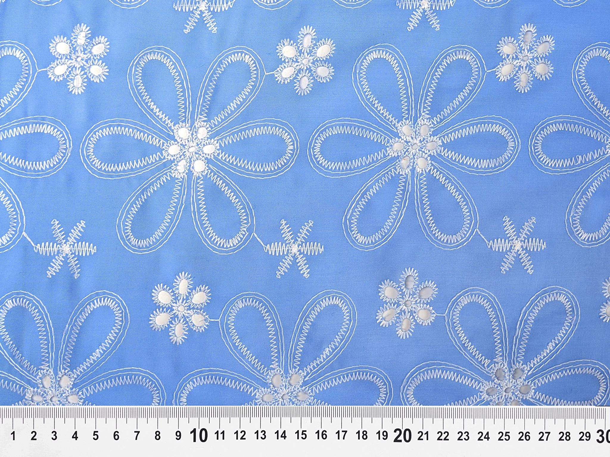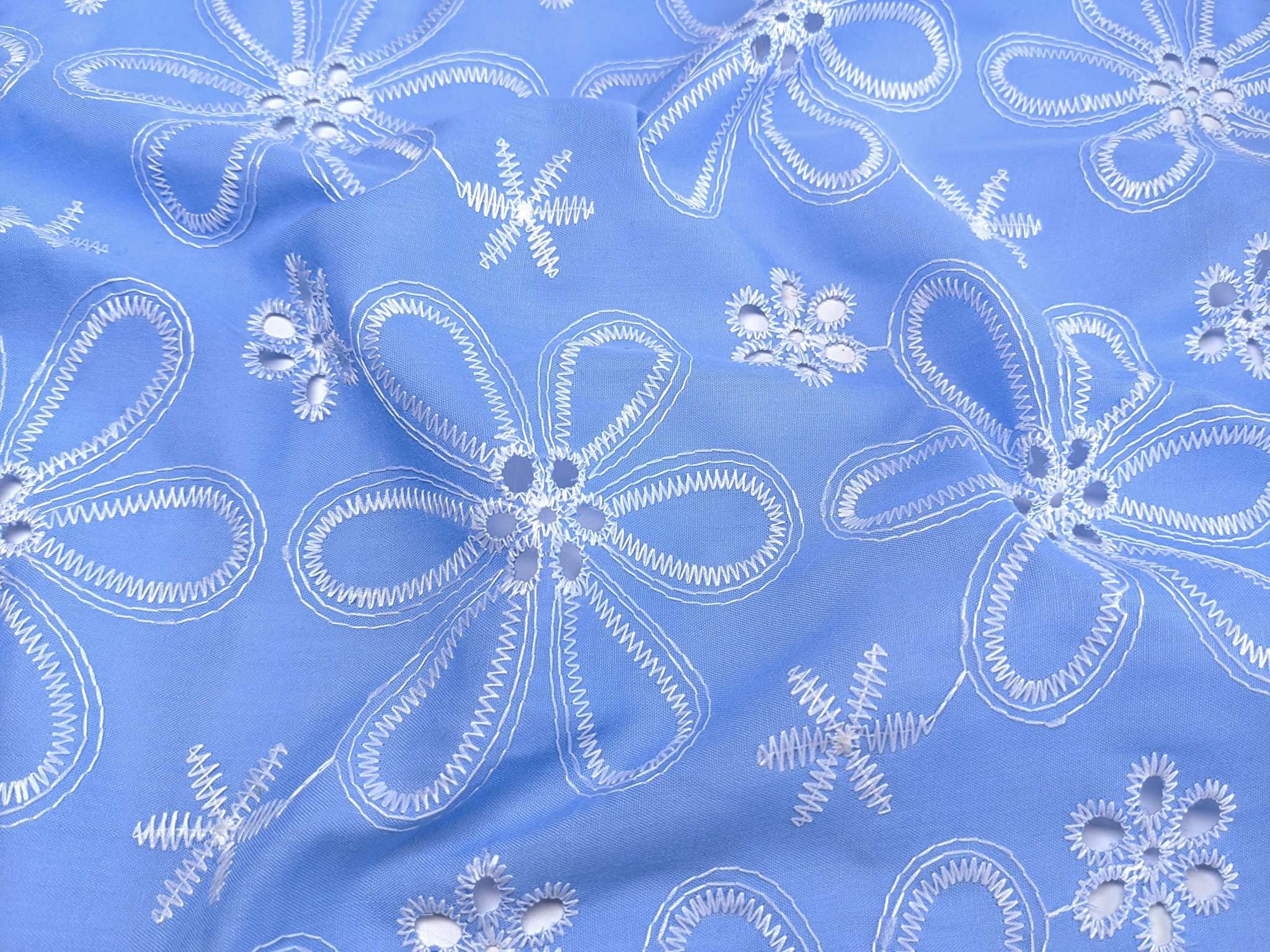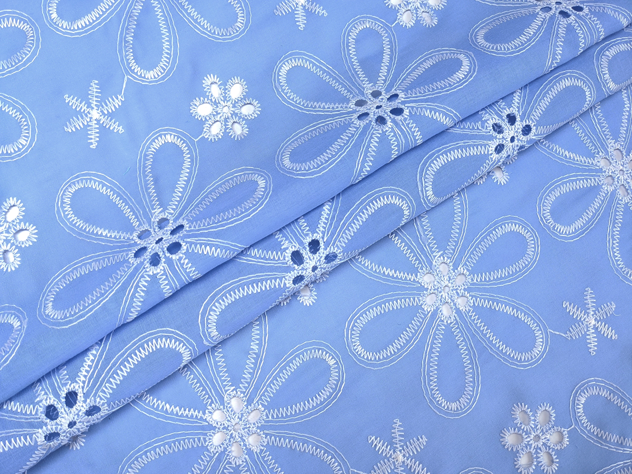Котон вишивка – це легкий та тонкий матеріал, поверхня якого розшита квітковими мотивами та прикрашена фігурним прорізним малюнком у вигляді дірочок. Тканина без еластану, не зминається, при драпіруванні набуває повітряної стійкої форми. За рахунок наскрізної перфорації матеріал просвічує, тому для деяких виробів буде потрібна підкладка.