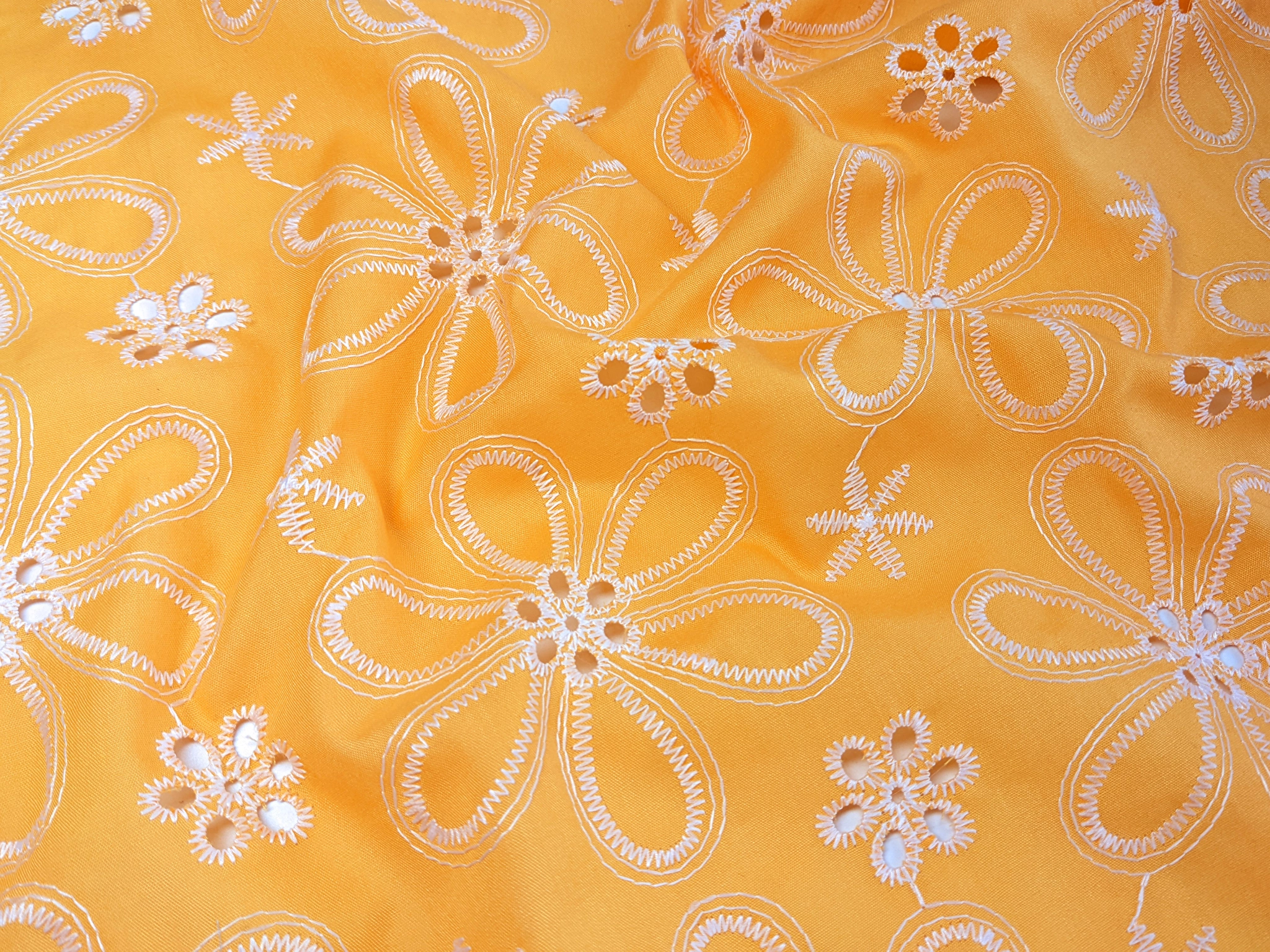 Котон вишивка – це легкий та тонкий матеріал, поверхня якого розшита квітковими мотивами та прикрашена фігурним прорізним малюнком у вигляді дірочок. Тканина без еластану, не зминається, при драпіруванні набуває повітряної стійкої форми. За рахунок наскрізної перфорації матеріал просвічує, тому для деяких виробів буде потрібна підкладка.
