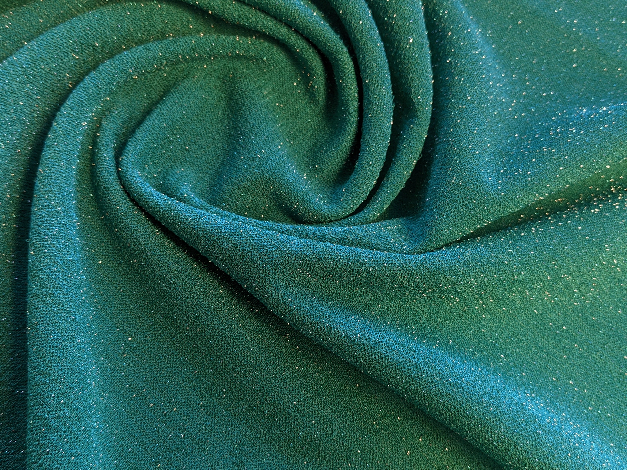Скуба твіл металік - це трикотажне полотно з легким блиском, завдяки якому тканина виглядає більш нарядно. Люрексові нитки вплетені в структуру полотна, лицьова сторона на дотик трохи шорстка, але при цьому виворіт гладкий і рівний. Полотно приємне до тіла, не колеться, не приносить дискомфорту, не вимагає підкладкової тканини. Скуба твил добре тягнеться поперек полотна.