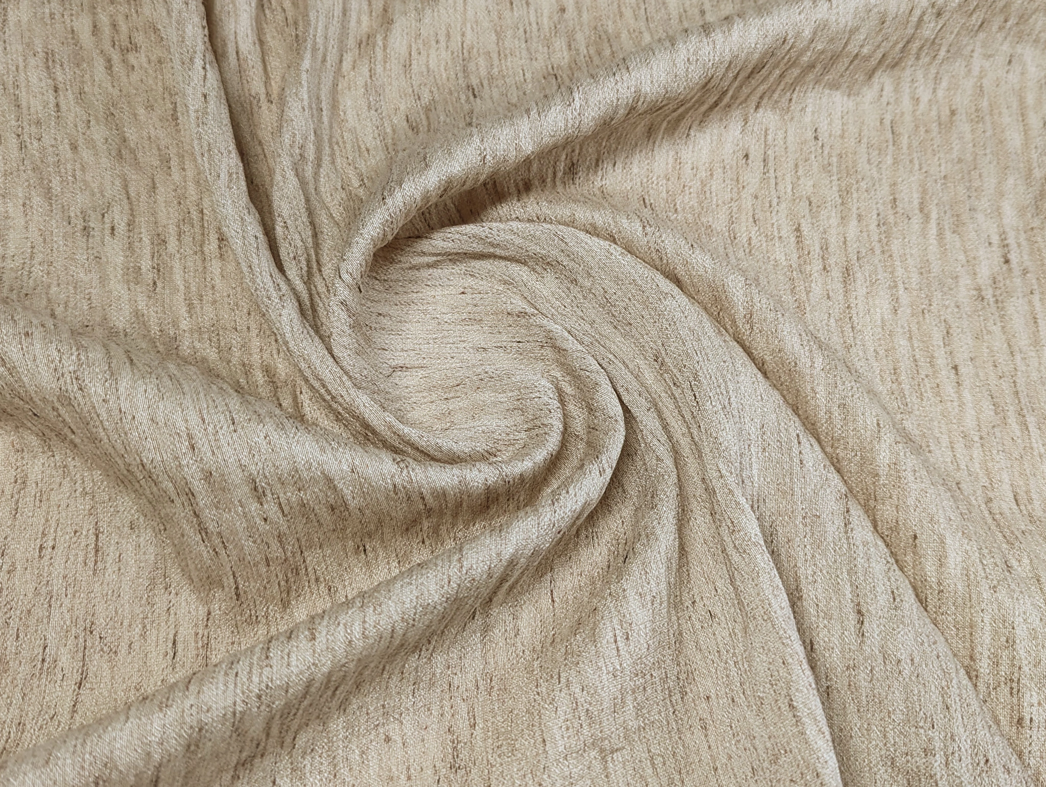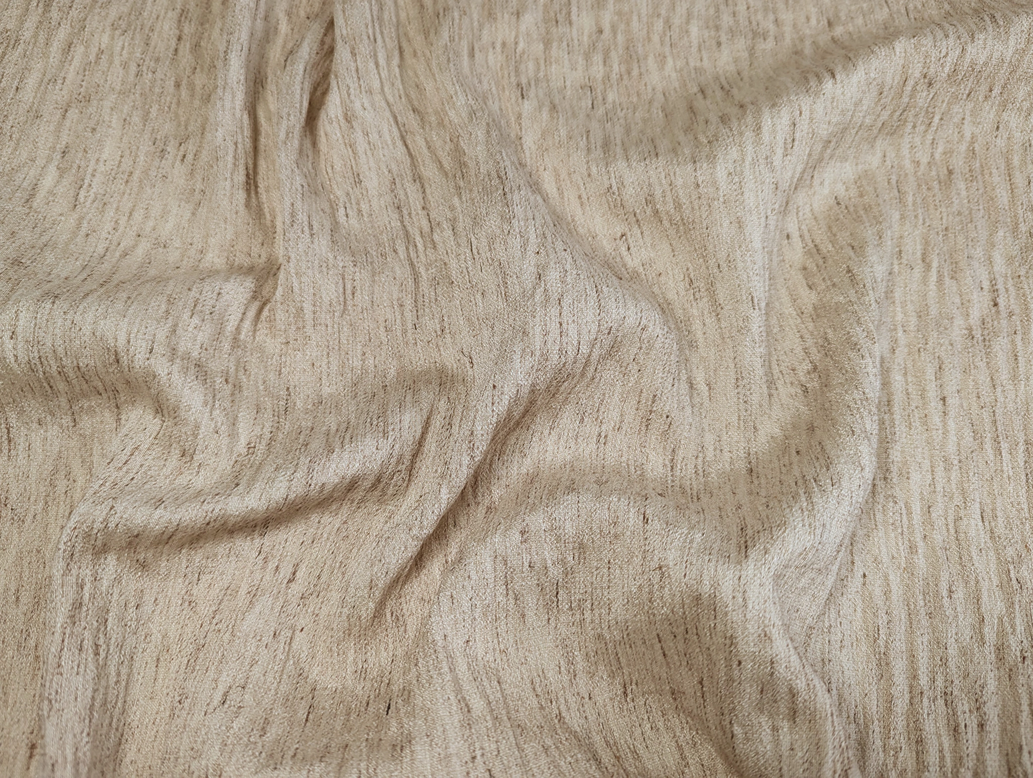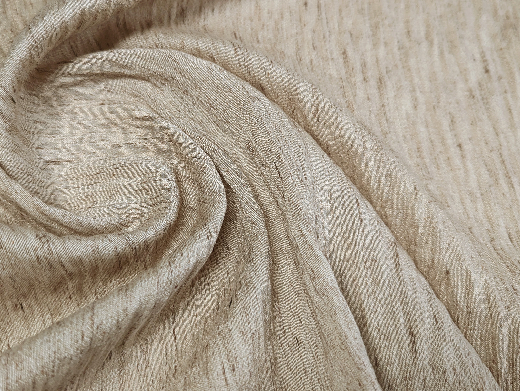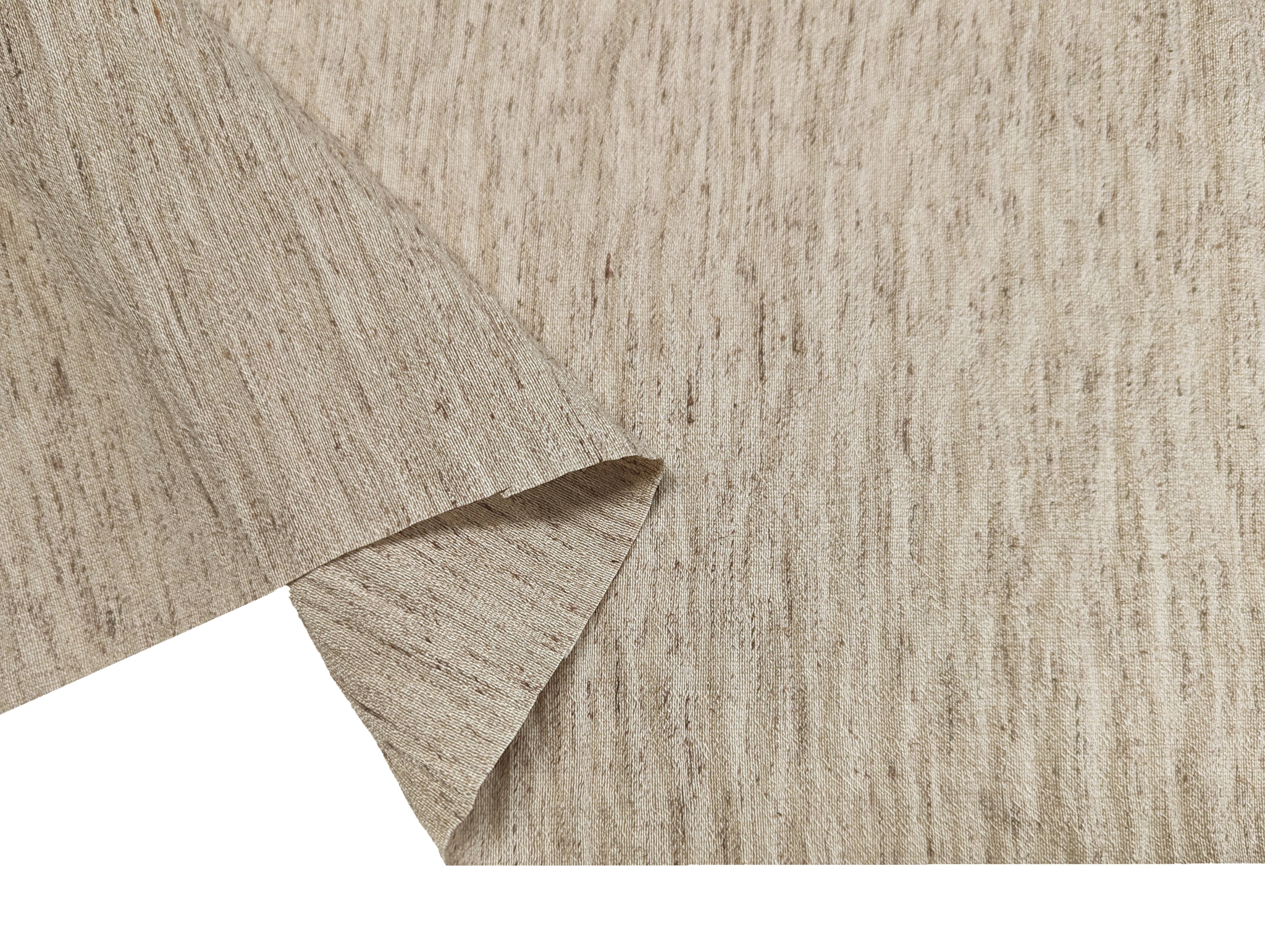 Льон жатка з нейлоном - сумішевий матеріал з ефектом жатої фактури, шорсткою поверхнею і меланжевим ефектом. Тканина м'яка і приємна на дотик, без стрейча, має легкий силуетний просвіт, злегка мнеться, під час драпірування зберігає форму складок.