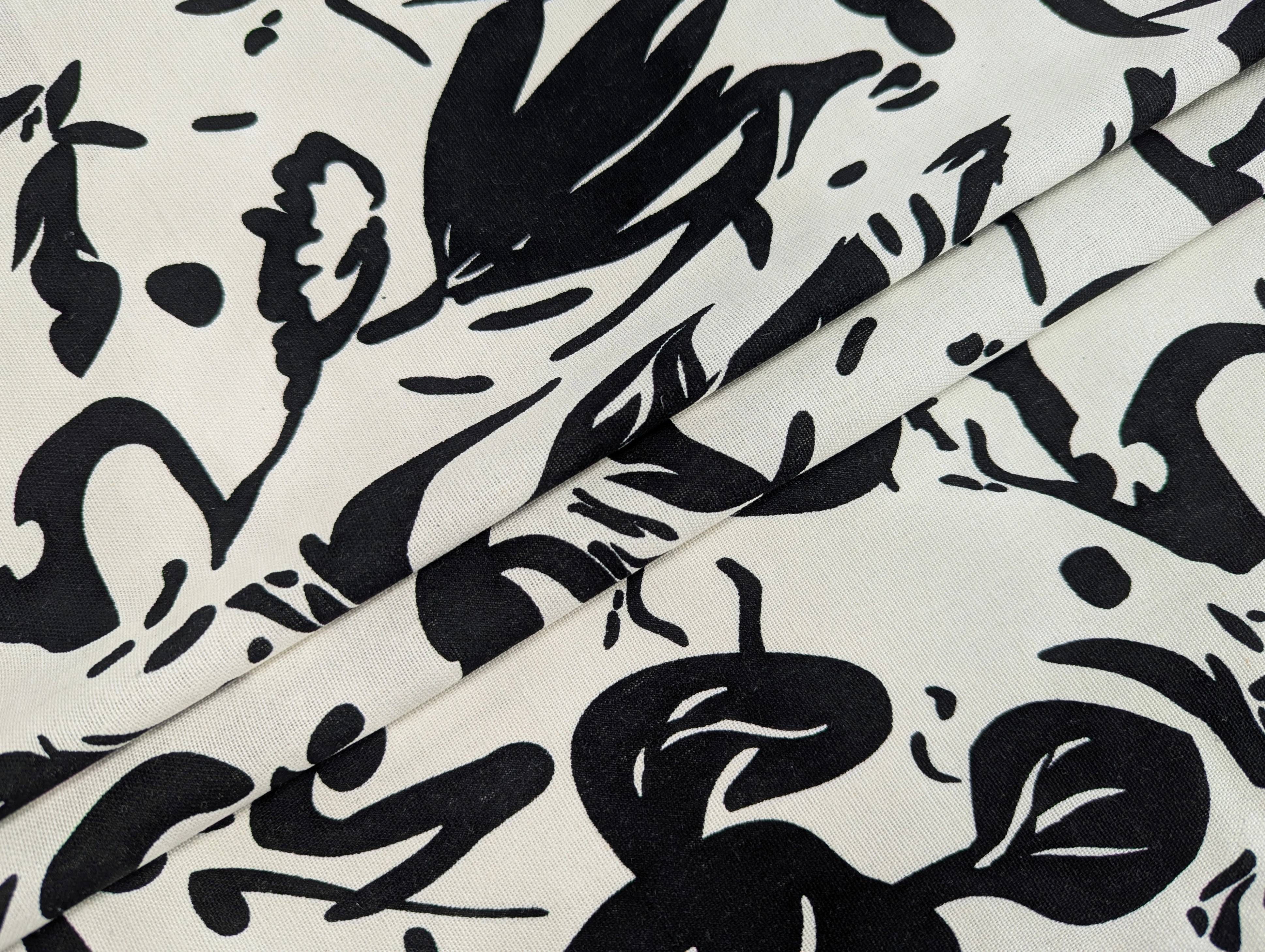Льон з віскозою квіткова абстракція, молочний з чорним